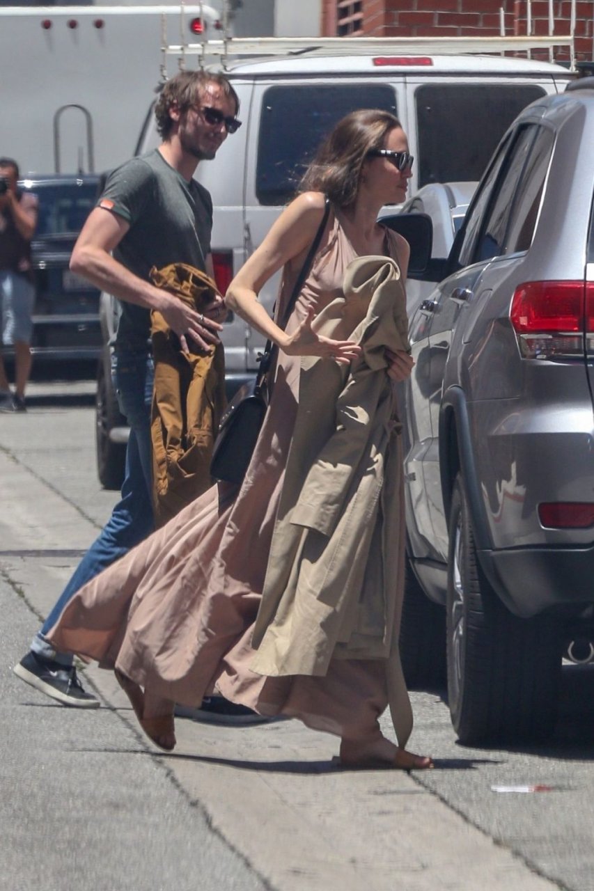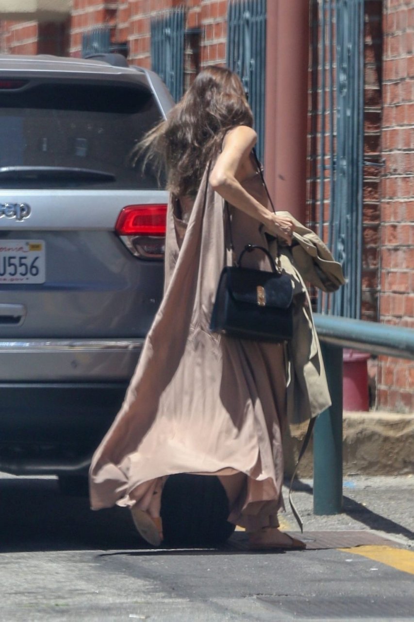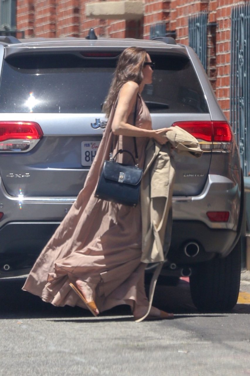 Angelina Jolie est à Beverly Hills en visite dans une clinique, portant une robe couleur nude et des lunettes de soleil noires, 01/07/2019. La star de 44 ans a une assistante qui porte son manteau pour elle.