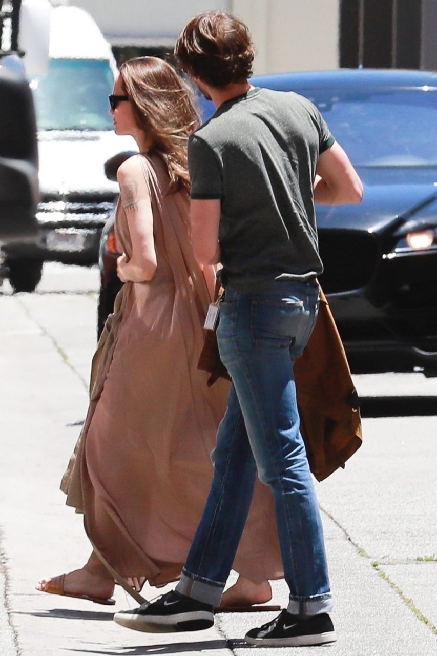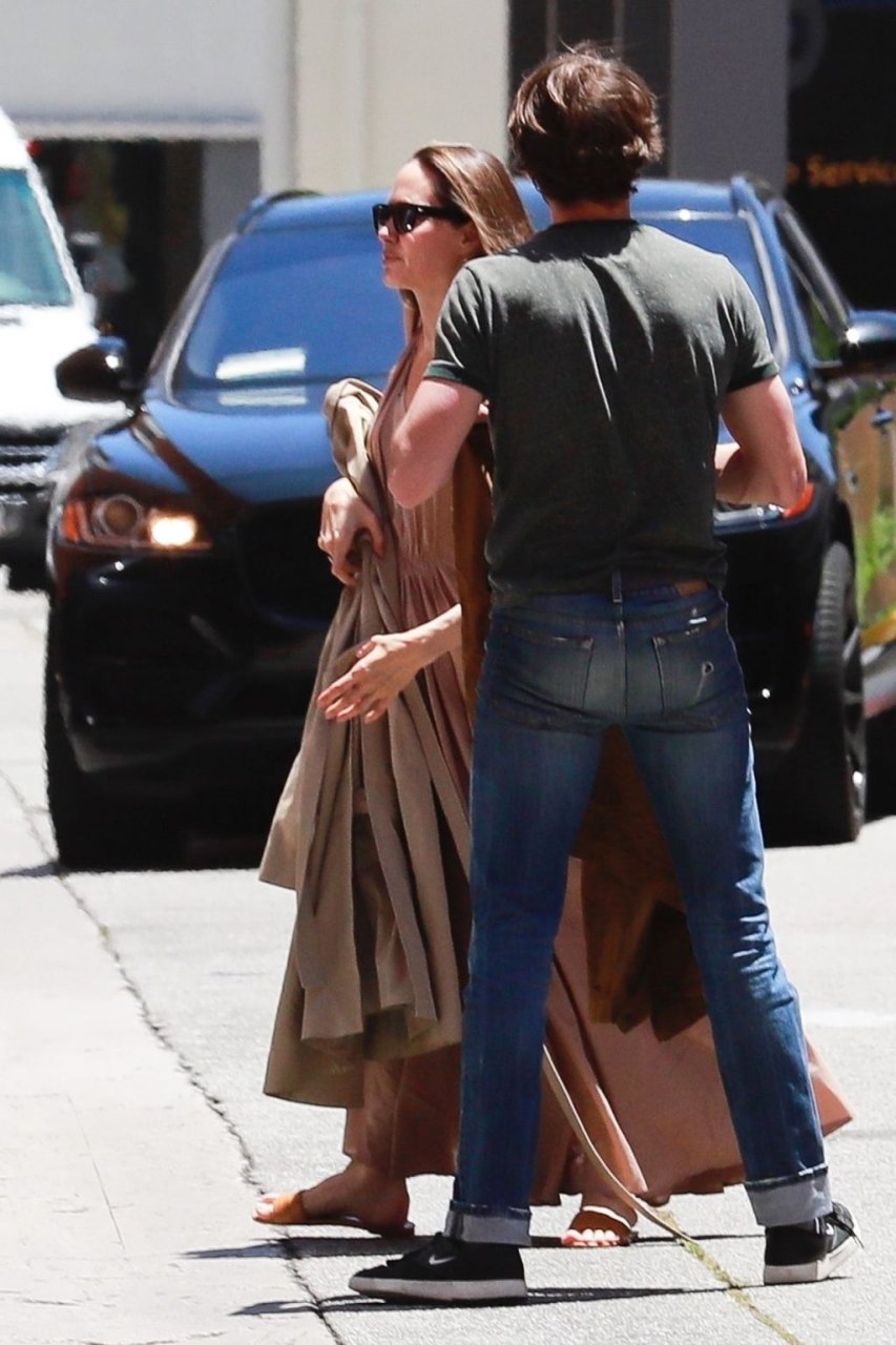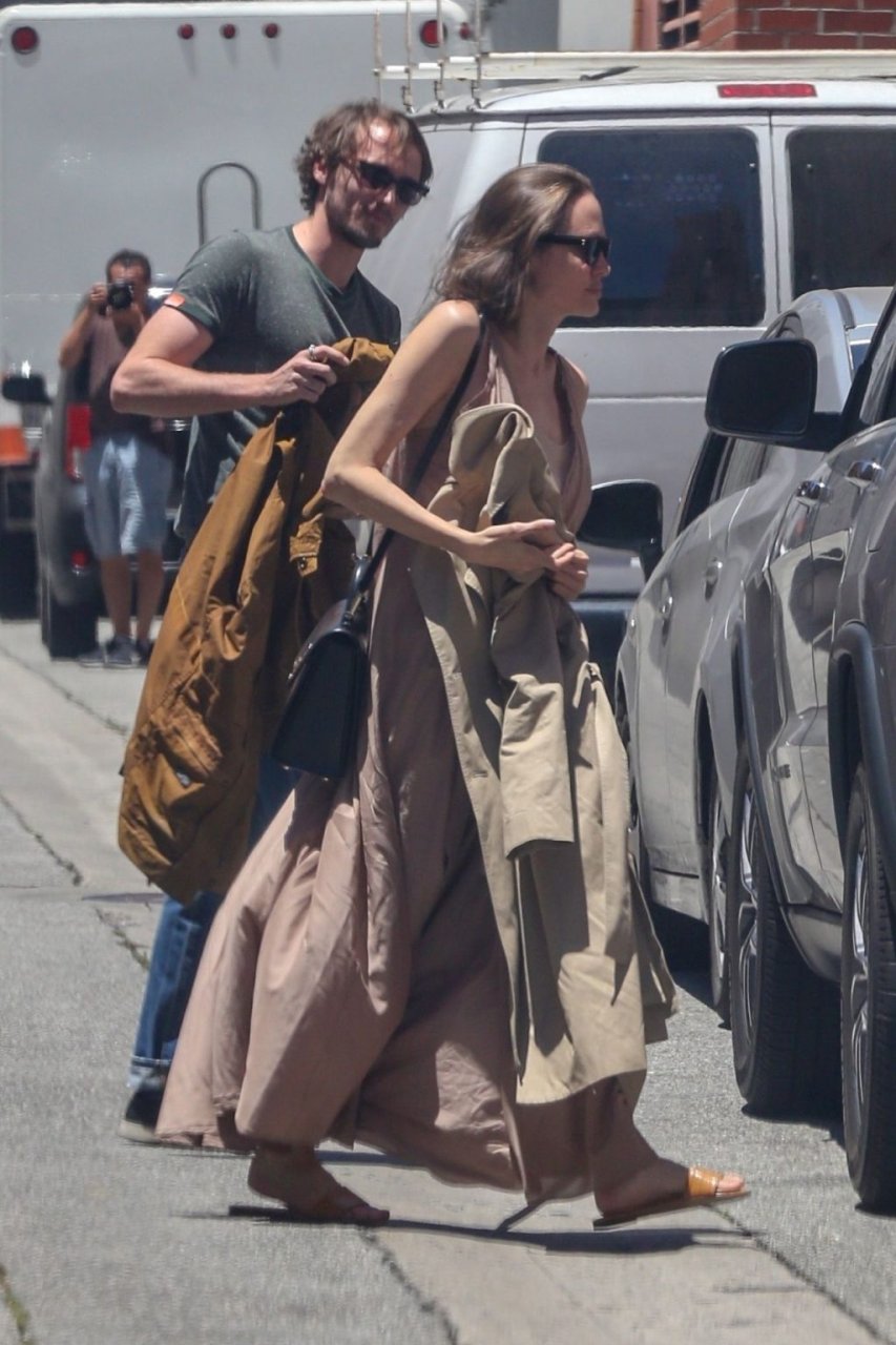Angelina Jolie est à Beverly Hills en visite dans une clinique, portant une robe couleur nude et des lunettes de soleil noires, 01/07/2019. La star de 44 ans a une assistante qui porte son manteau pour elle.