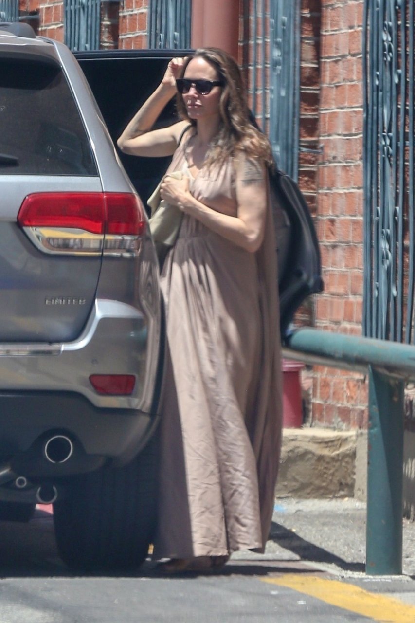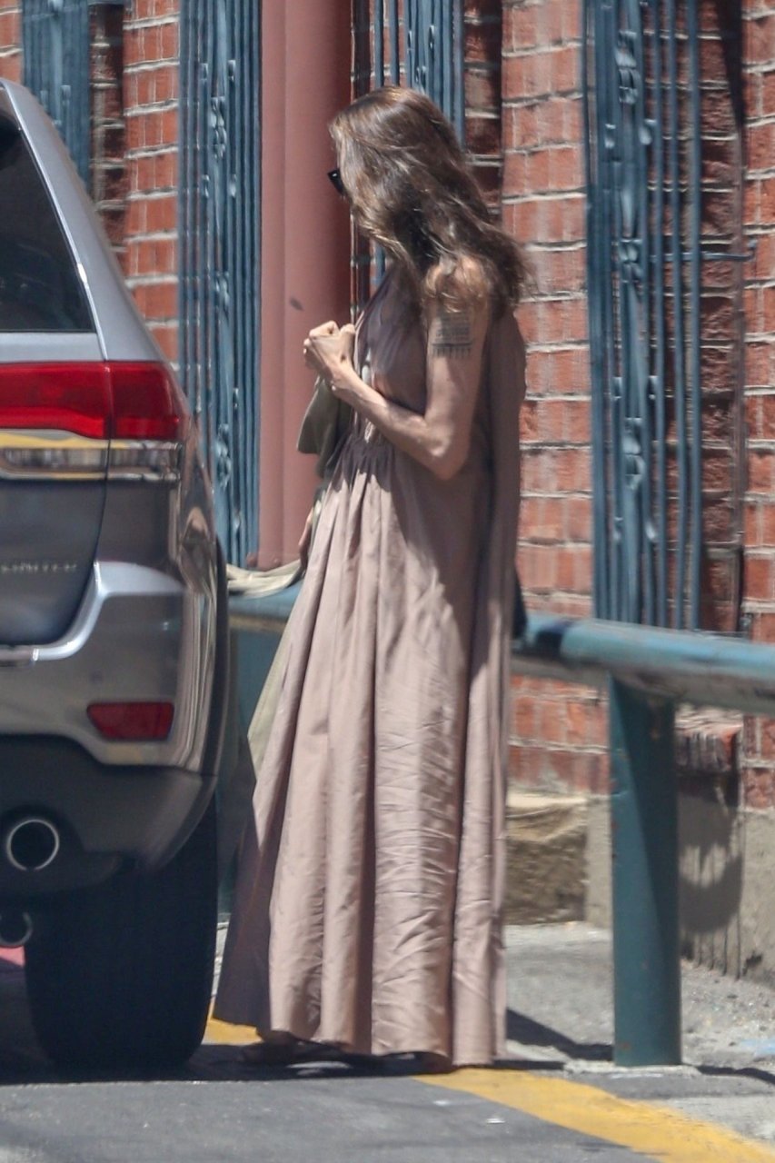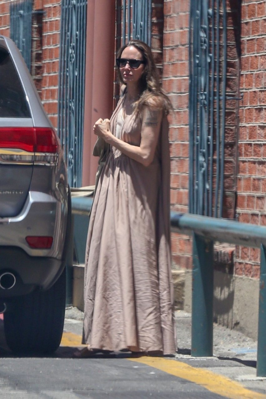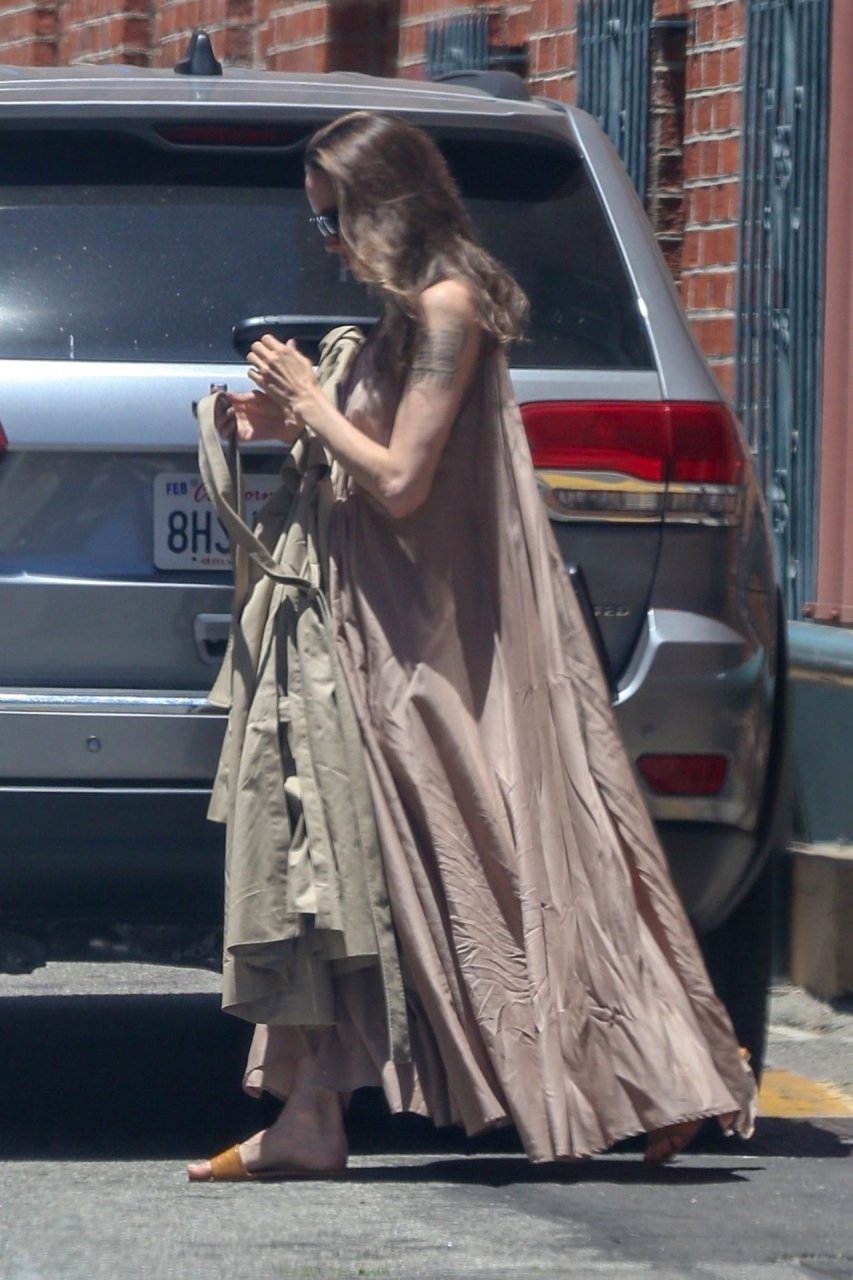 Angelina Jolie est à Beverly Hills en visite dans une clinique, portant une robe couleur nude et des lunettes de soleil noires, 01/07/2019. La star de 44 ans a une assistante qui porte son manteau pour elle.