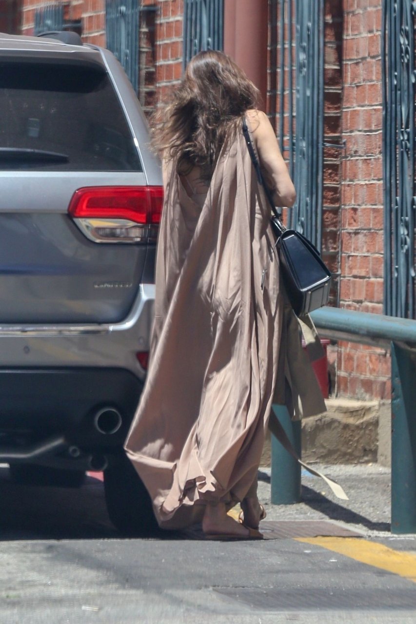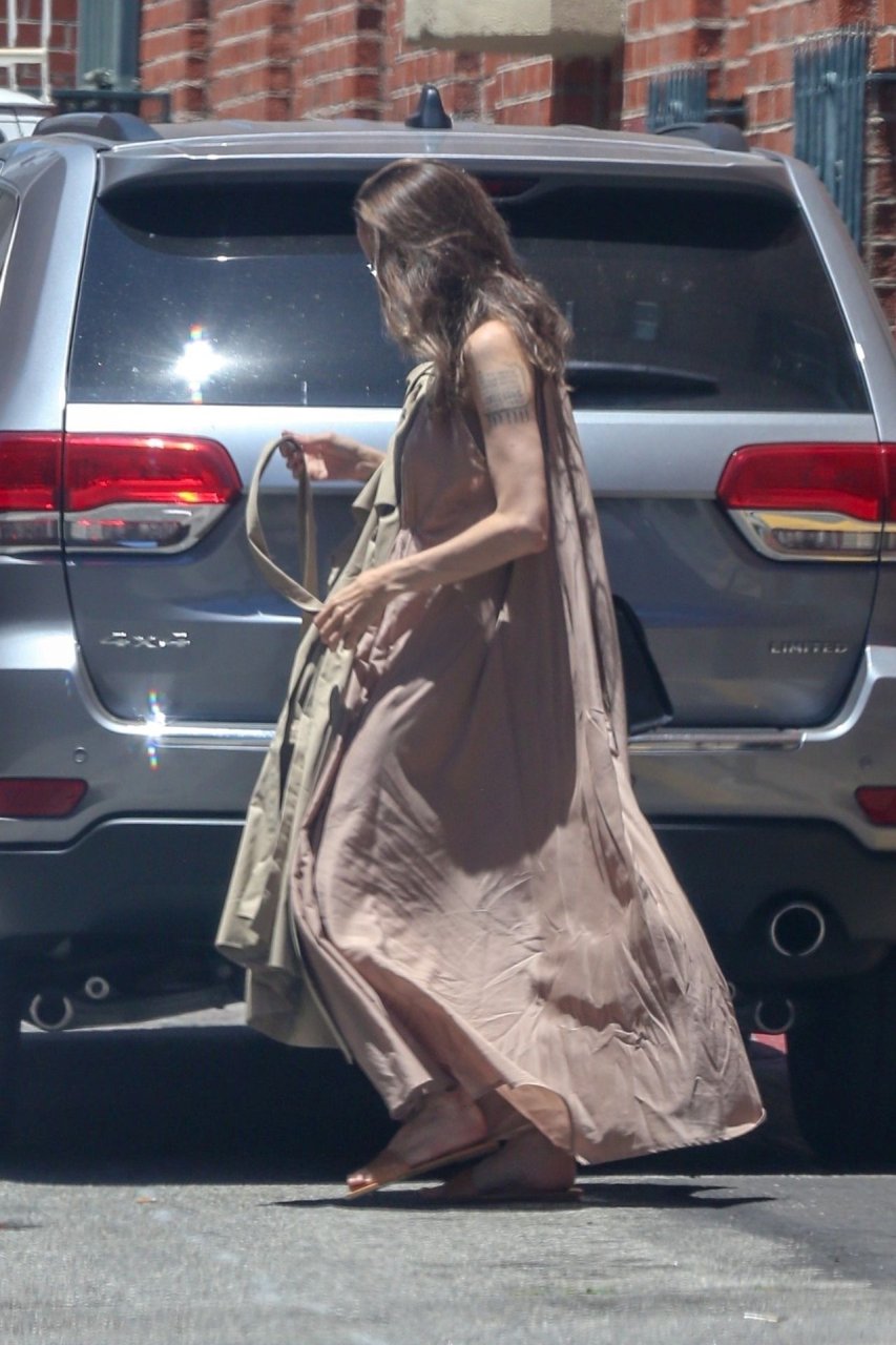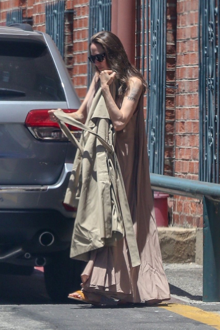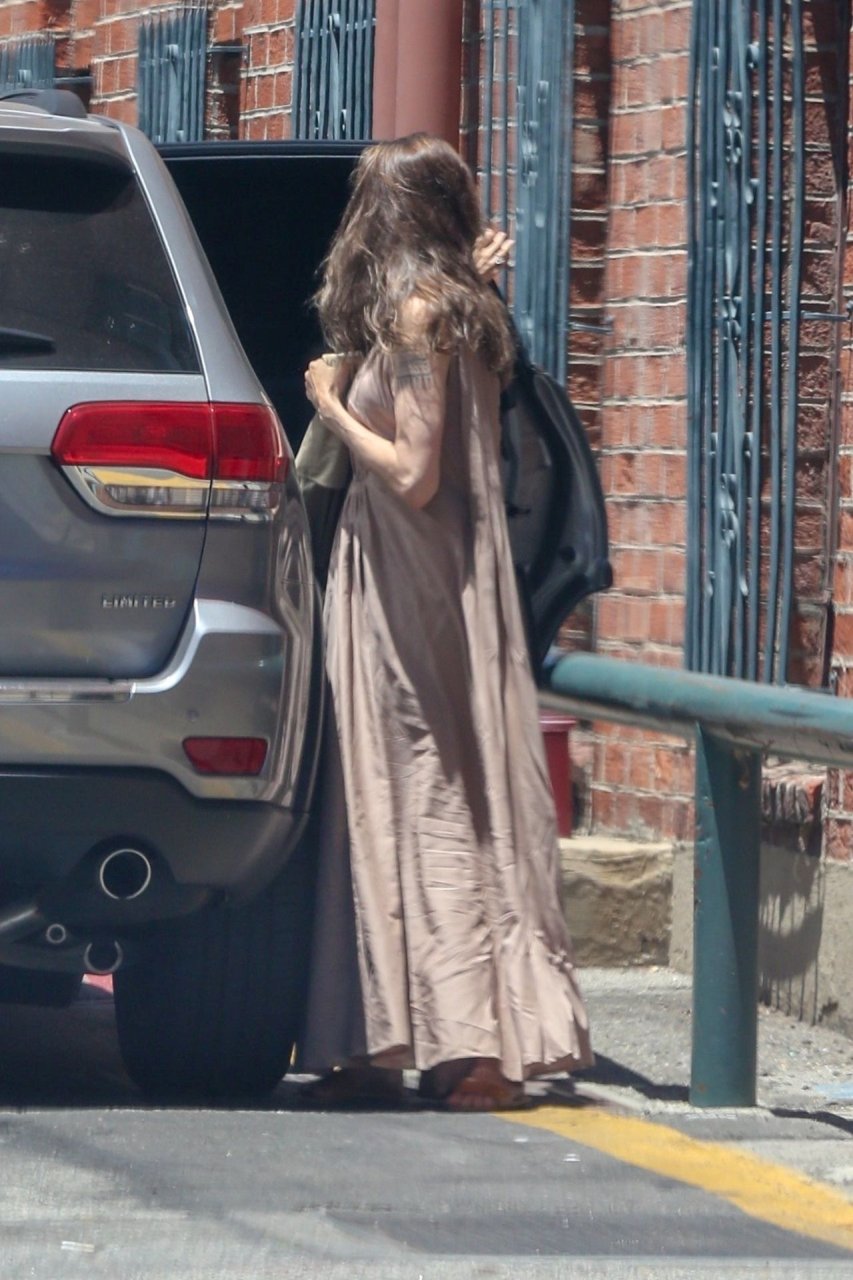 Angelina Jolie est à Beverly Hills en visite dans une clinique, portant une robe couleur nude et des lunettes de soleil noires, 01/07/2019. La star de 44 ans a une assistante qui porte son manteau pour elle.