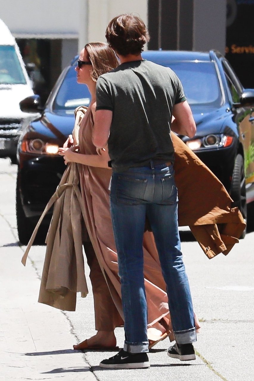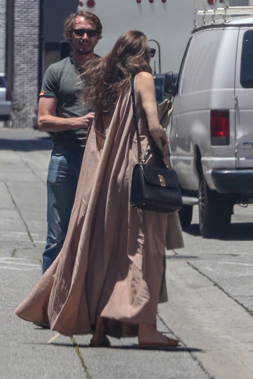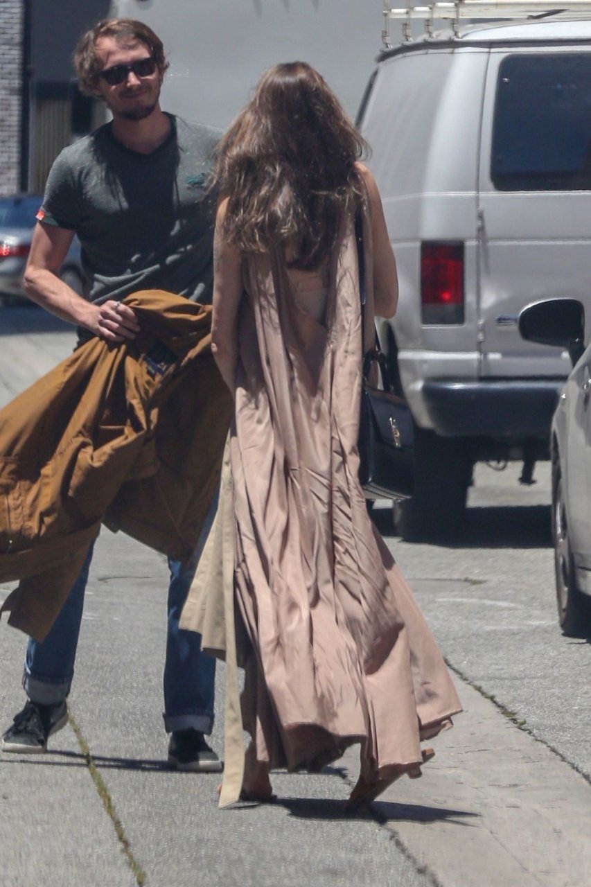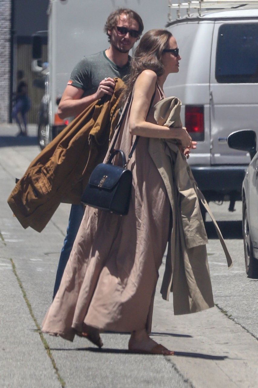 Angelina Jolie est à Beverly Hills en visite dans une clinique, portant une robe couleur nude et des lunettes de soleil noires, 01/07/2019. La star de 44 ans a une assistante qui porte son manteau pour elle.