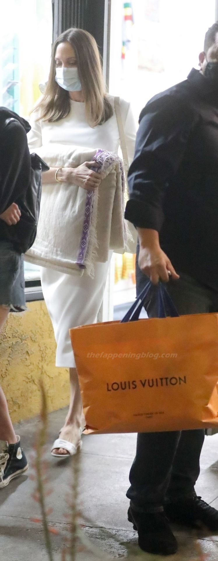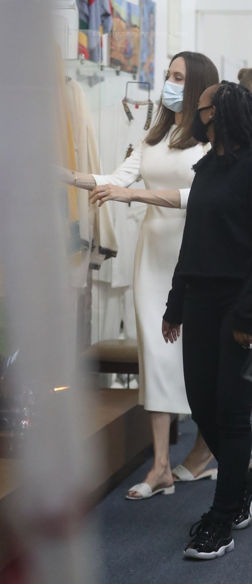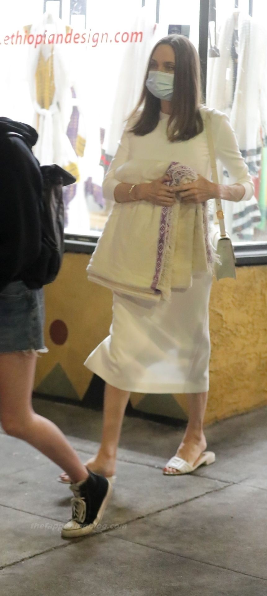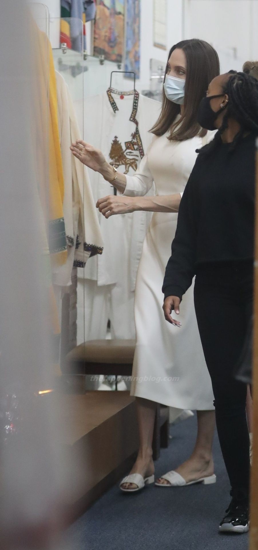Angelina Jolie a été aperçue sans soutien-gorge en train de faire du shopping dans une boutique éthiopienne avec ses deux filles Zahara et Vivienne à Los Angeles, le 01/08/2021.