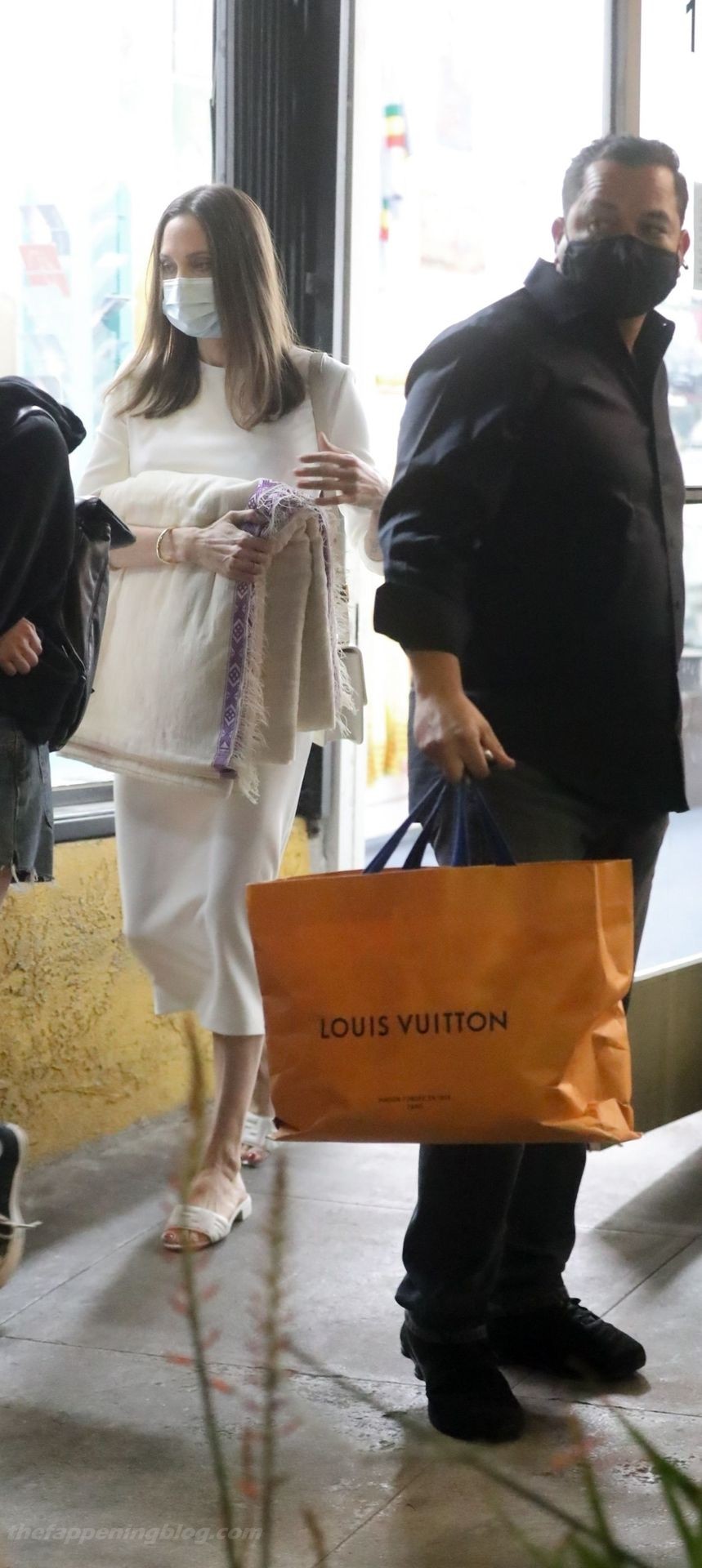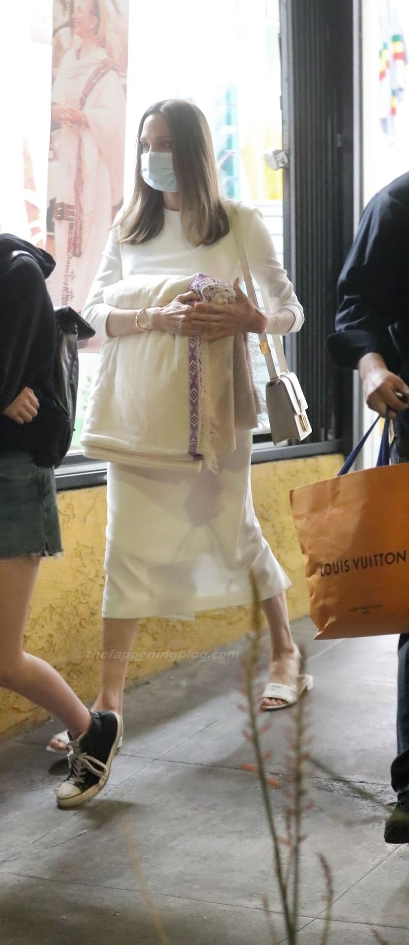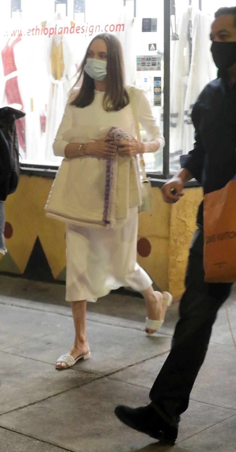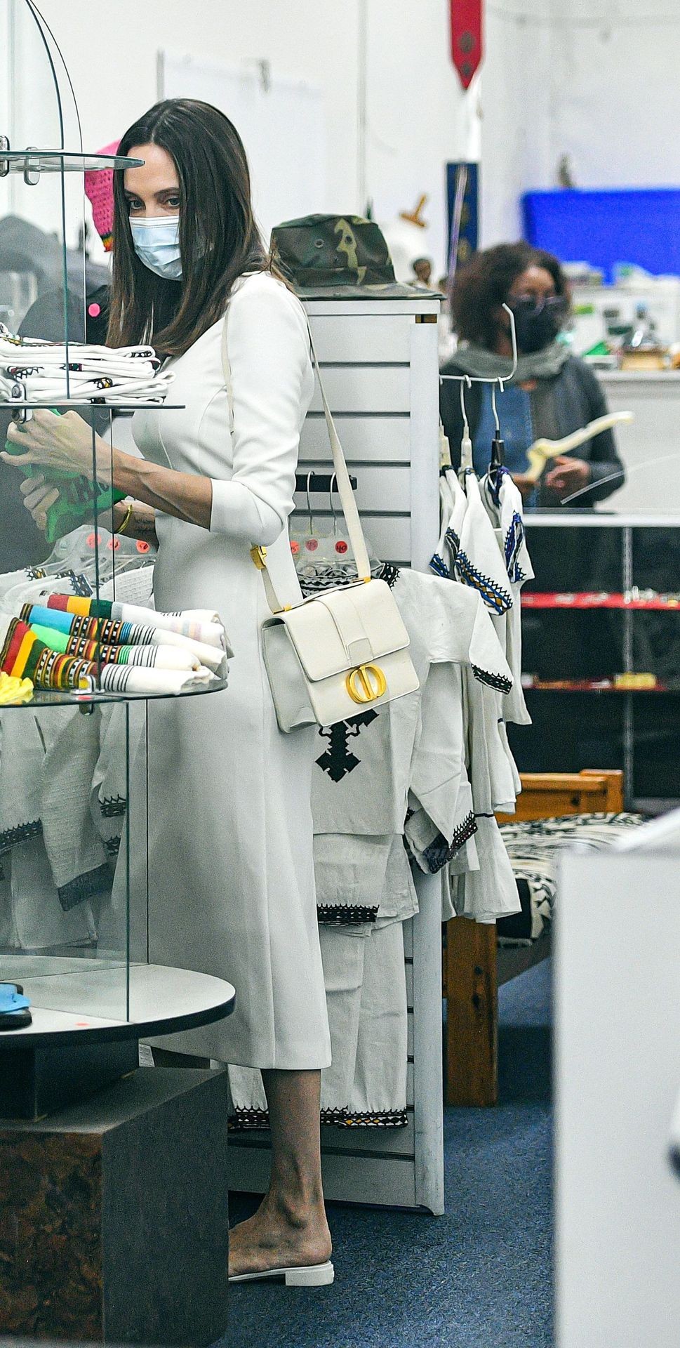 Angelina Jolie a été aperçue sans soutien-gorge en train de faire du shopping dans une boutique éthiopienne avec ses deux filles Zahara et Vivienne à Los Angeles, le 01/08/2021.