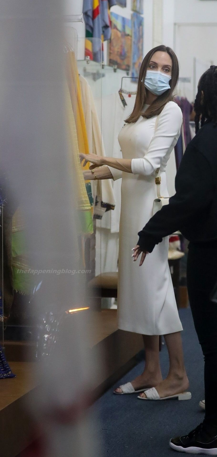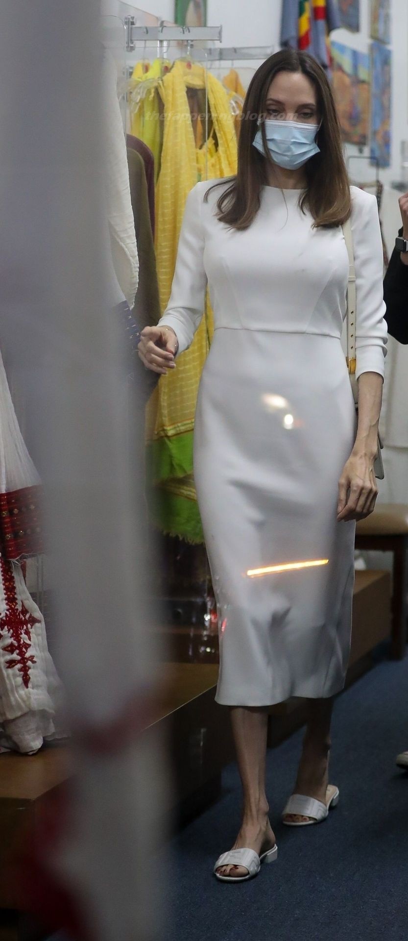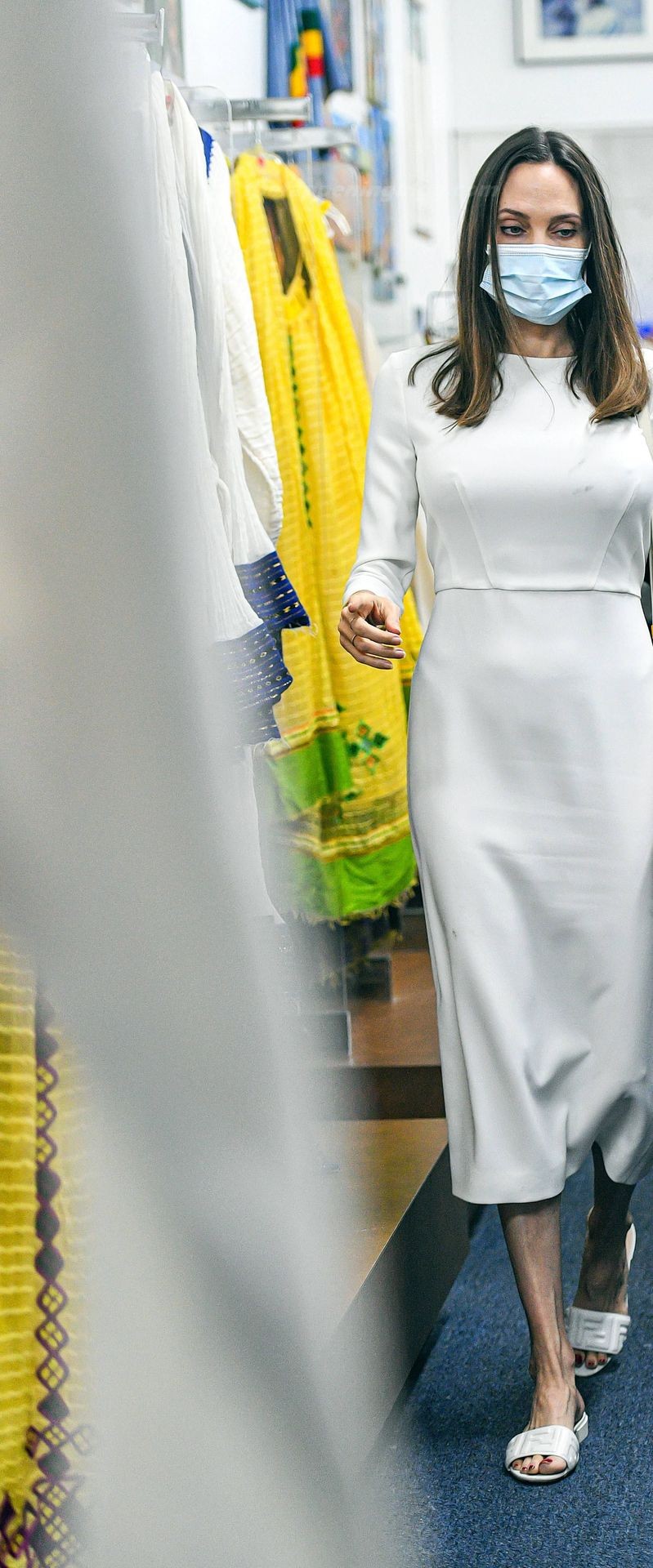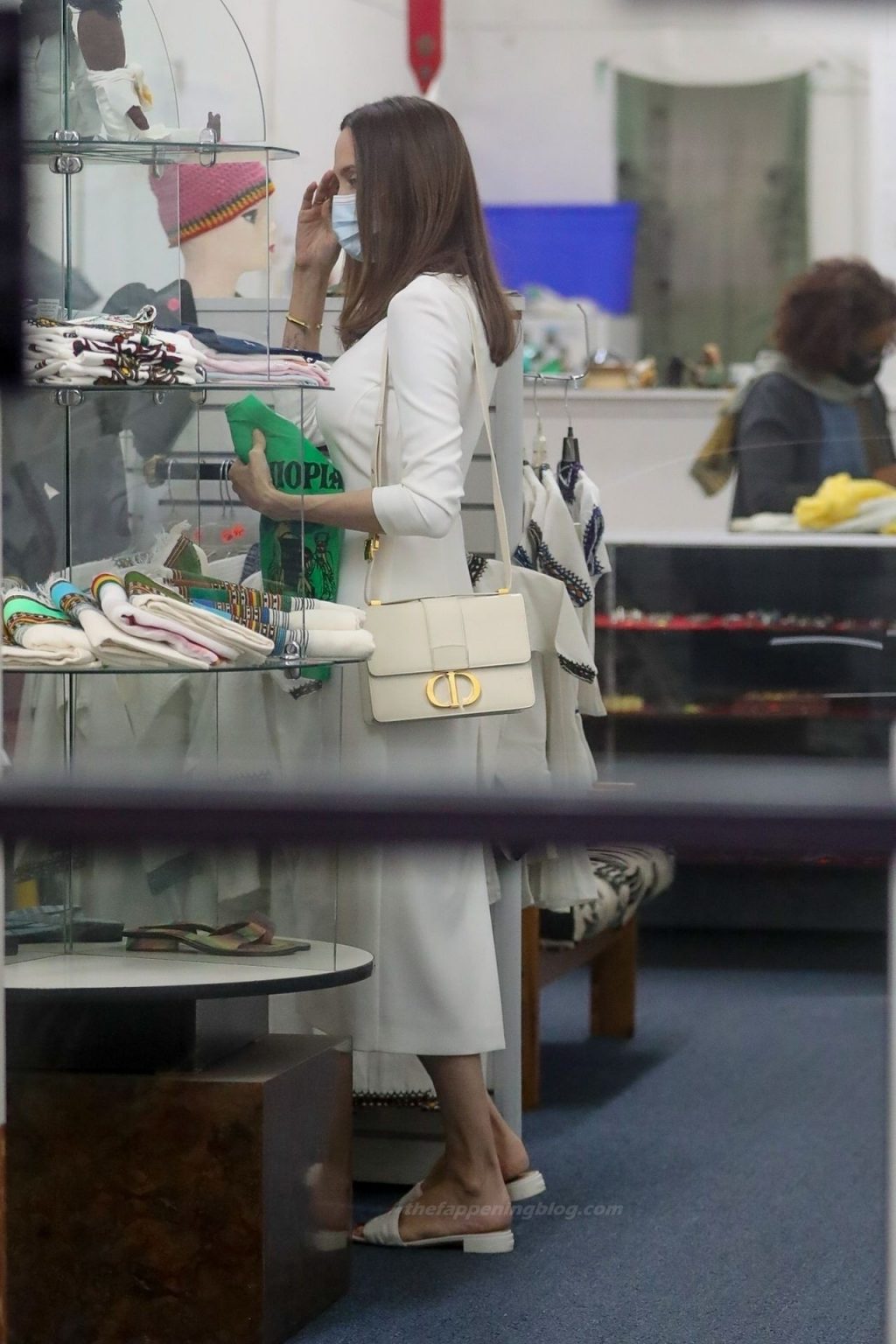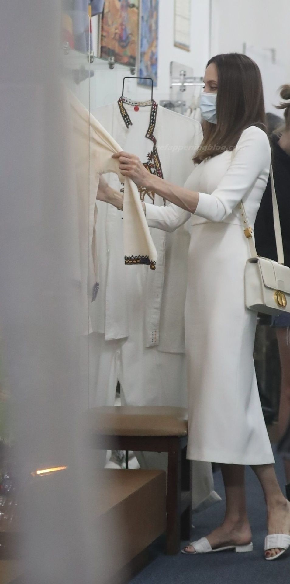Angelina Jolie a été aperçue sans soutien-gorge en train de faire du shopping dans une boutique éthiopienne avec ses deux filles Zahara et Vivienne à Los Angeles, le 01/08/2021.