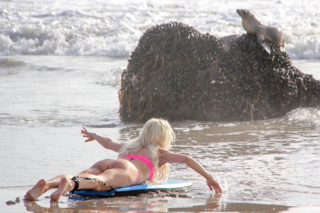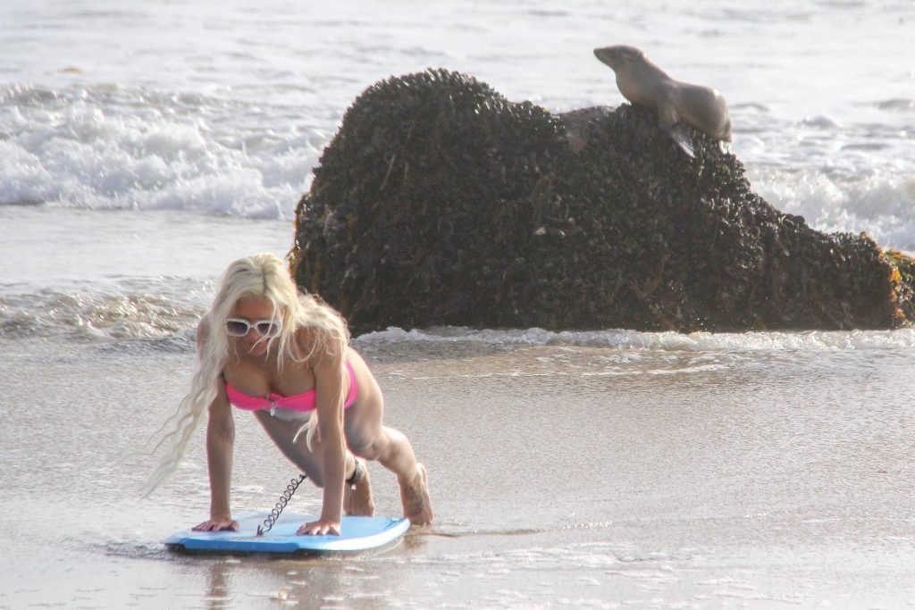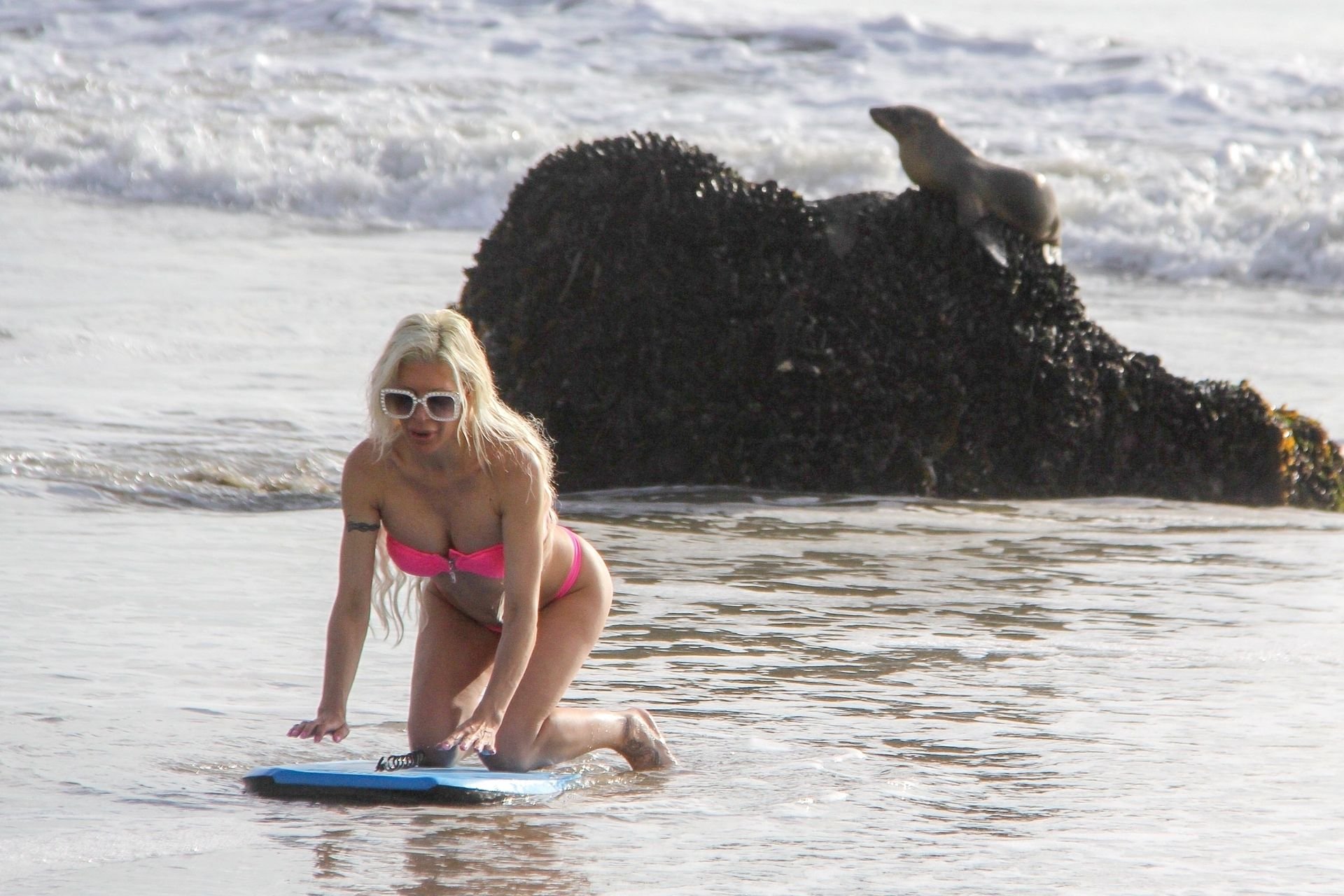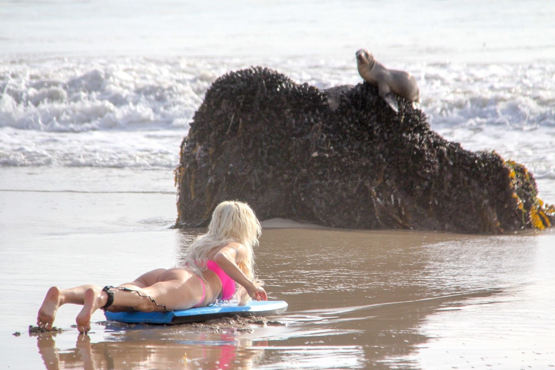 Blonde Angelique “Frenchy” Morgan a été vue en bikini rose sur la plage de Malibu montrant ses compétences en bodyboard, 01/03/2019.