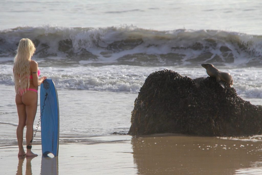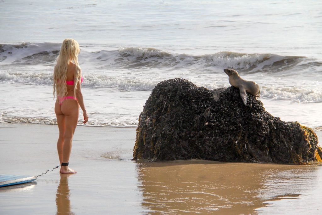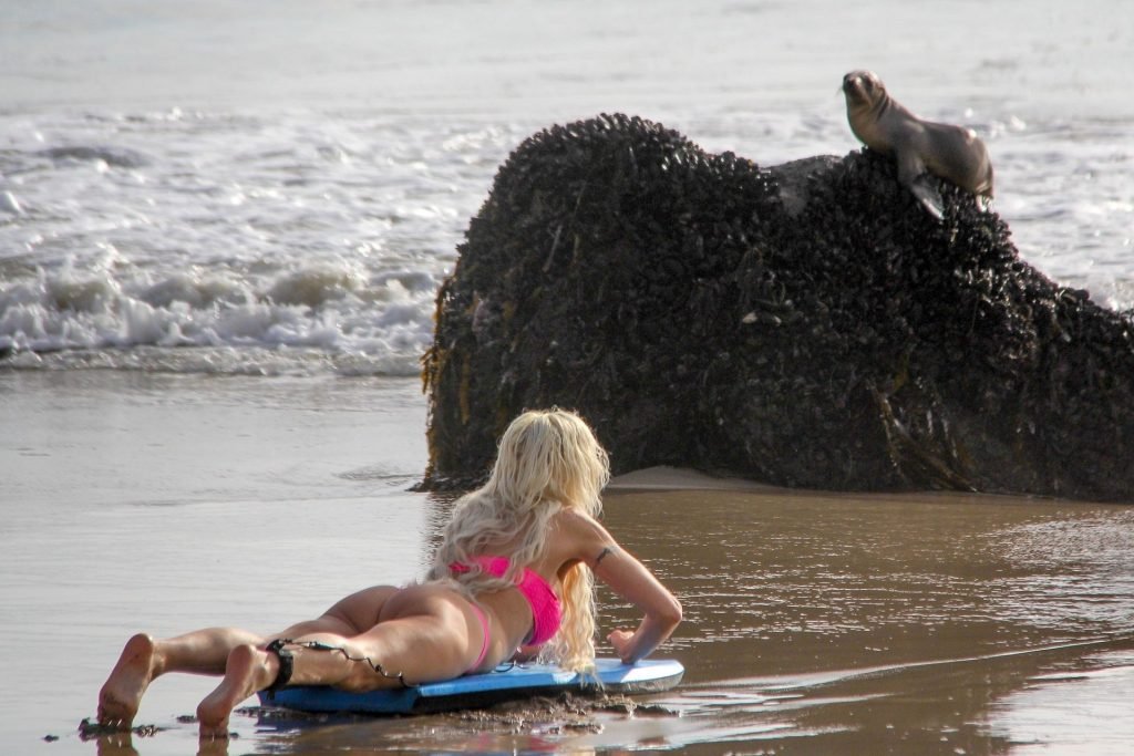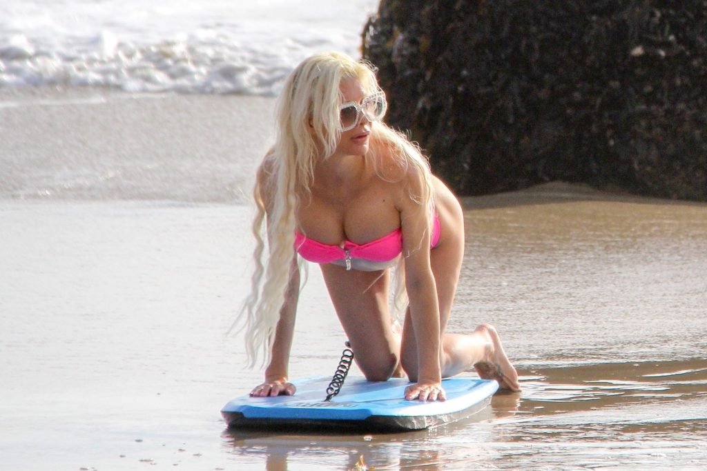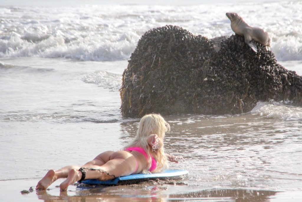 Blonde Angelique “Frenchy” Morgan a été vue en bikini rose sur la plage de Malibu montrant ses compétences en bodyboard, 01/03/2019.