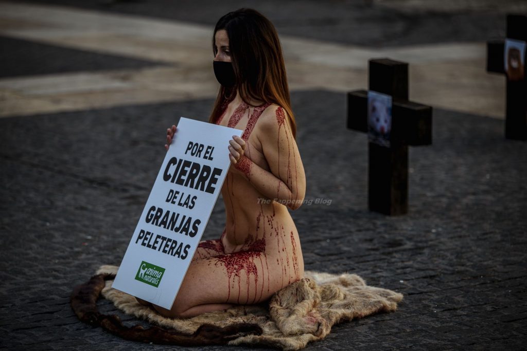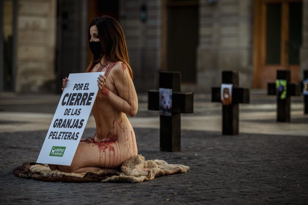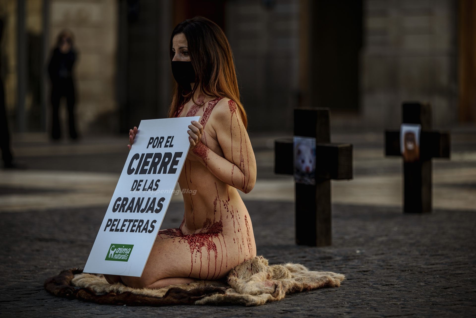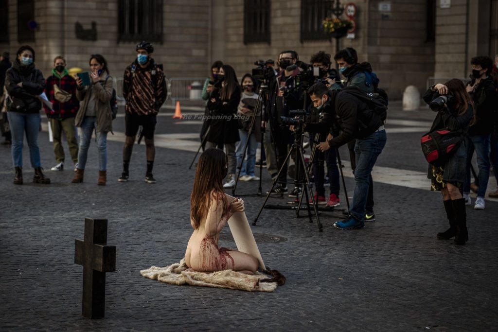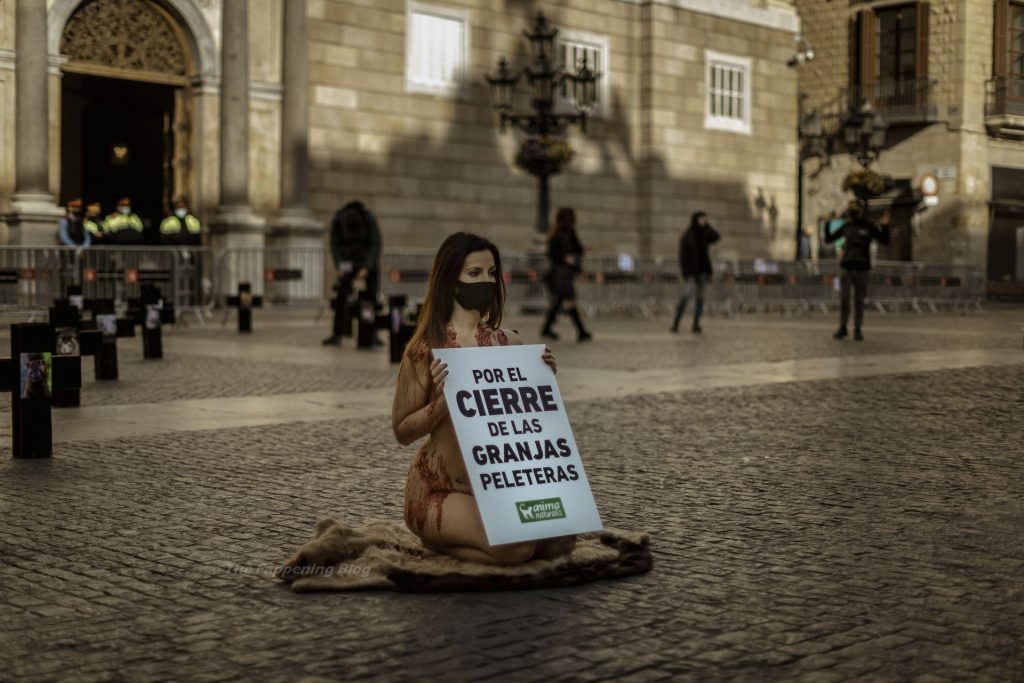Un militant des droits des animaux nu, couvert de faux sang, exige la fermeture des fermes de fourrure devant la presse réunie lors d’une manifestation pour les droits des animaux organisée à Barcelone, le 21/01/2021.