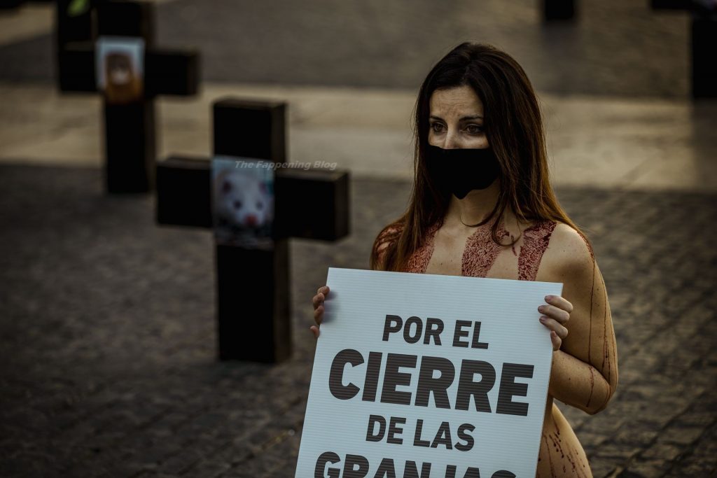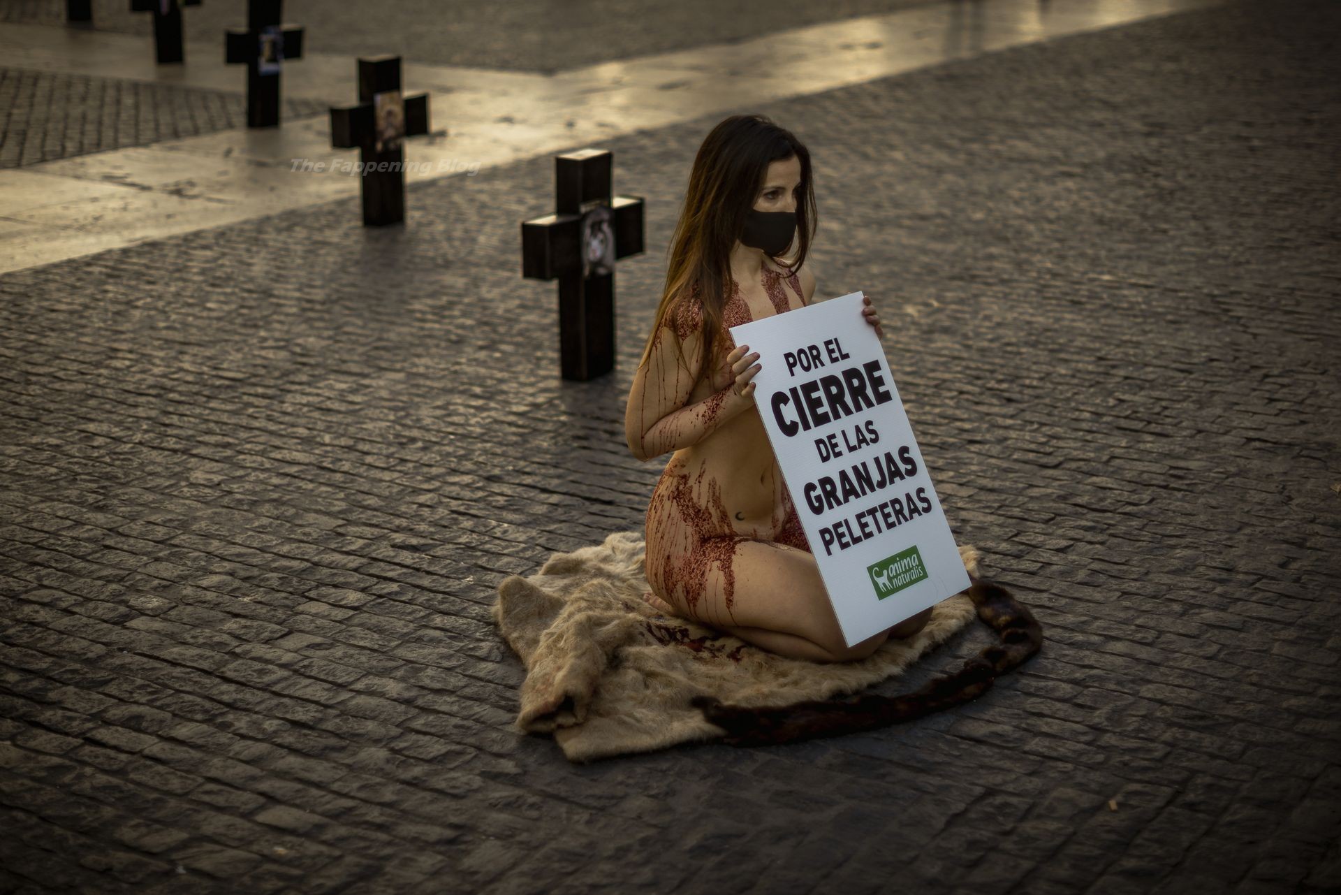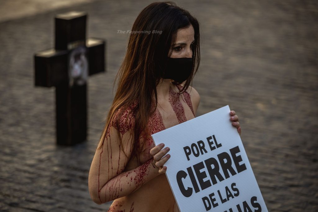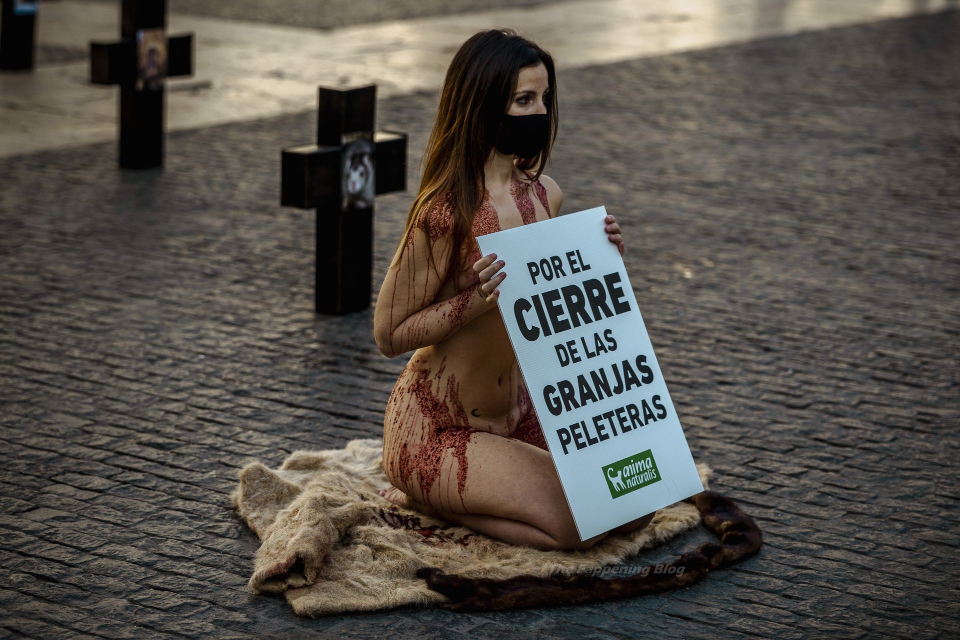 Un militant des droits des animaux nu, couvert de faux sang, exige la fermeture des fermes de fourrure devant la presse réunie lors d’une manifestation pour les droits des animaux organisée à Barcelone, le 21/01/2021.