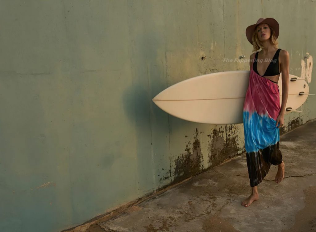 Associée à des chapeaux de soleil, des colliers de perles et des paréos tie-dye, Anja captive dans chaque cliché. Une palette de couleurs éclatantes comprend des nuances de rose fuchsia, vert citron, orange agrume et jaune souci.