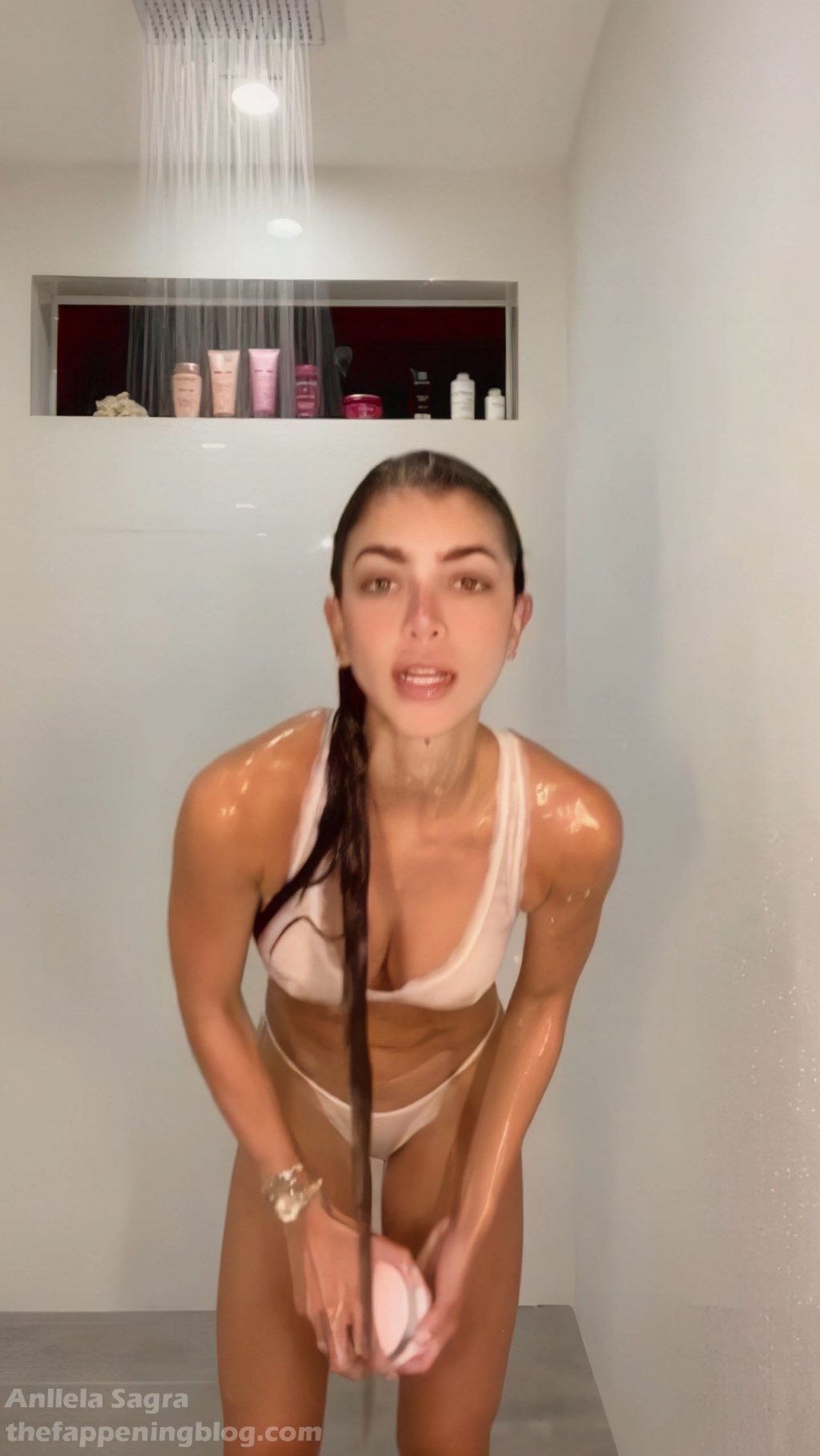 Fitness model Anllela Sagra affiche ses seins légèrement nus en lingerie en dentelle alors qu’elle pose mouillée sous la douche – Instagram, 09/03/2020.