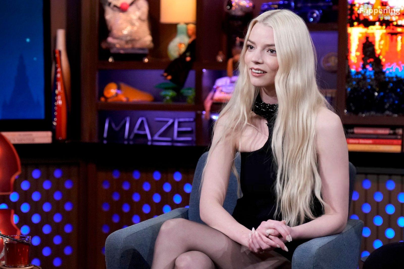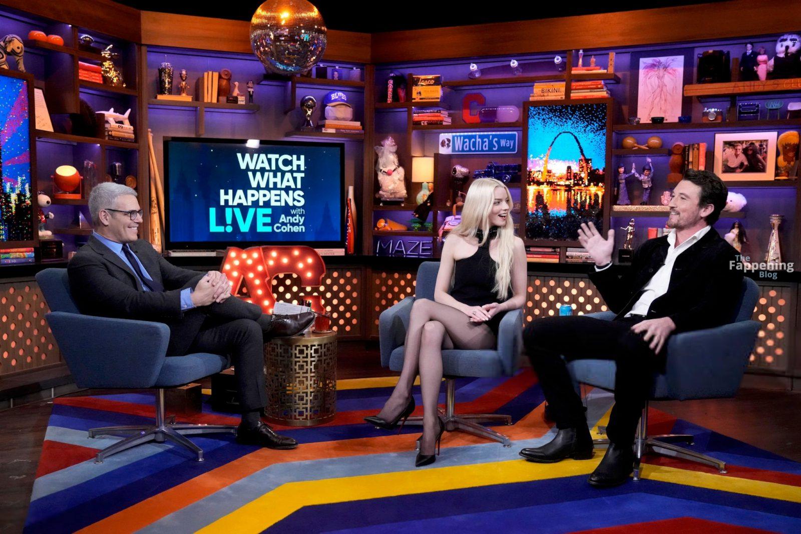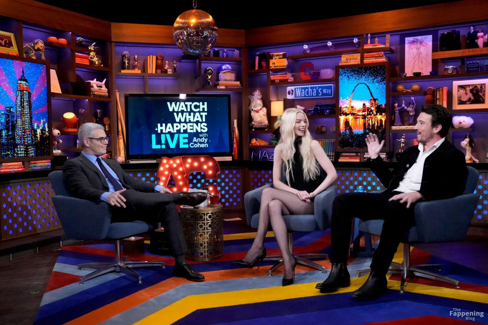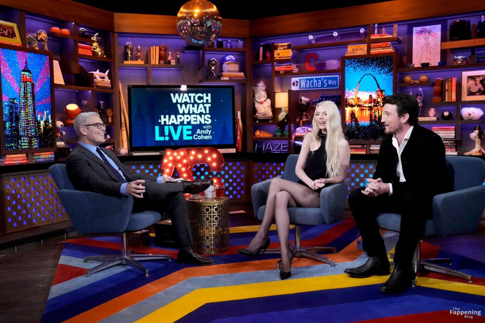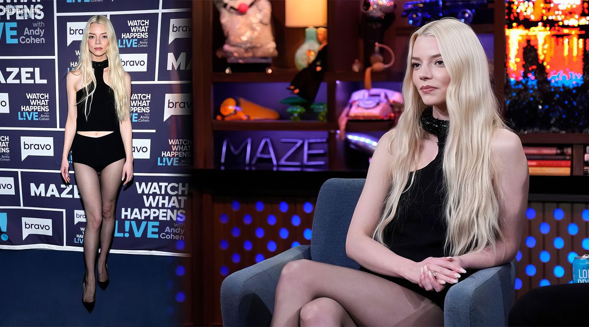 Anya Taylor-Joy est photographiée, exhibant ses jambes fines en collants transparents dans Watch What Happens Live.