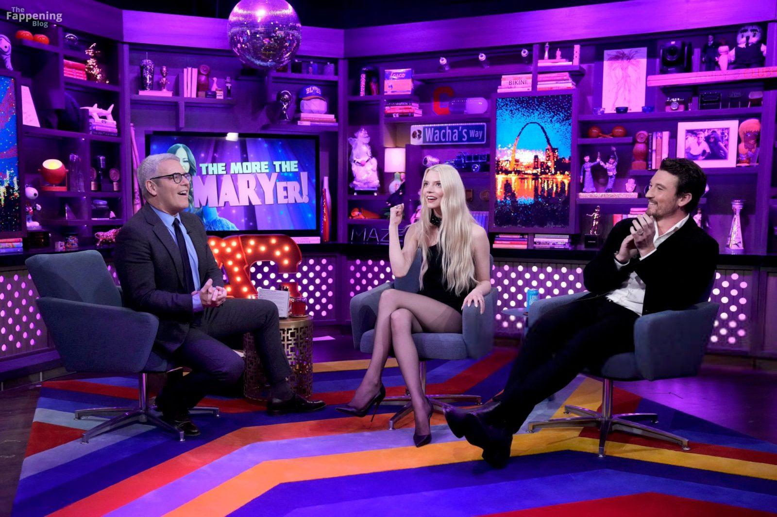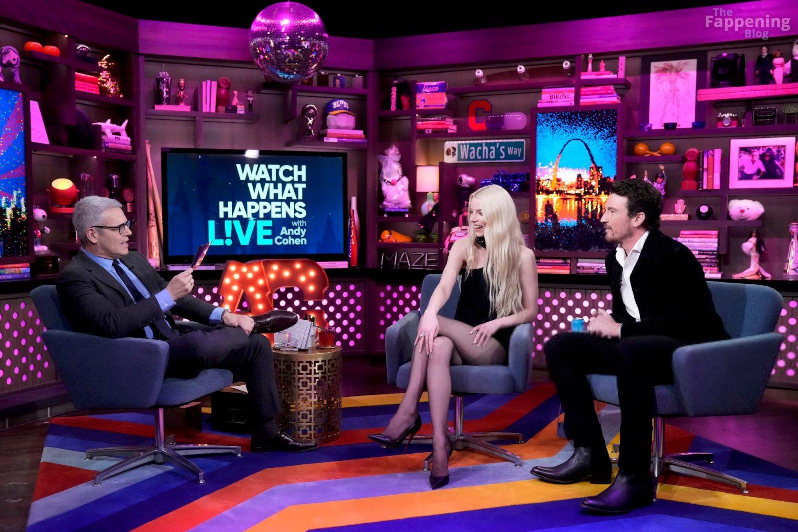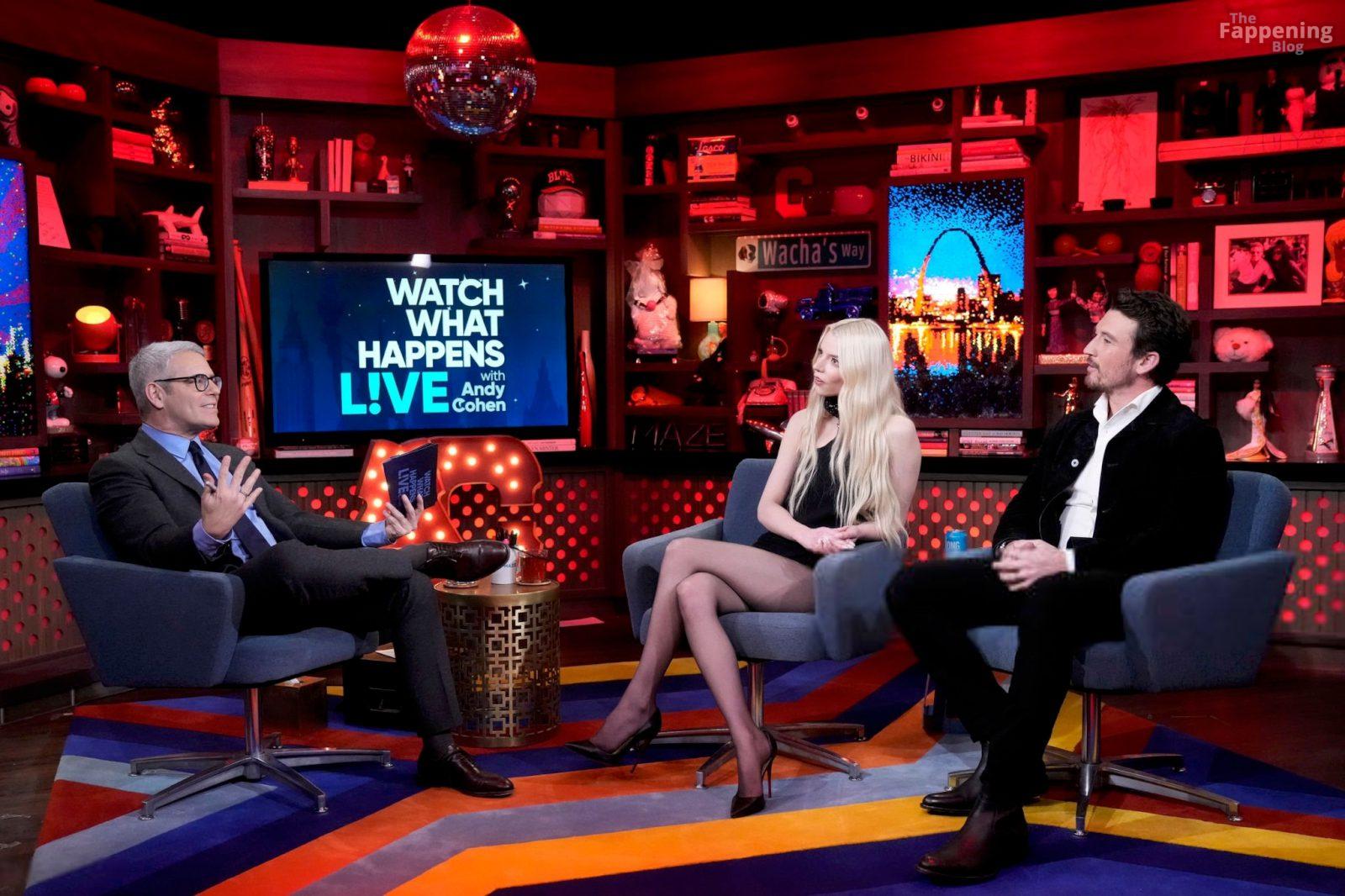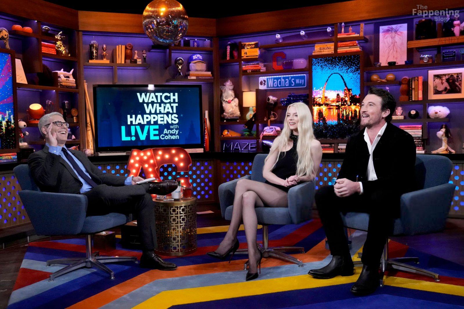 Anya Taylor-Joy est photographiée, exhibant ses jambes fines en collants transparents dans Watch What Happens Live.