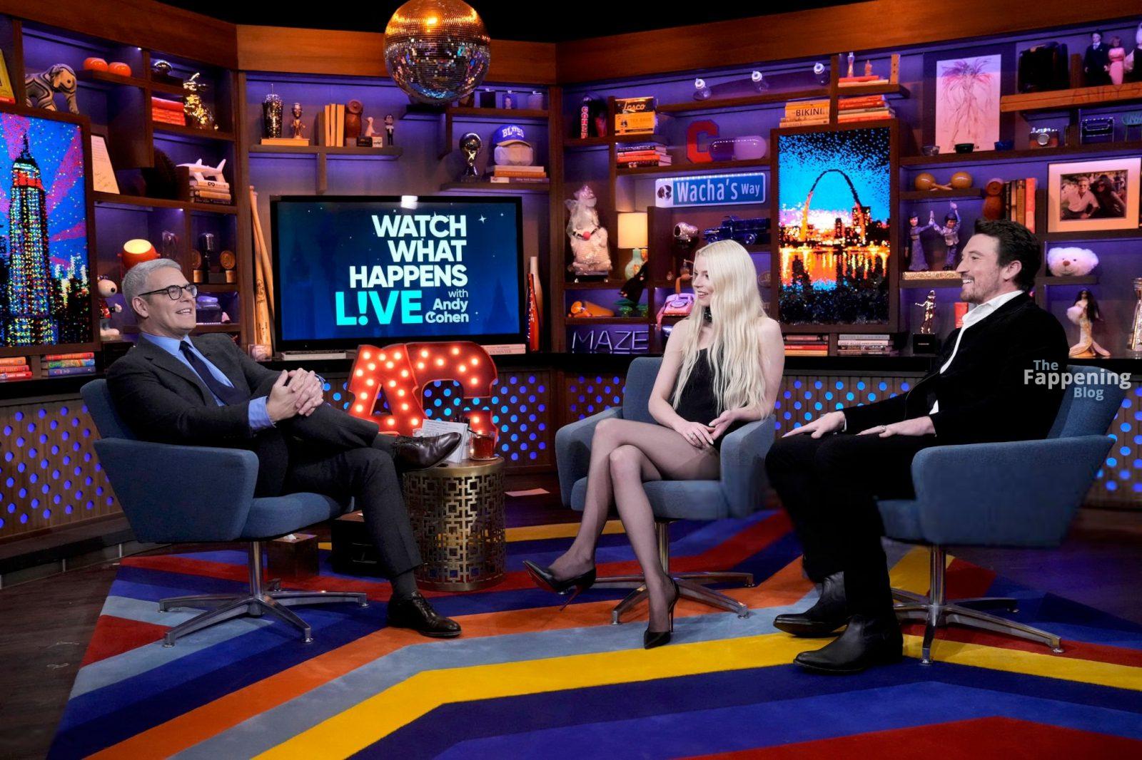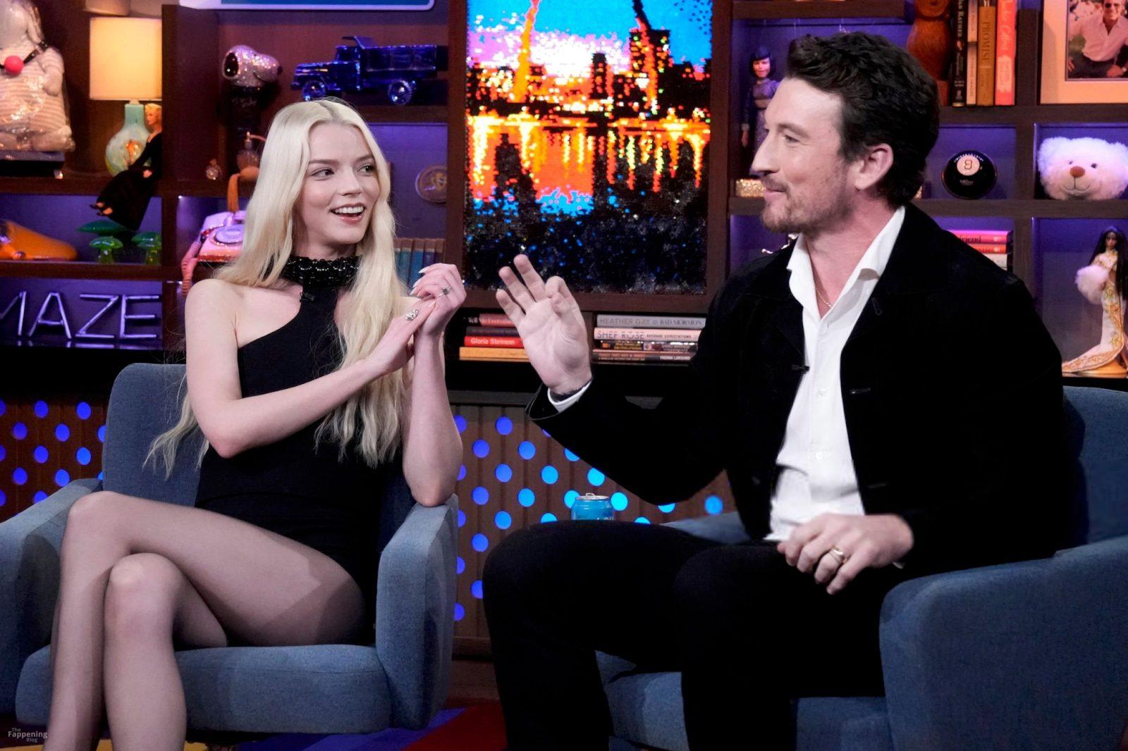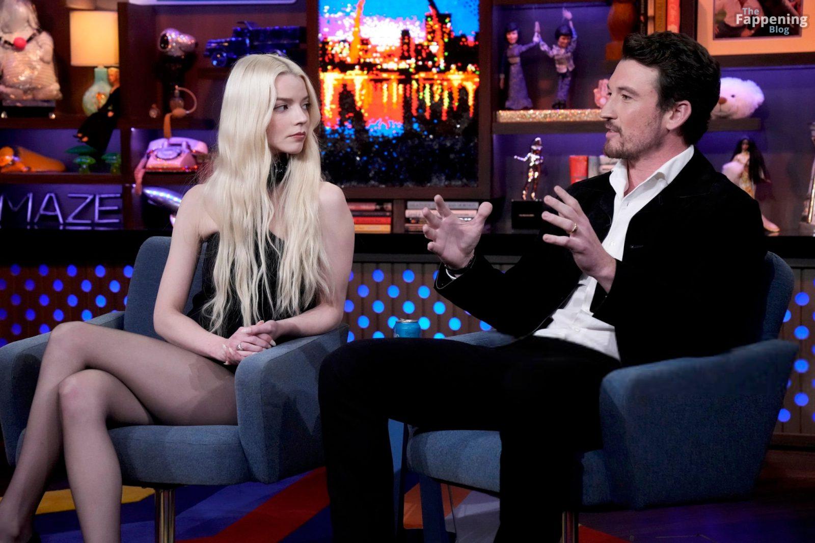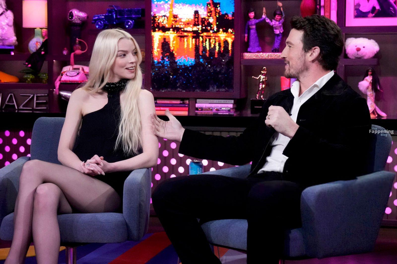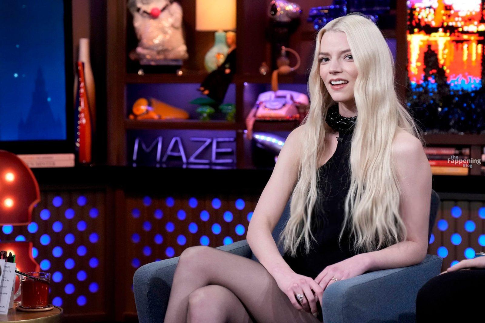 Anya Taylor-Joy est photographiée, exhibant ses jambes fines en collants transparents dans Watch What Happens Live.