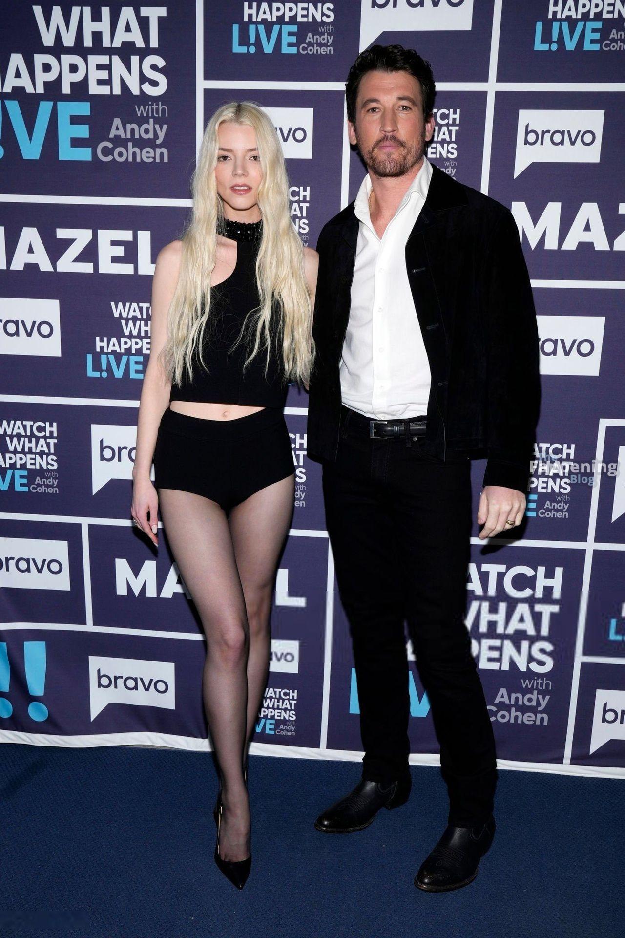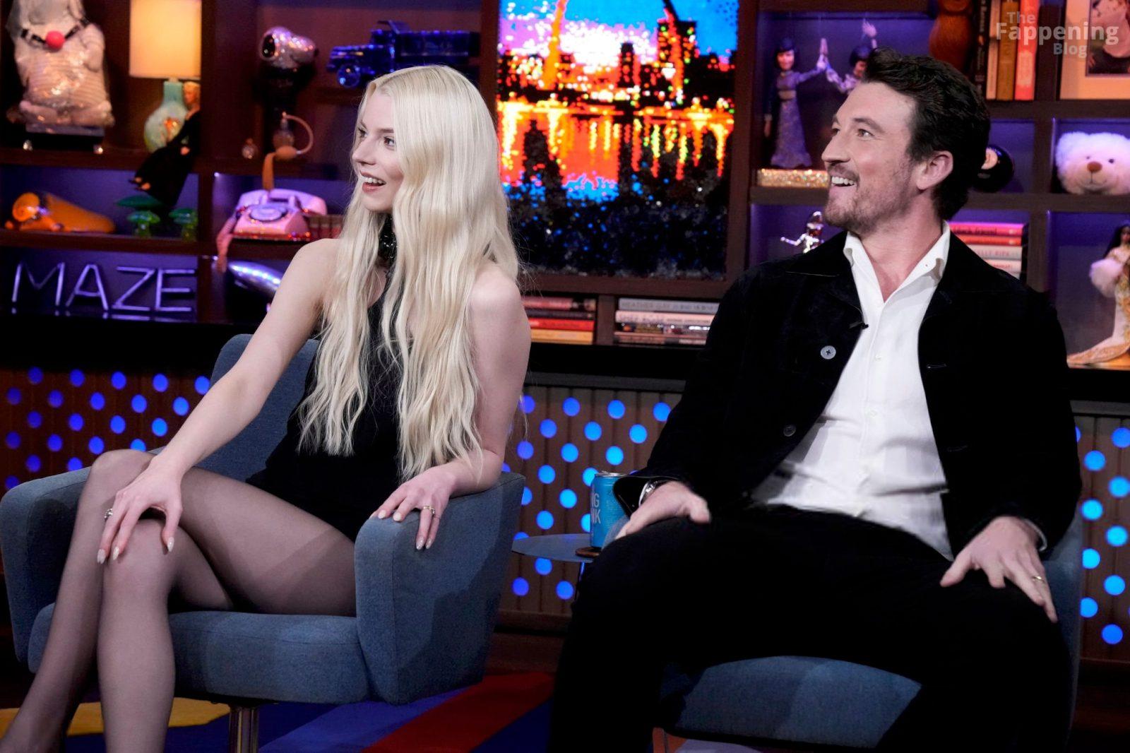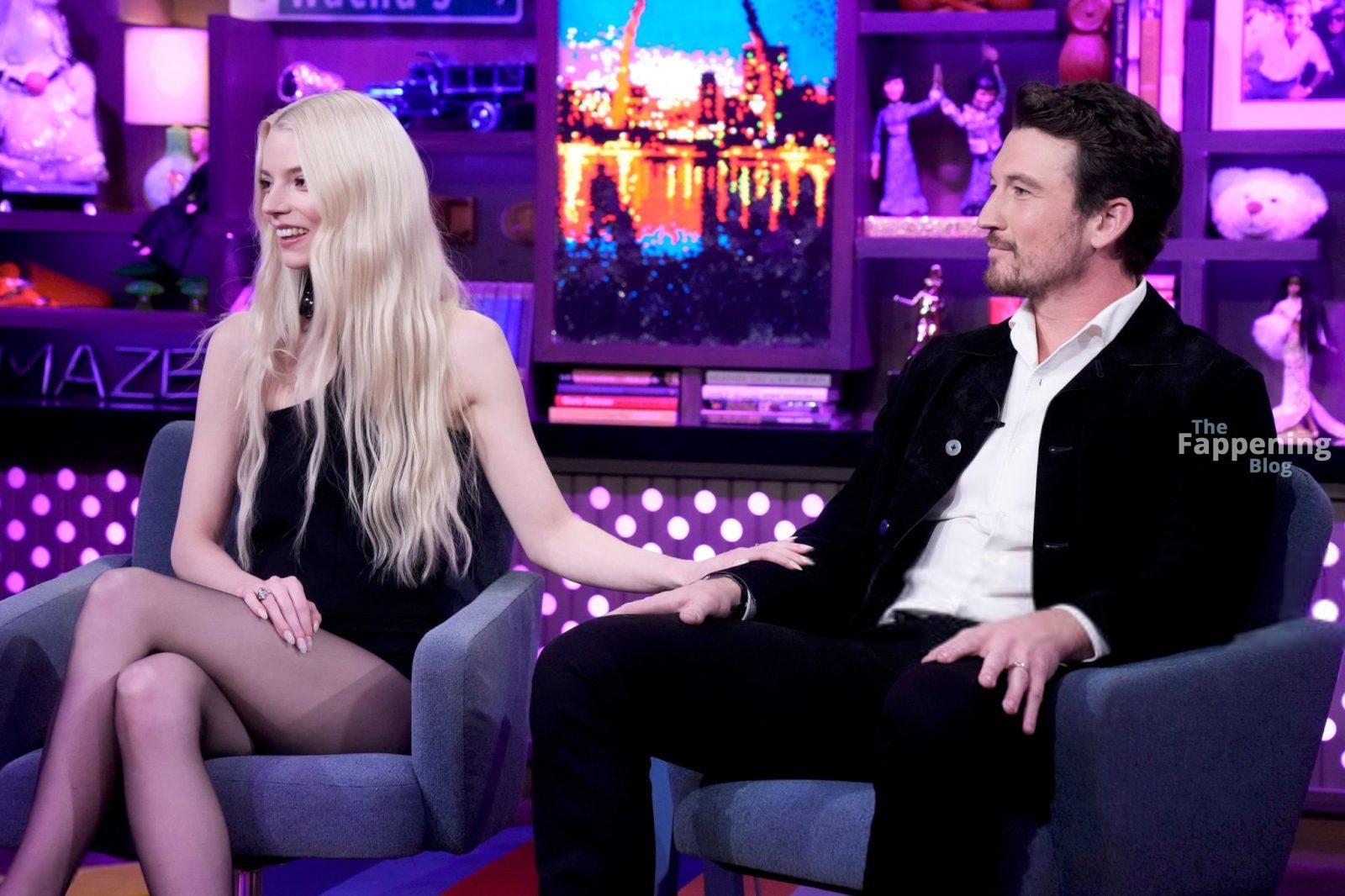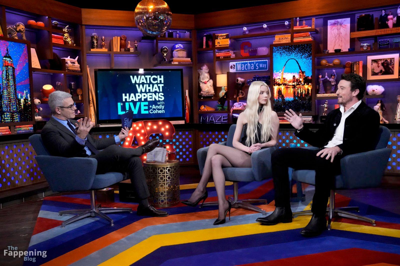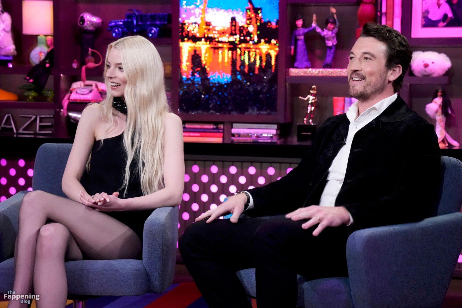 Anya Taylor-Joy est photographiée, exhibant ses jambes fines en collants transparents dans Watch What Happens Live.