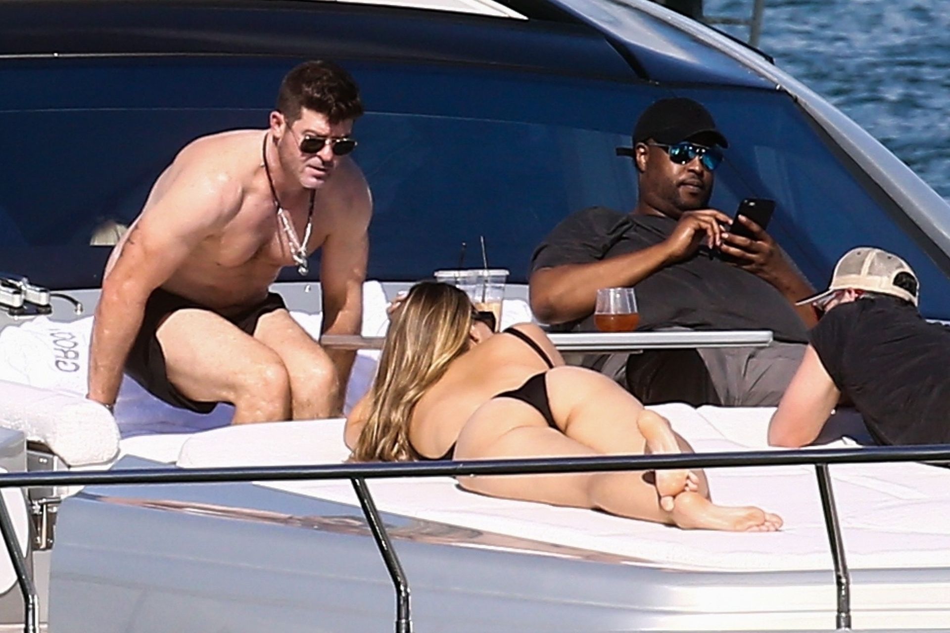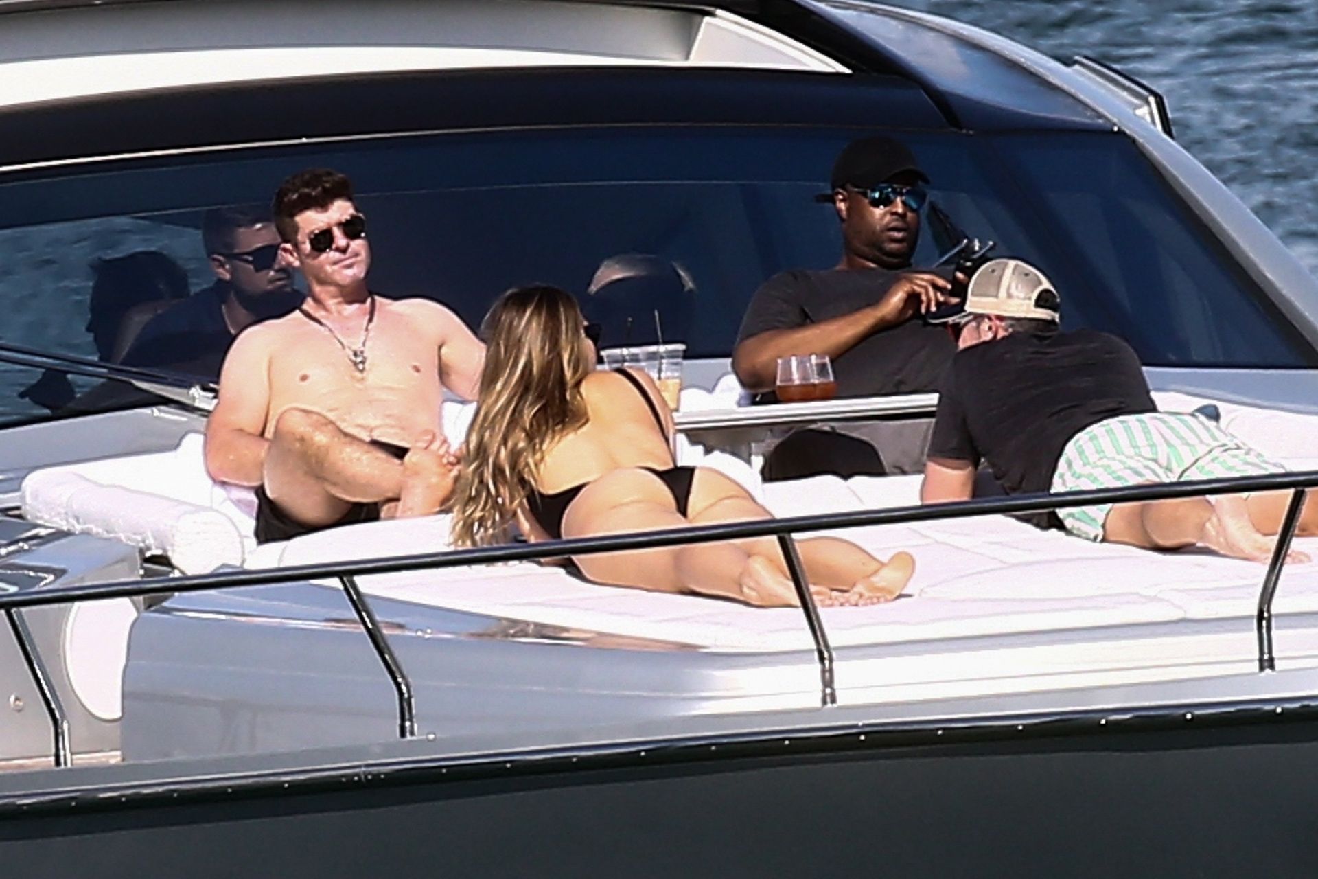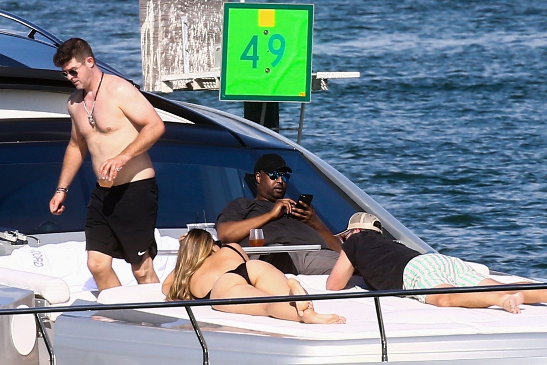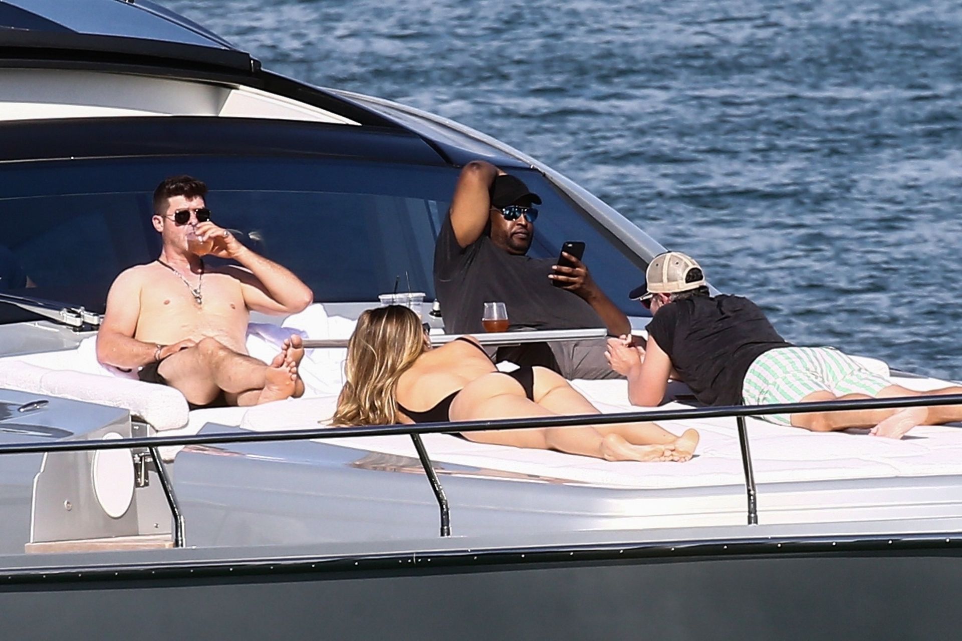 Crooner Robin Thicke et sa sexy blonde, April Love Geary, bronzent sur un yacht avec des amis pendant leurs vacances à Miami, 22/11/2019.