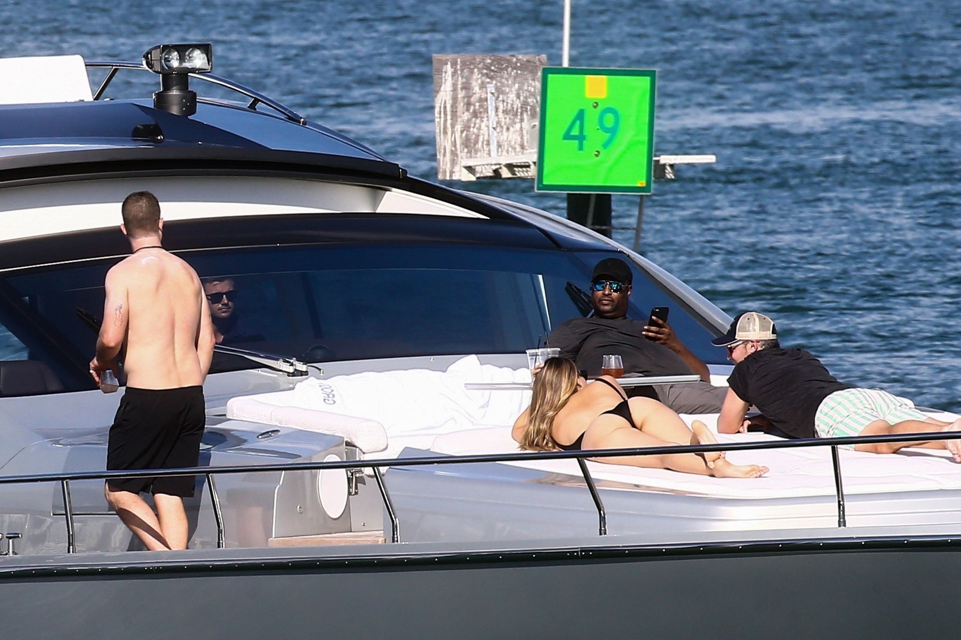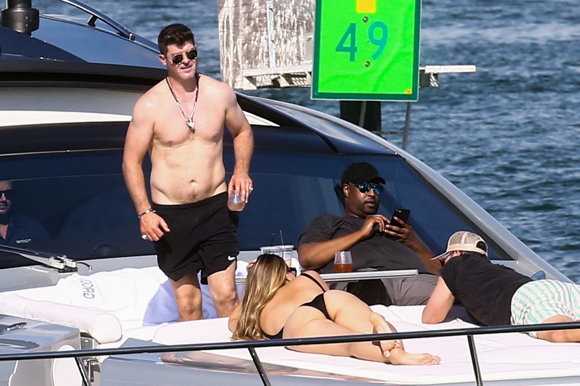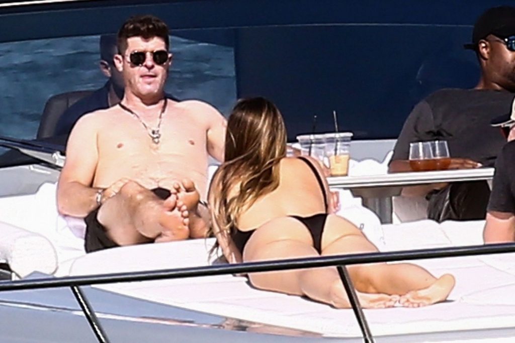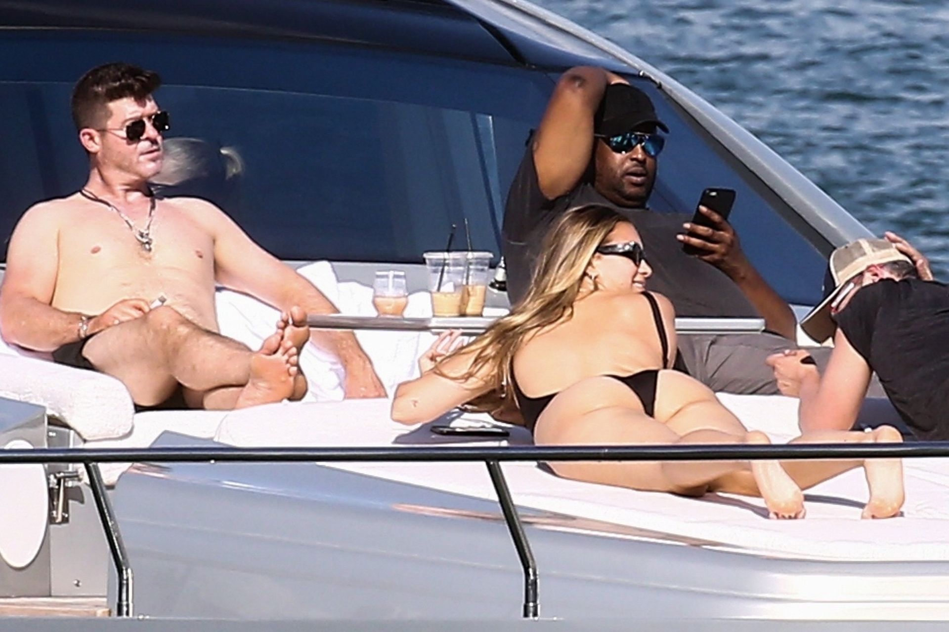 Crooner Robin Thicke et sa sexy blonde, April Love Geary, bronzent sur un yacht avec des amis pendant leurs vacances à Miami, 22/11/2019.