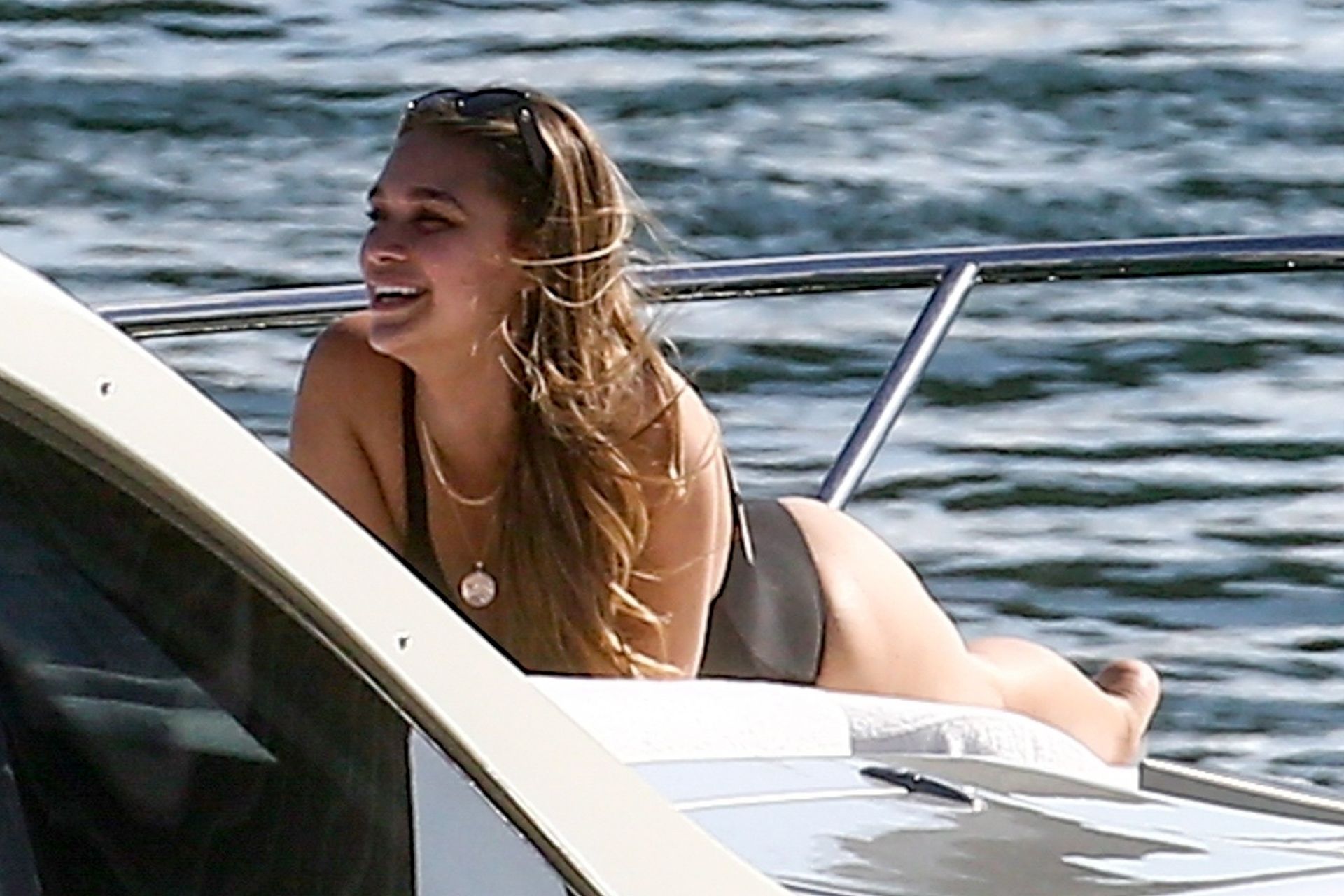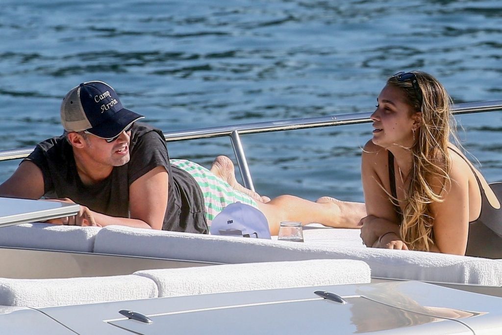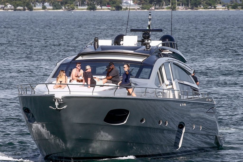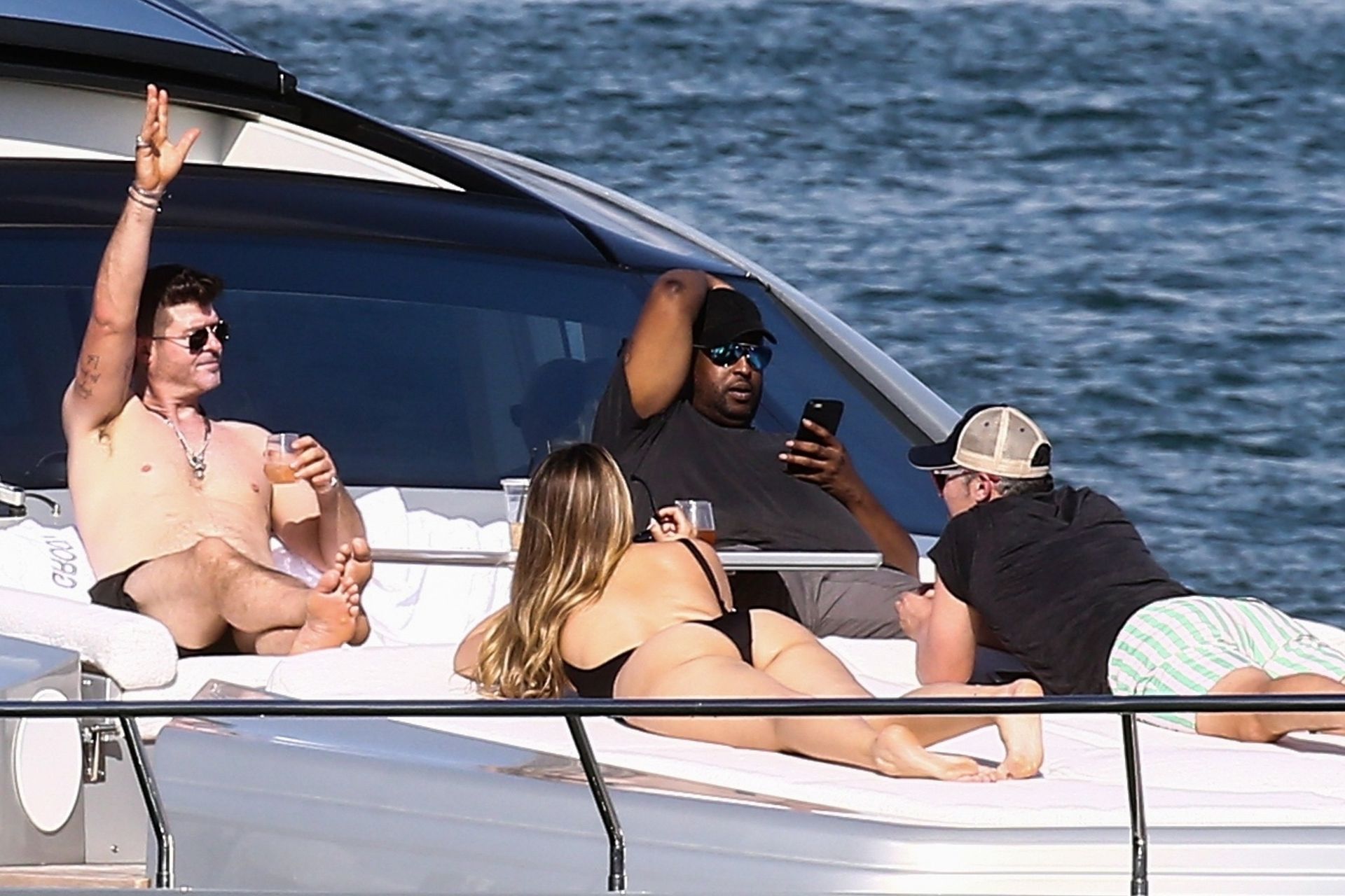 Crooner Robin Thicke et sa sexy blonde, April Love Geary, bronzent sur un yacht avec des amis pendant leurs vacances à Miami, 22/11/2019.