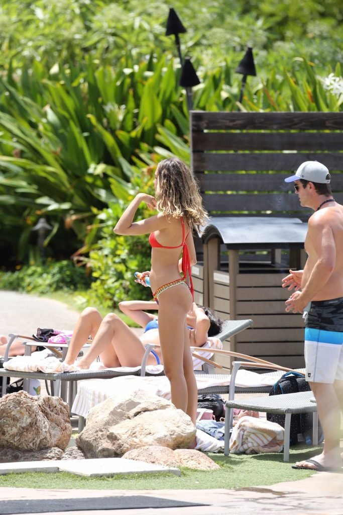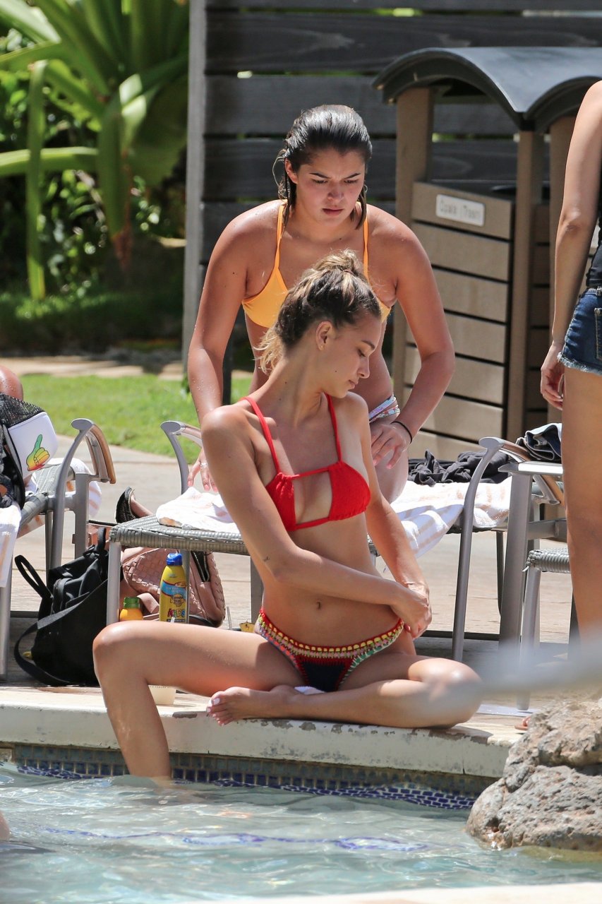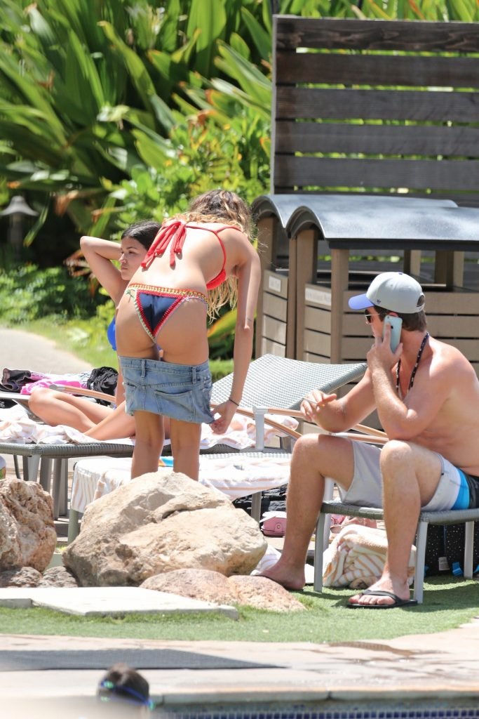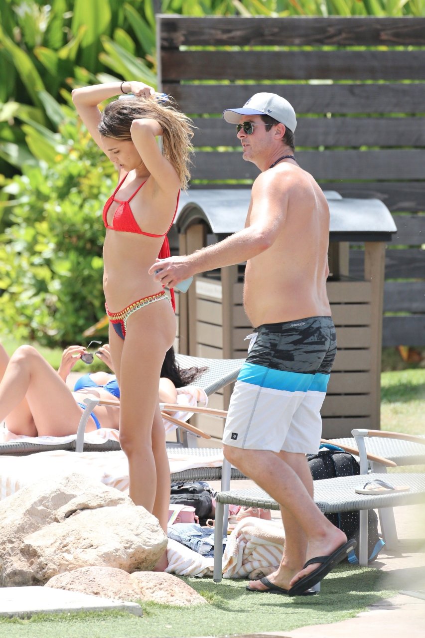 Le mannequin enceinte April Love Geary montre à peine un ventre de bébé alors qu’elle se rend à la piscine avec Robin Thicke sur la côte nord d’Hawaï, 18/08/2017.