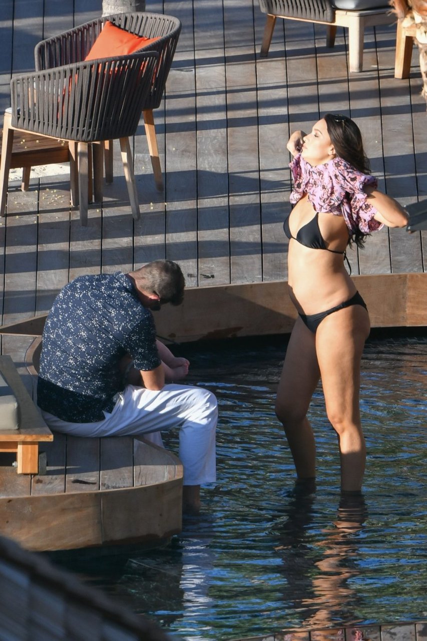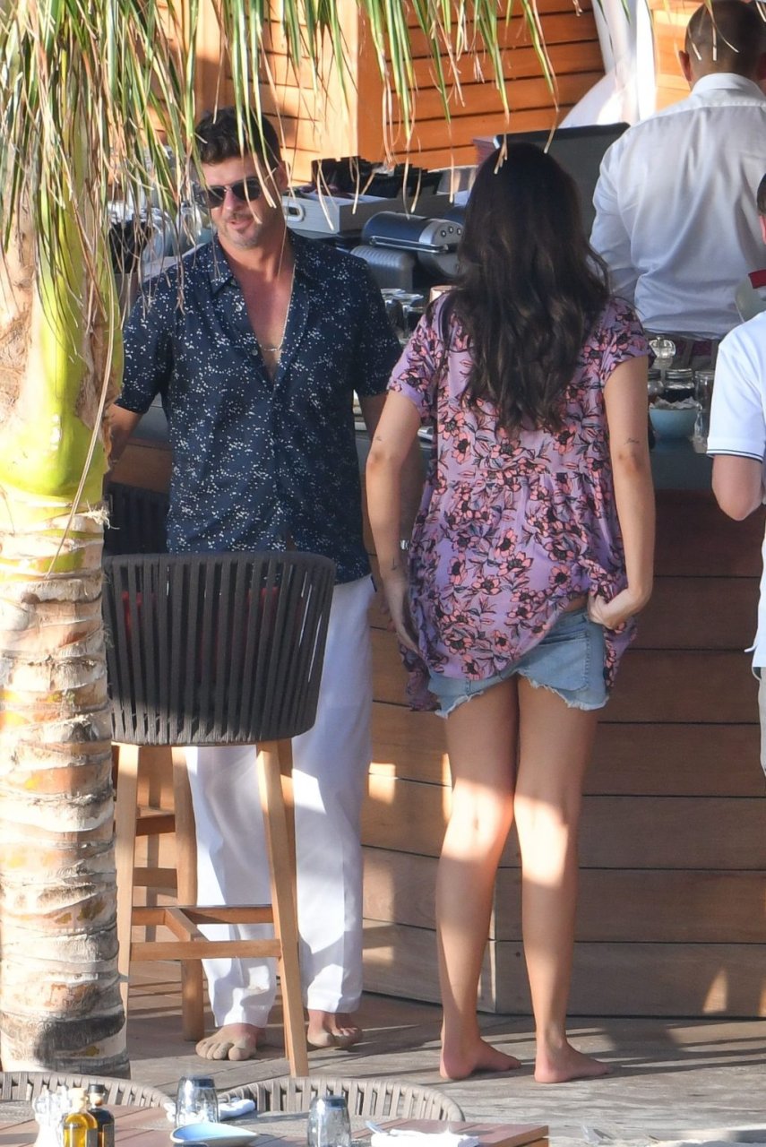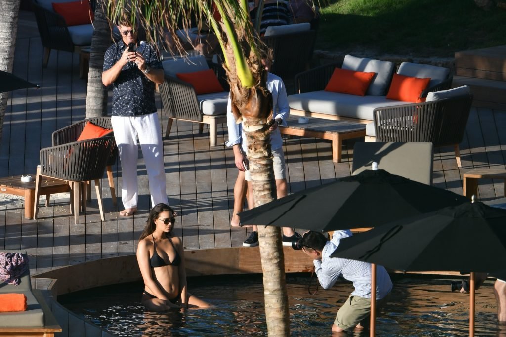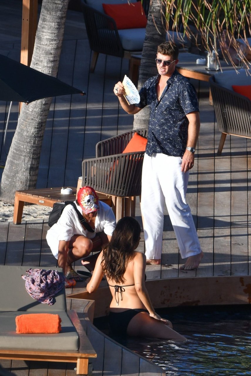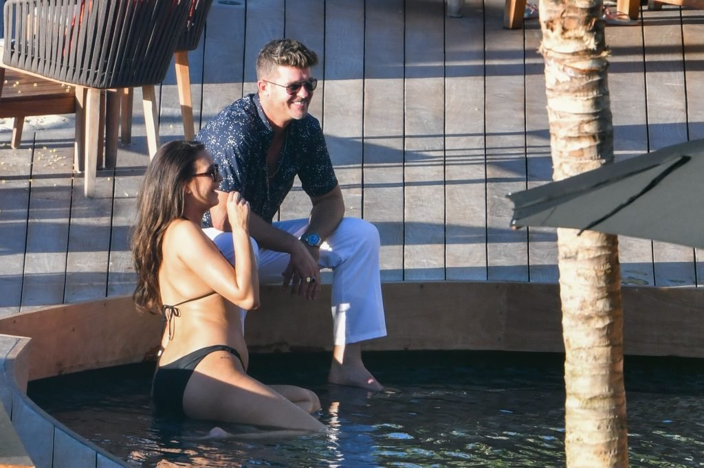 Robin Thicke pose avec sa partenaire enceinte April Love Geary (23 ans) pour une séance photo tropicale à St. Barts, le 26/10/2018. On peut voir Thicke câliner April dans une pataugeoire.