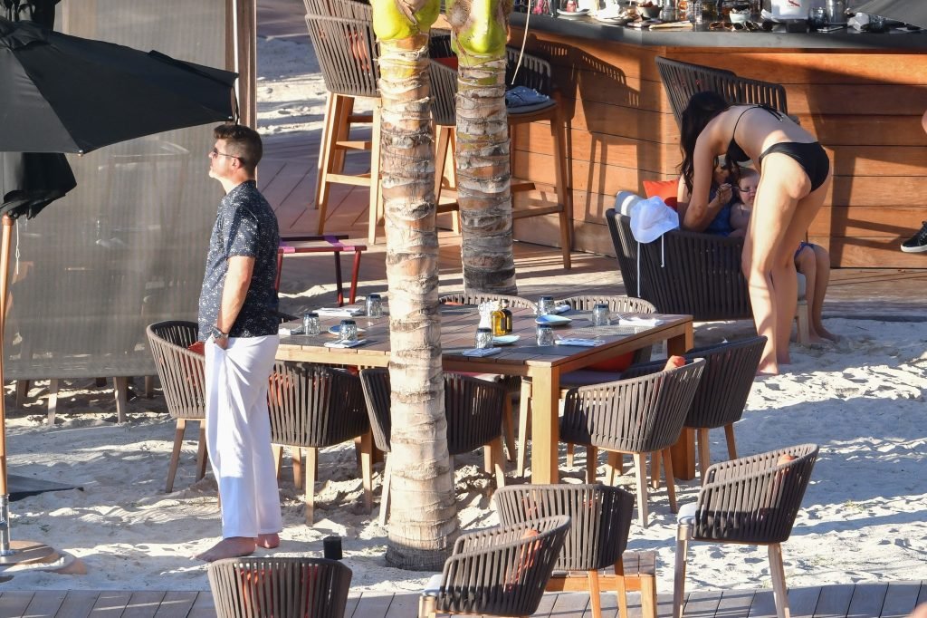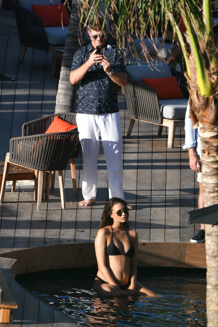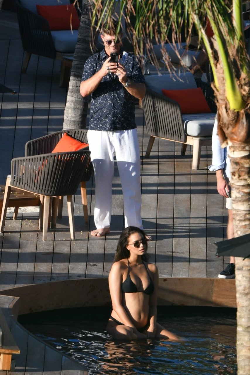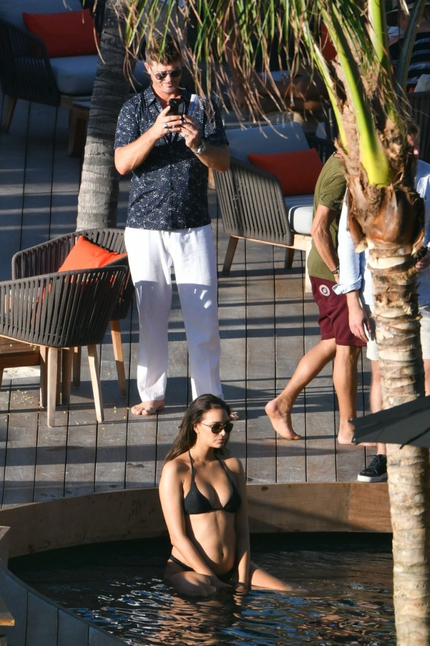 Robin Thicke pose avec sa partenaire enceinte April Love Geary (23 ans) pour une séance photo tropicale à St. Barts, le 26/10/2018. On peut voir Thicke câliner April dans une pataugeoire.