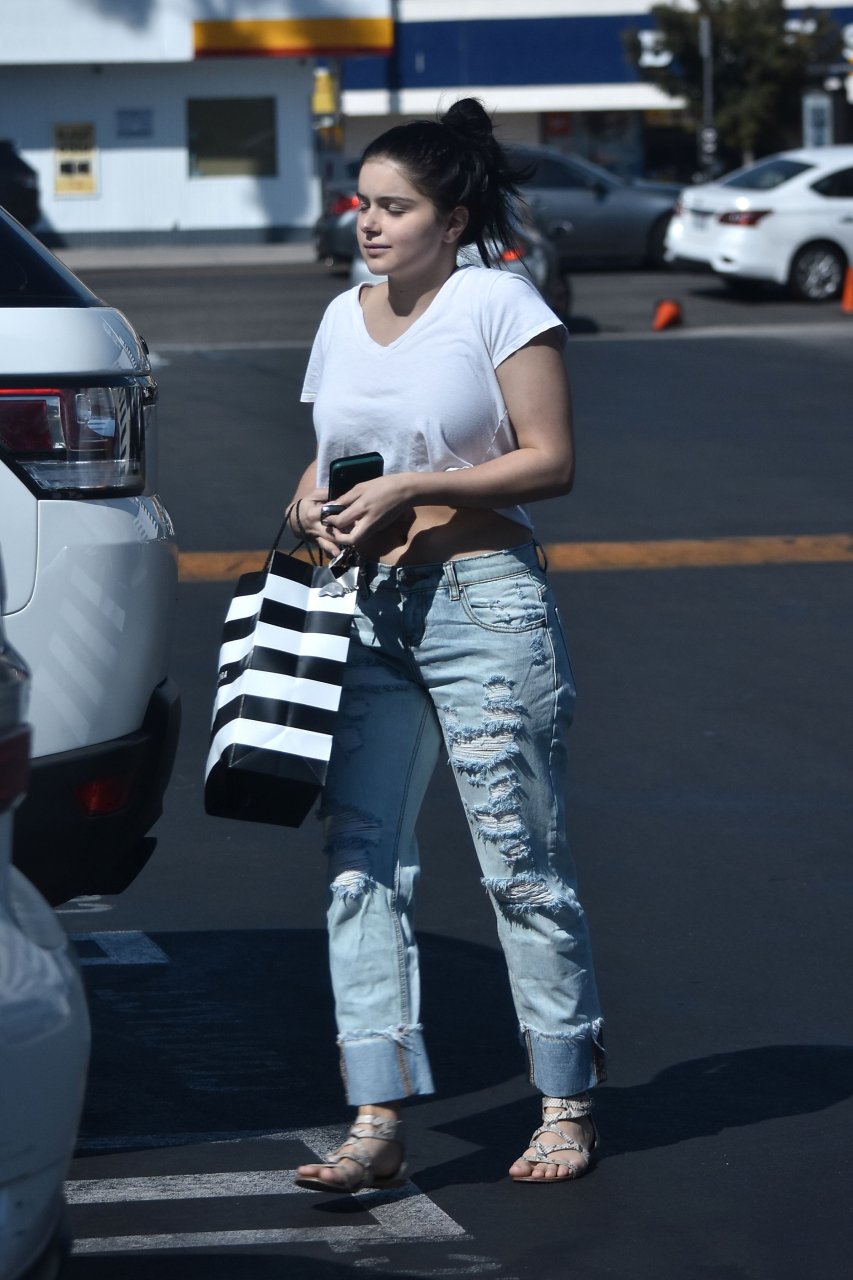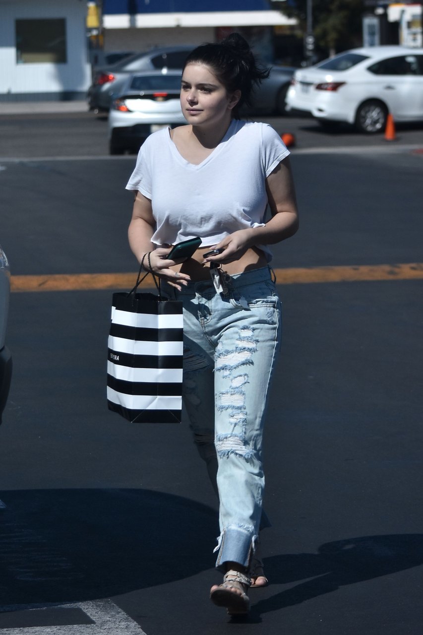 Ariel Winter montre son ventre dans un tee-shirt blanc court et un jean taille basse alors qu’elle fait du shopping chez Sephora à Los Angeles, le 05/10/2018. L’actrice de 20 ans de “Modern Family” a été vue sans maquillage, les cheveux relevés en chignon, montrant son ventre plat en marchant vers sa voiture après avoir fait du shopping chez Sephora.