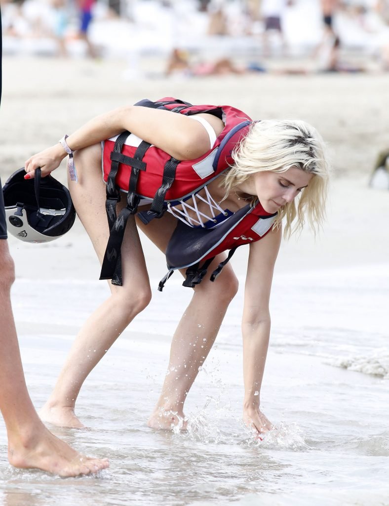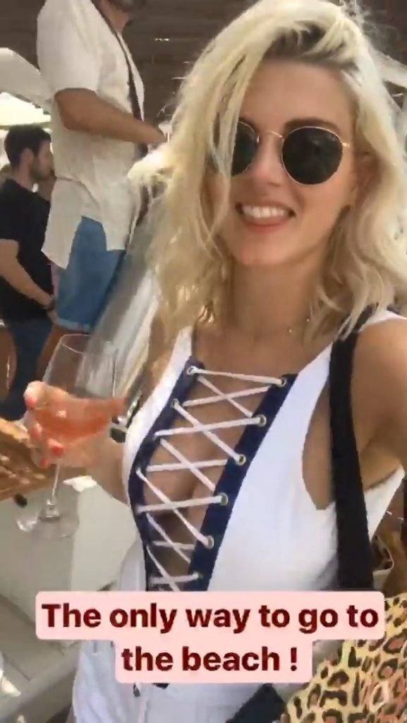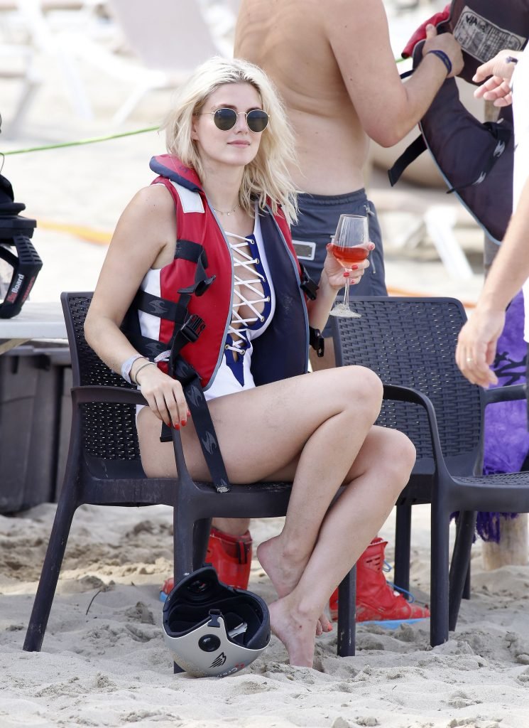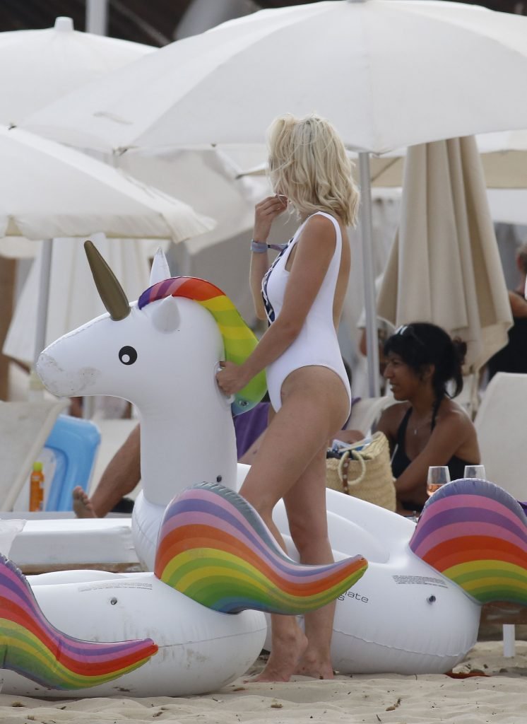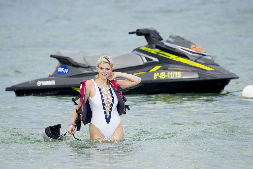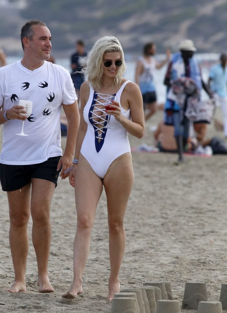 Ashley James porte un maillot de bain blanc sexy lors de la Global Gift Gala Party à Ibiza, le 21/07/2017. Ashley James est mannequin, blogueuse, animatrice télé, star de la télé-réalité (Made In Chelsea (TV)). Âge – 30.