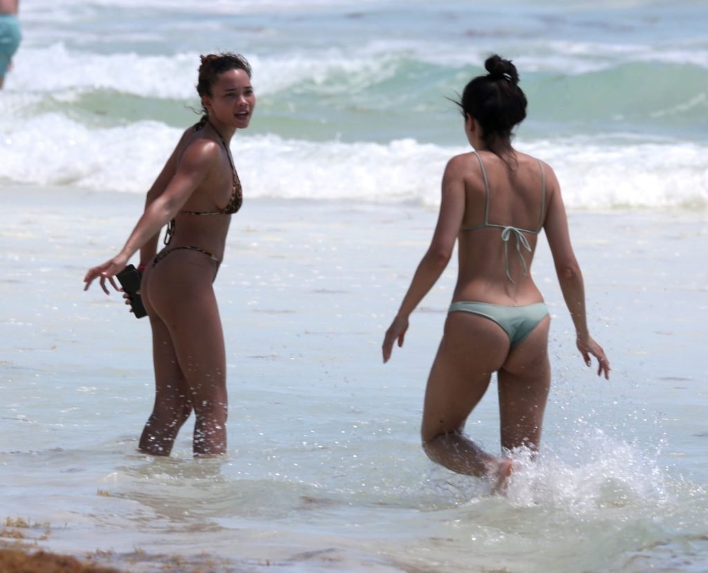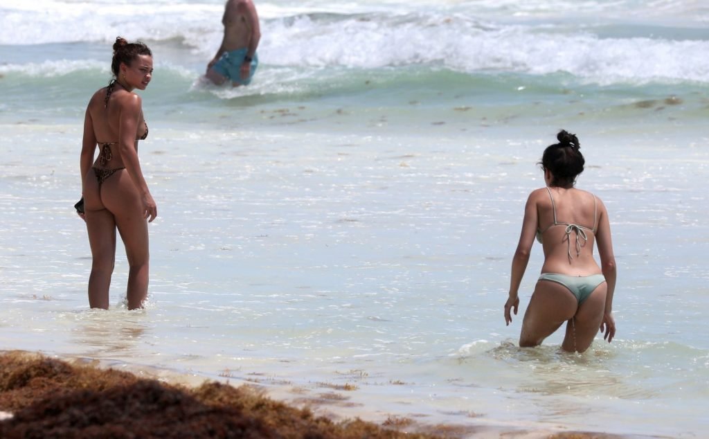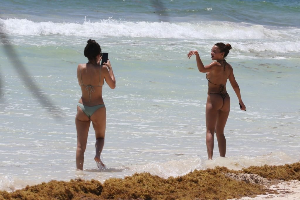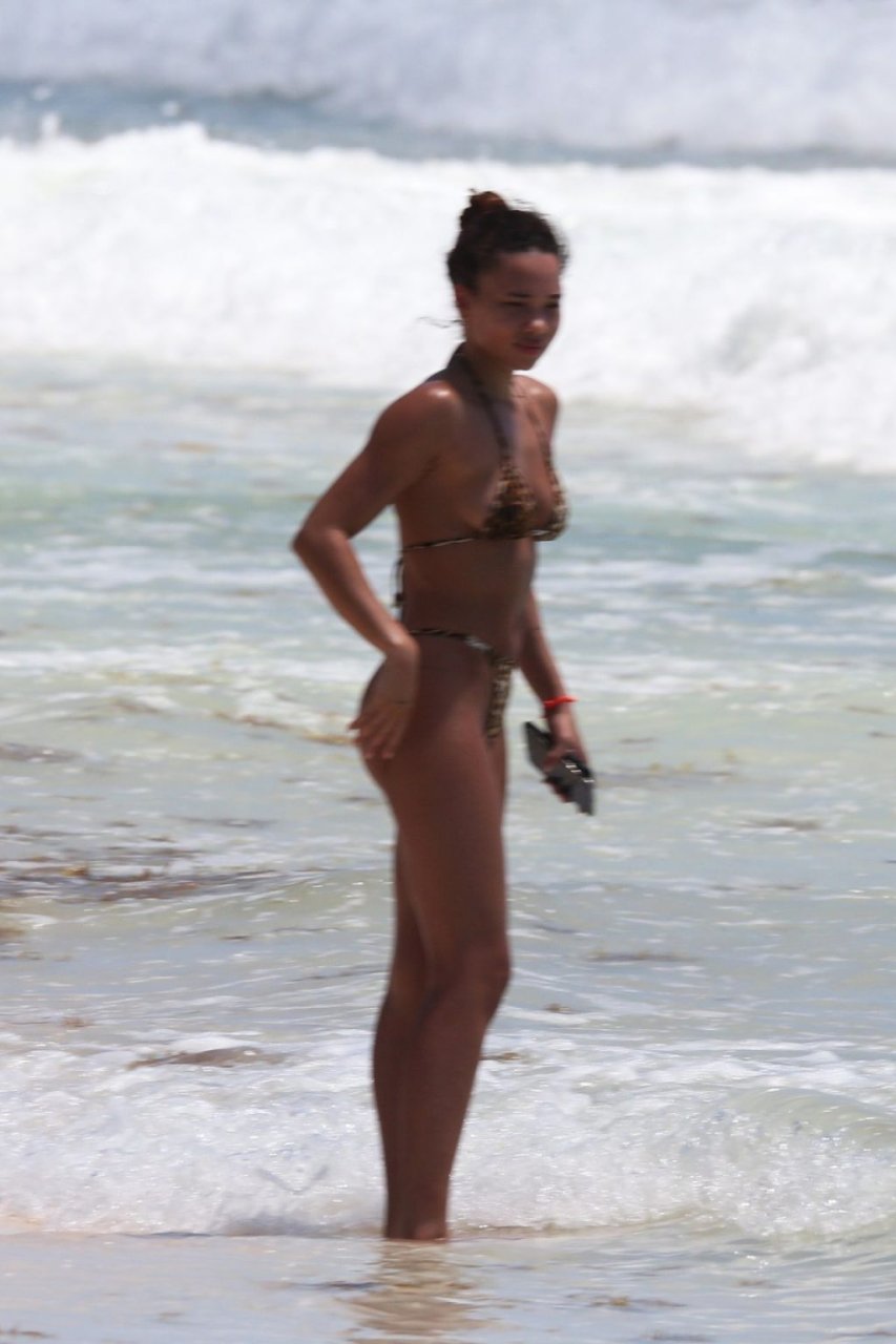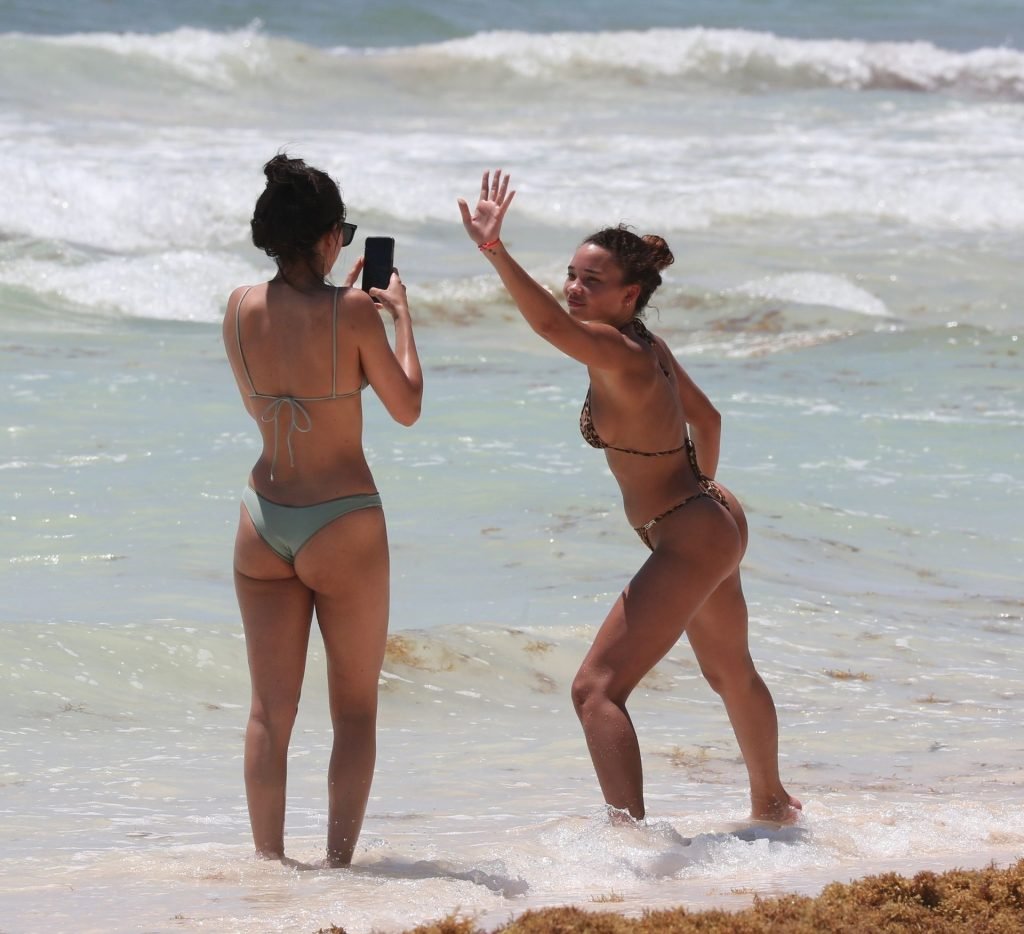 Ashley Moore fait sensation dans un tout petit bikini imprimé animal sur la plage de Tulum, au Mexique, le 22/04/2019. Le mannequin de 25 ans, qui a été brièvement lié au chanteur Justin Bieber, s’est prélassée au soleil avant de rejoindre l’eau avec une amie pour prendre des selfies sous le soleil tropical.