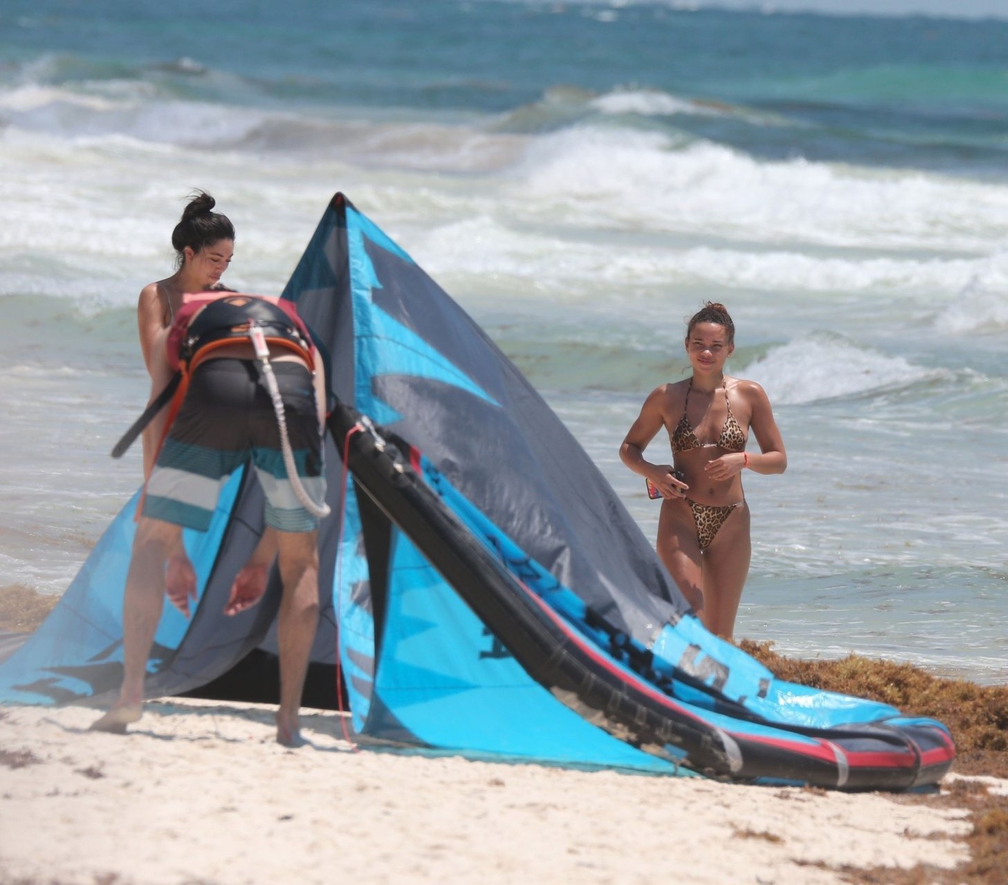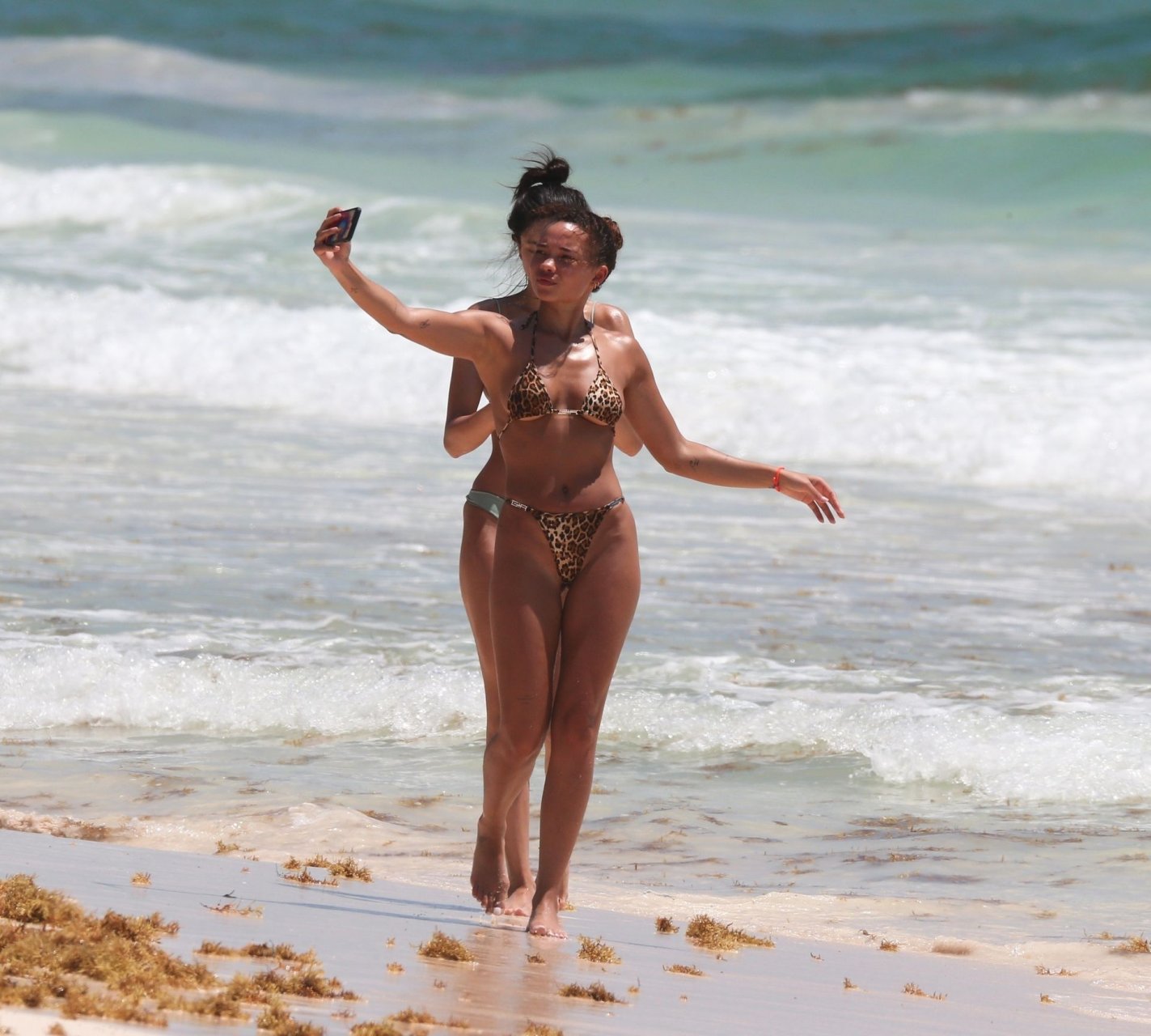 Ashley Moore fait sensation dans un tout petit bikini imprimé animal sur la plage de Tulum, au Mexique, le 22/04/2019. Le mannequin de 25 ans, qui a été brièvement lié au chanteur Justin Bieber, s’est prélassée au soleil avant de rejoindre l’eau avec une amie pour prendre des selfies sous le soleil tropical.