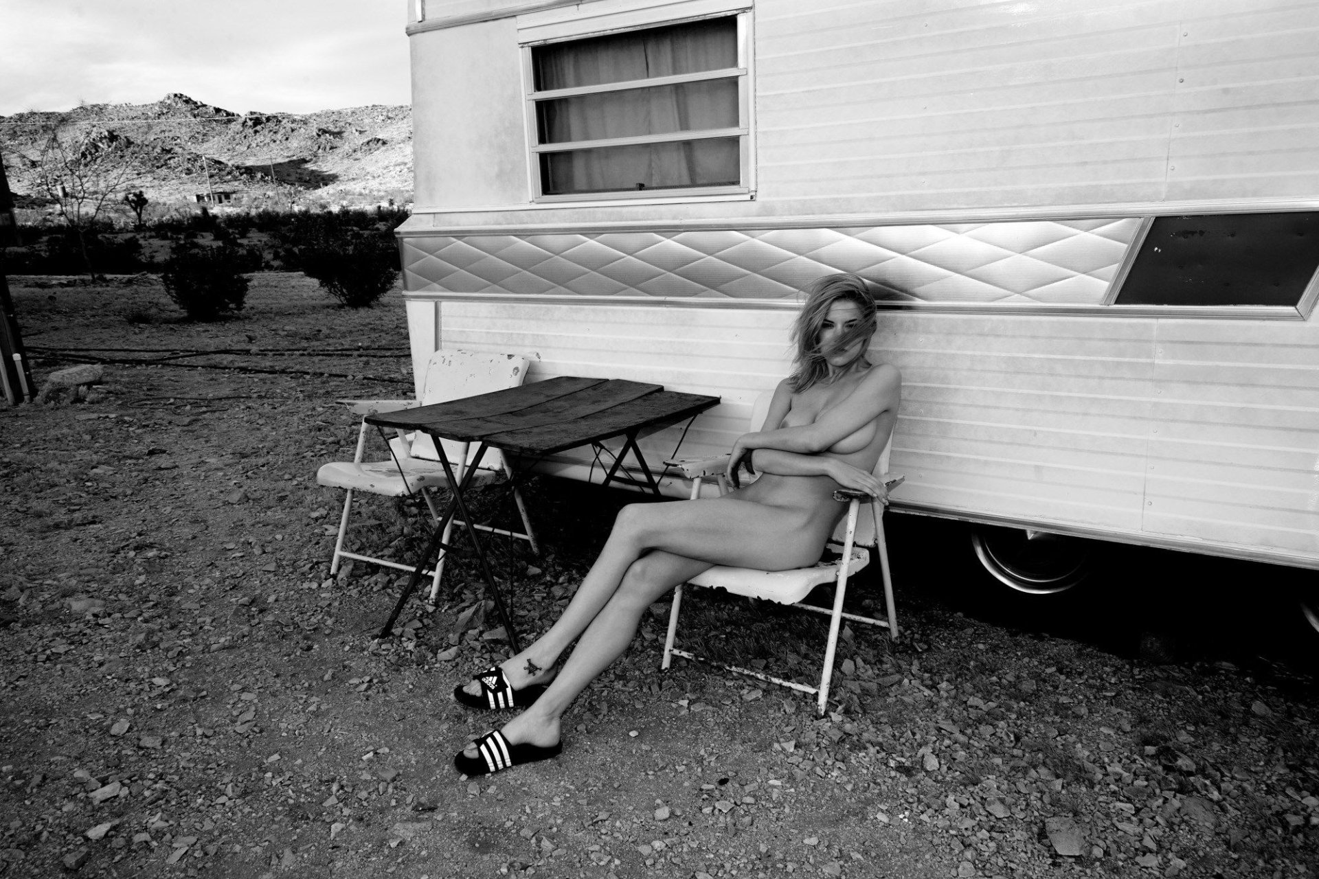 Ashley Smith se repose dans une caravane. Photographie par Claire Rothstein. Ashley Smith est un mannequin des États-Unis. Âge : 26 ans (26 novembre 1990).