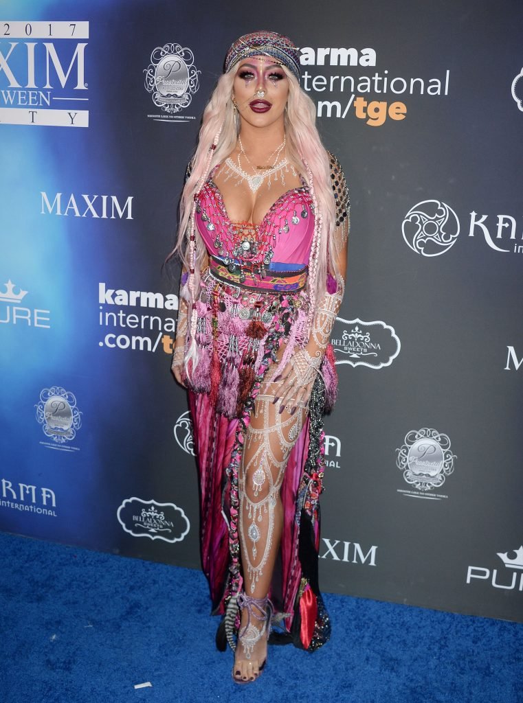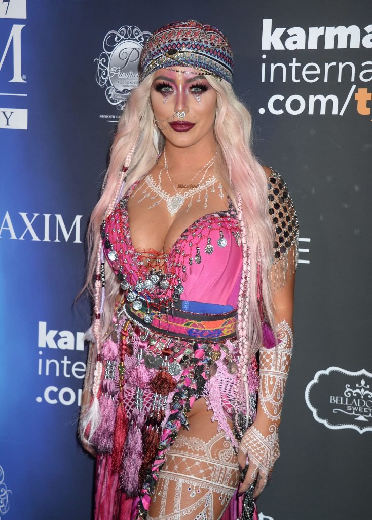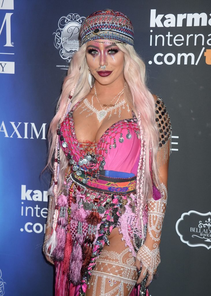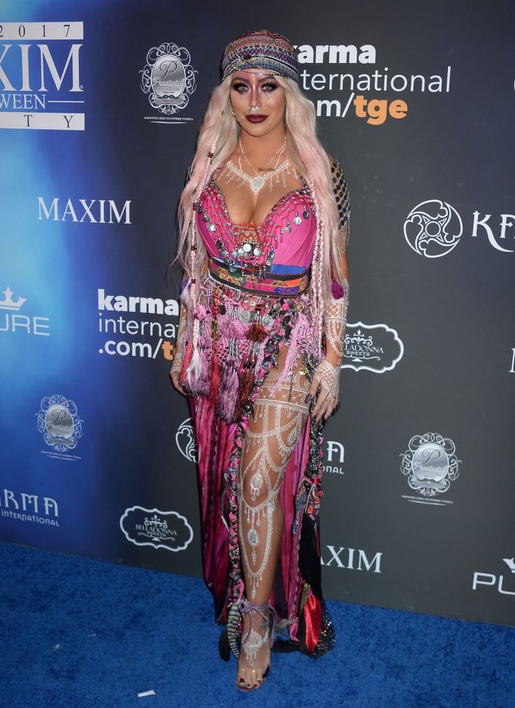 Aubrey O’Day exhibe son costume exotique (y compris des faux seins) à la fête d’Halloween Maxim 2017 à Los Angeles, le 21/10/2017. Aubrey O’Day est une chanteuse/auteure-compositrice américaine, actrice et star de la télé-réalité. Âge : 33 ans.