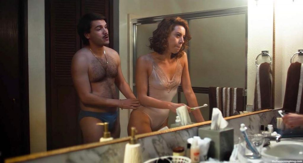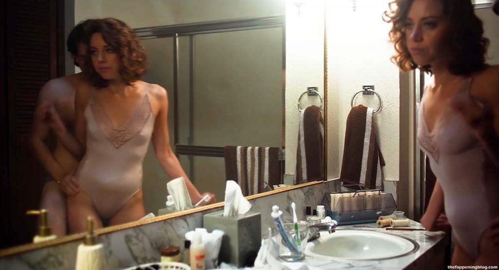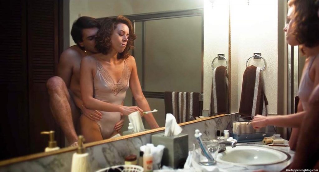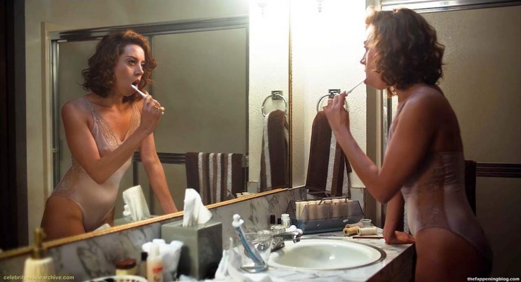 In this scene from An Evening with Beverly Luff Linn’, we can see Aubrey Plaza sexy in beige lingerie brushing her teeth in the bathroom. Then her man enters and starts to kiss her neck from behind, but Aubrey is not satisfied and leaves the bathroom. Her nipples are poking!