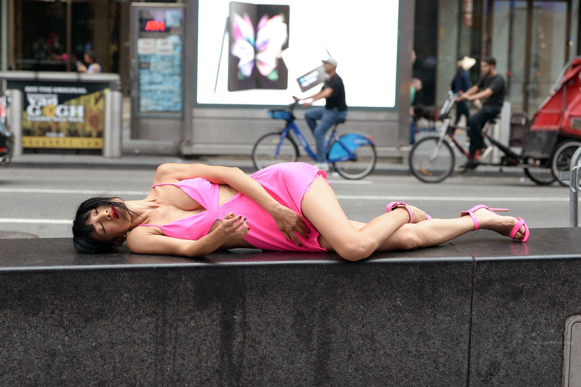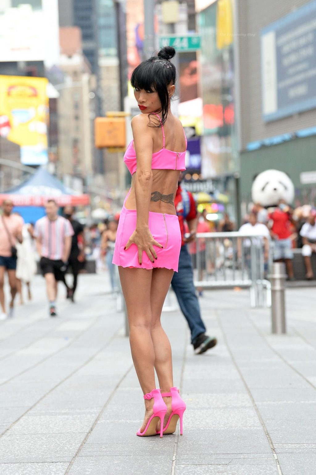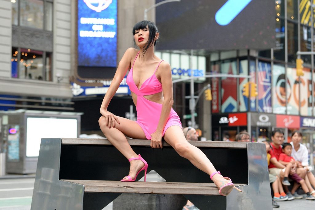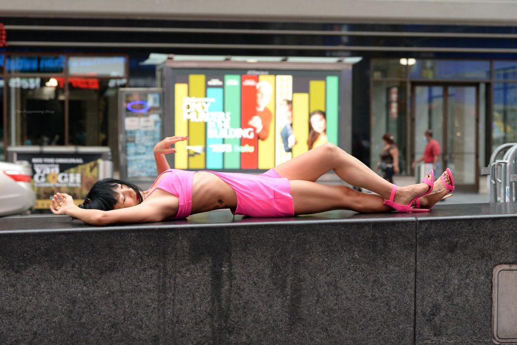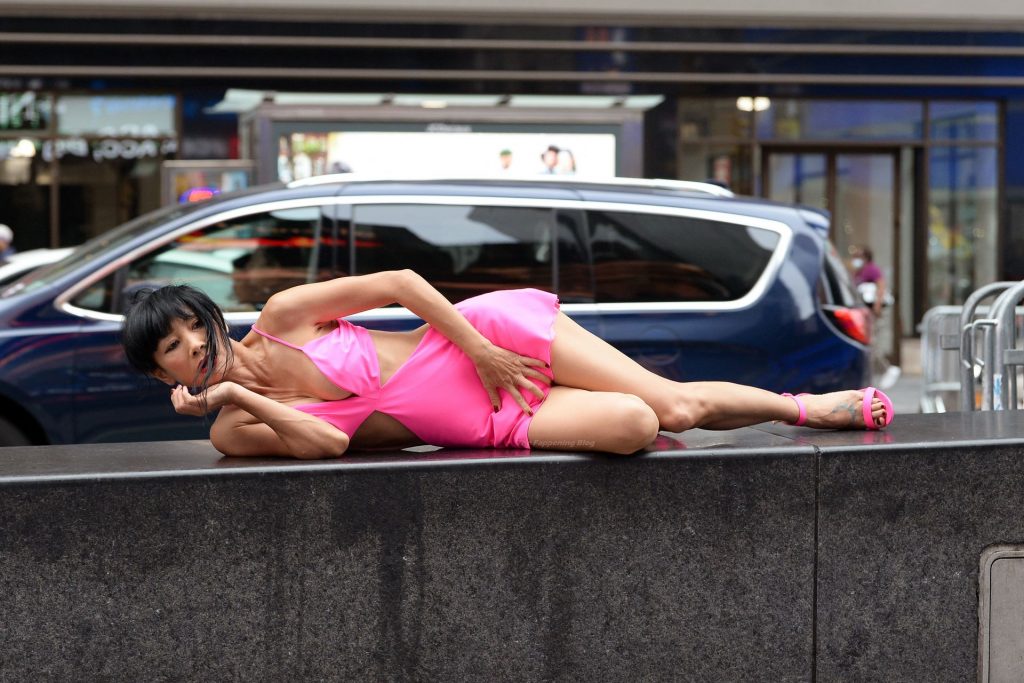 Actrice et mannequin, Bai Ling est vue en séance photo, montrant ses jambes fines, portant une robe rose à Times Square à New York, 20/08/2021.
