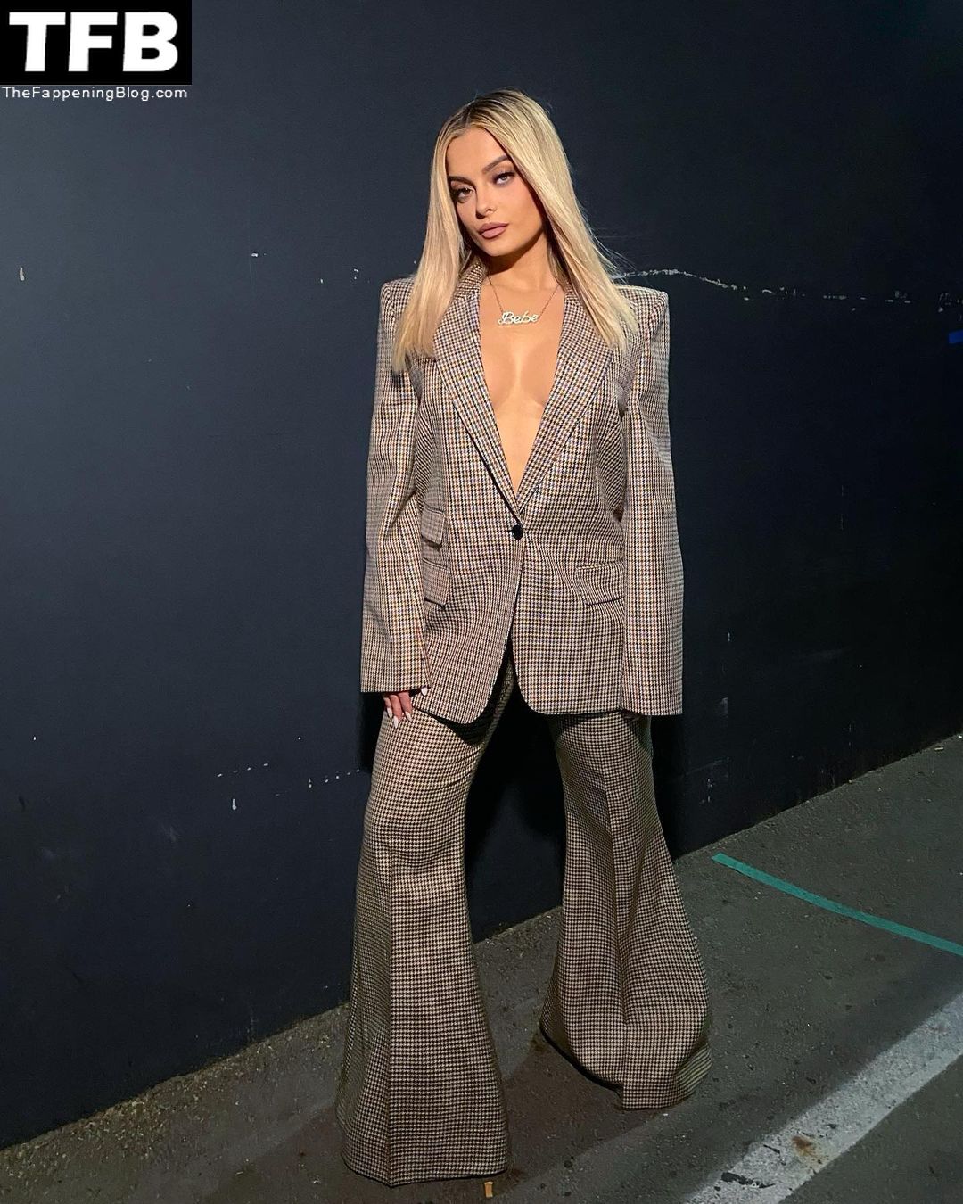 La chanteuse Bebe Rexha pose sans soutien-gorge, montrant son joli décolleté avec ses petits seins, posant en tailleur-pantalon – Instagram, 24/10/2021.