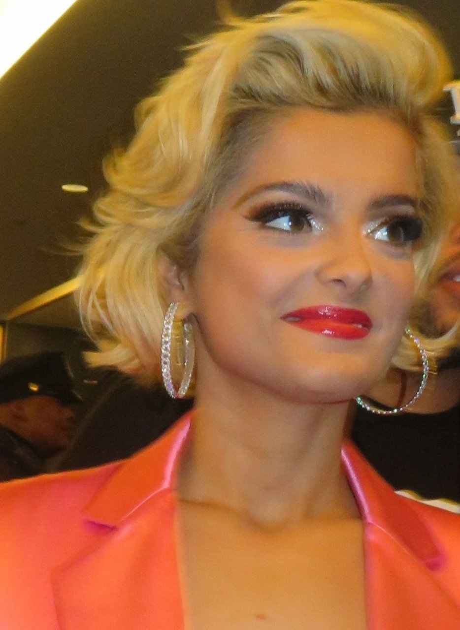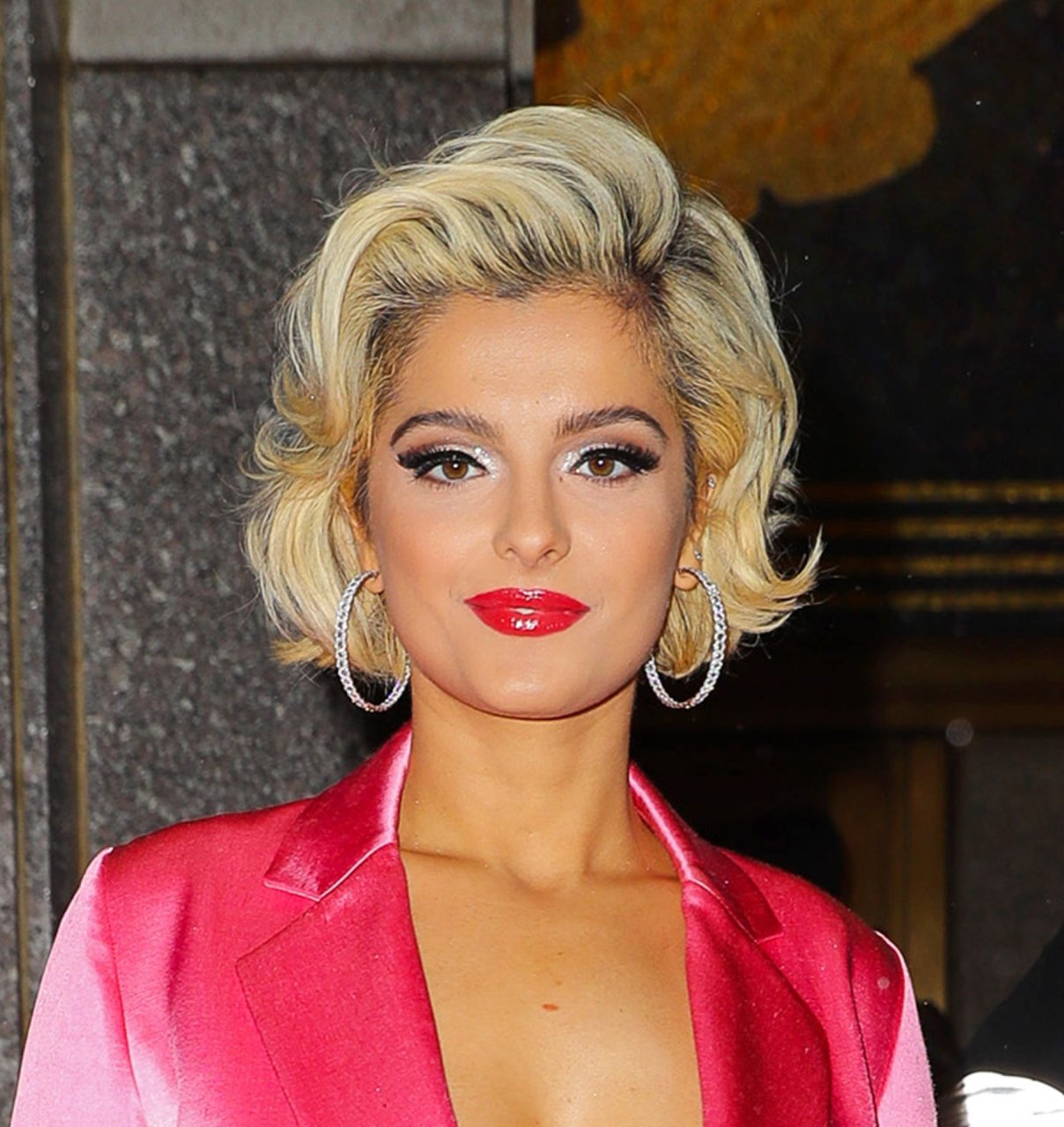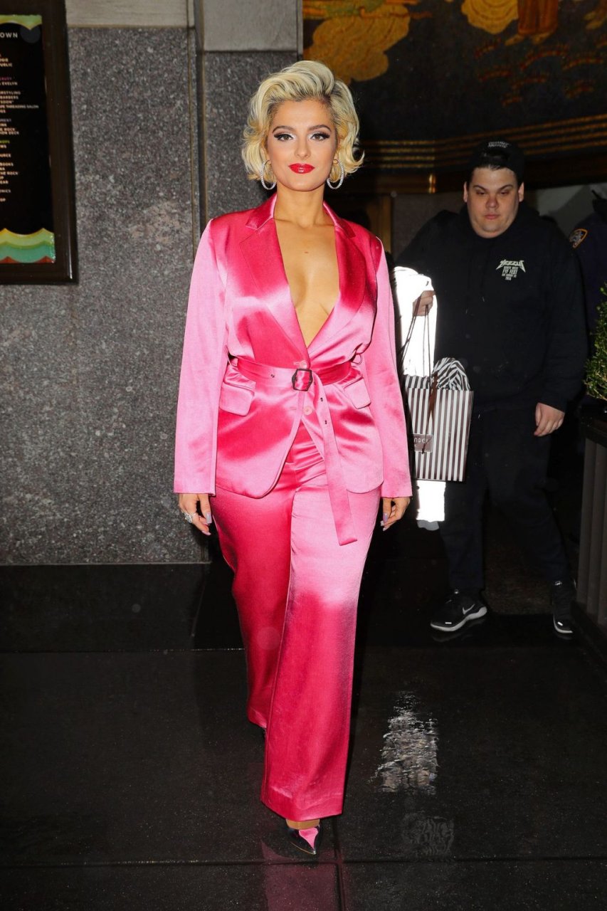 La chanteuse Bebe Rexha apparaît sans soutien-gorge dans un costume en satin fuchsia en quittant The Tonight Show Starring Jimmy Fallon à New York, le 20/12/2018.