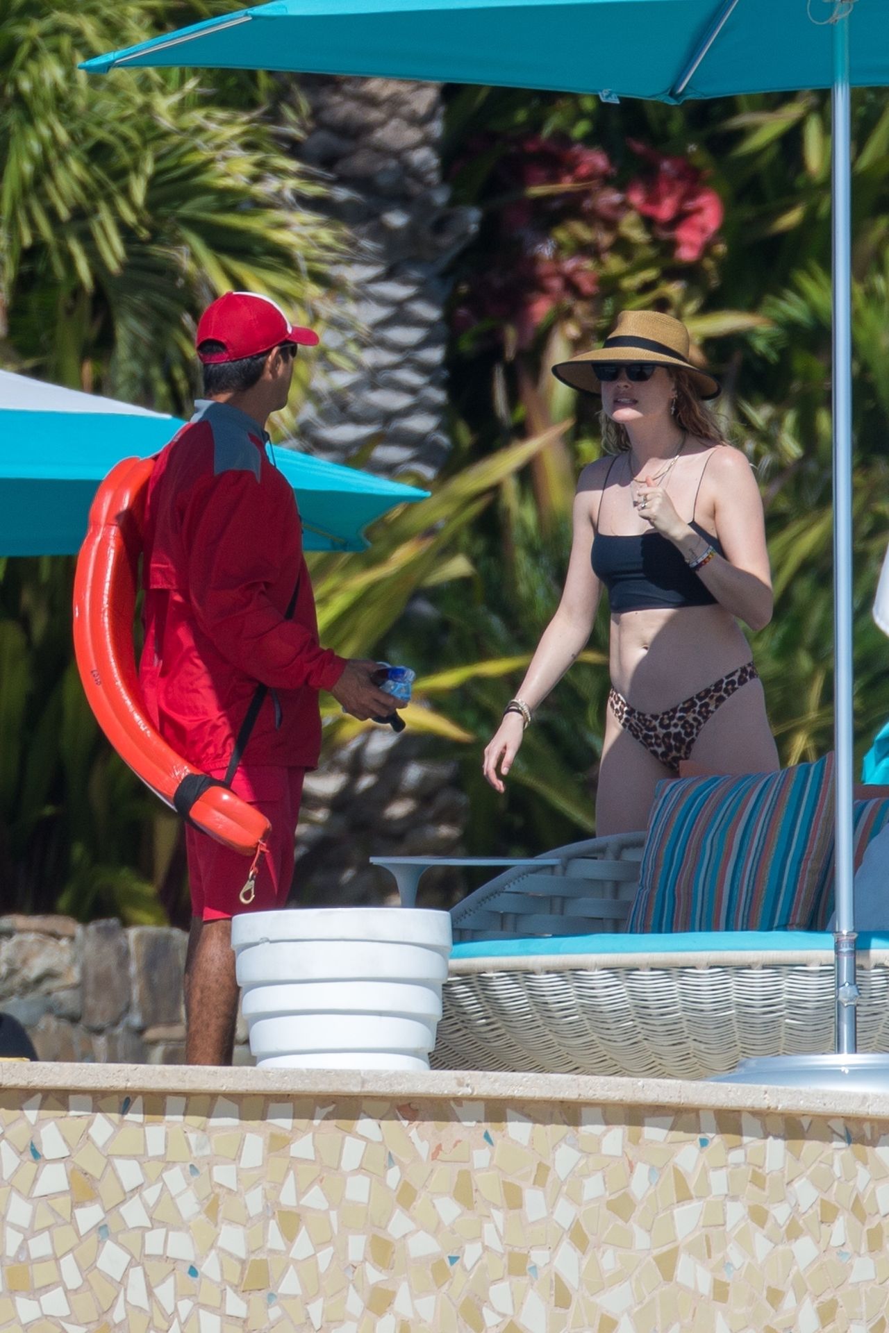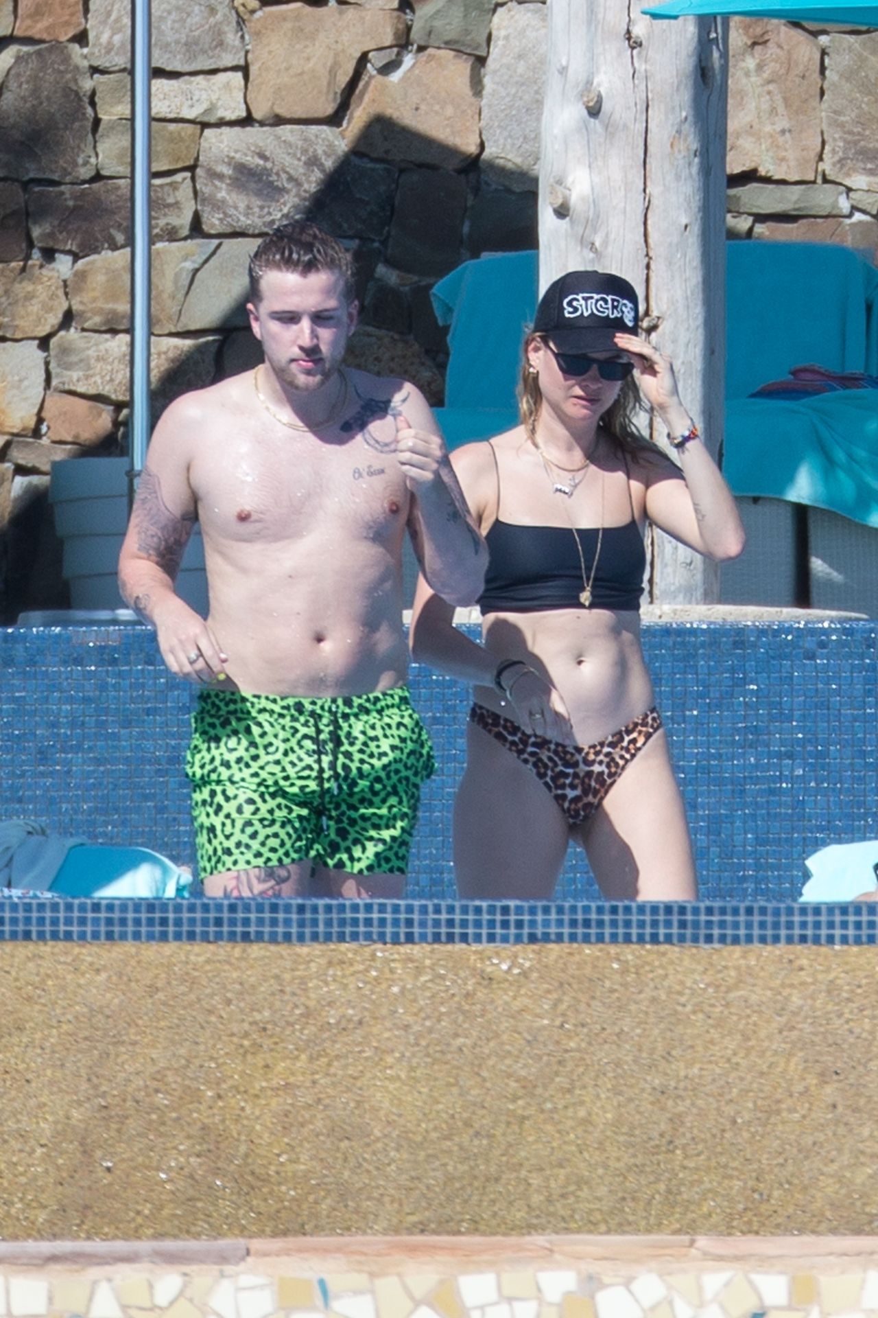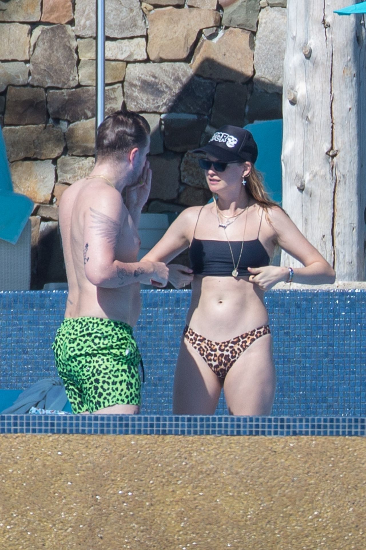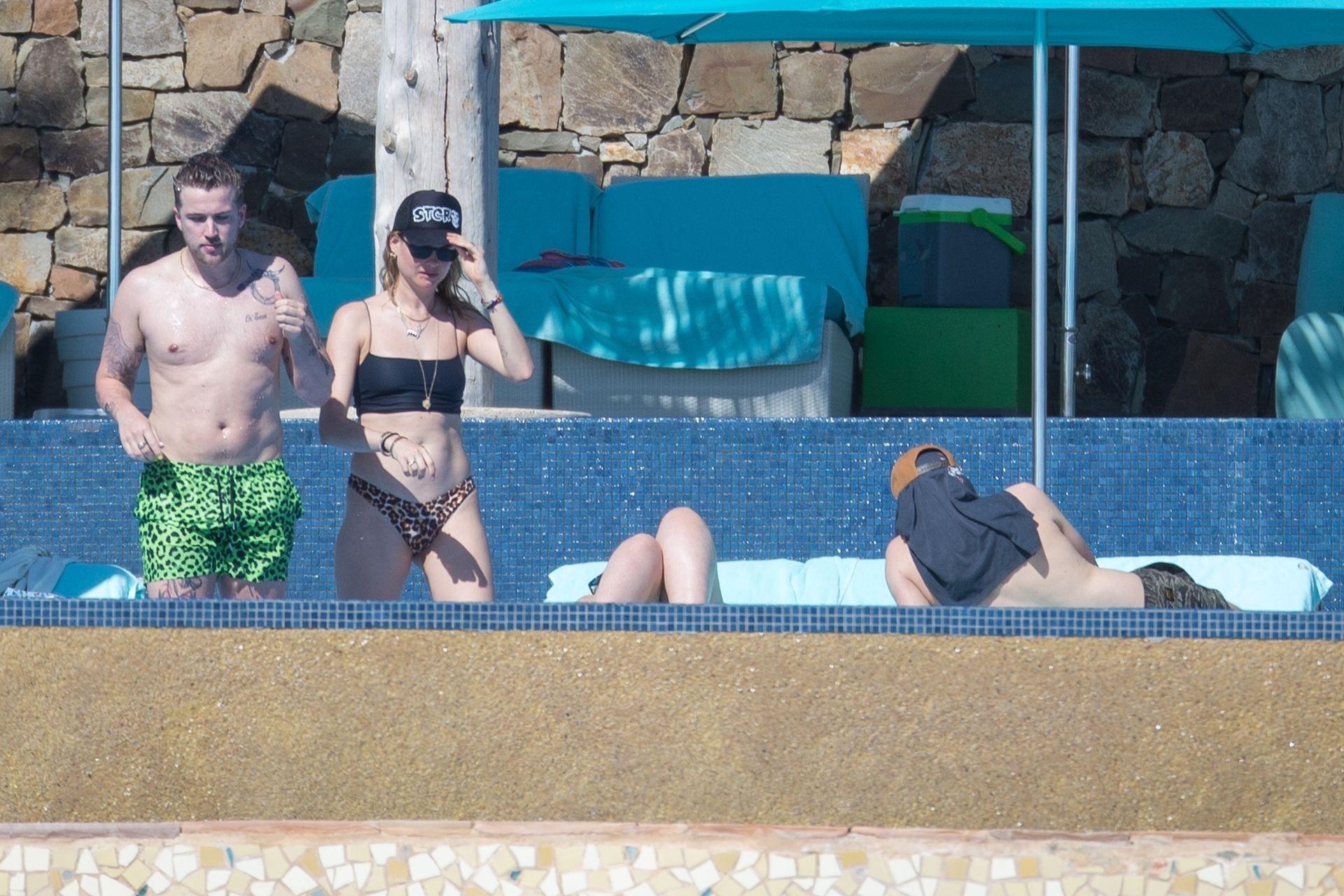 Behati Prinsloo profite du soleil avec des amis à Cabo, 01/12/2020. Le mannequin de Victoria’s Secret a exhibé sa silhouette élancée dans un haut de bikini noir et un string imprimé léopard alors qu’elle se détendait dans sa station avec des amis, sirotant des boissons fraîches et allant faire un plongeon dans la piscine.