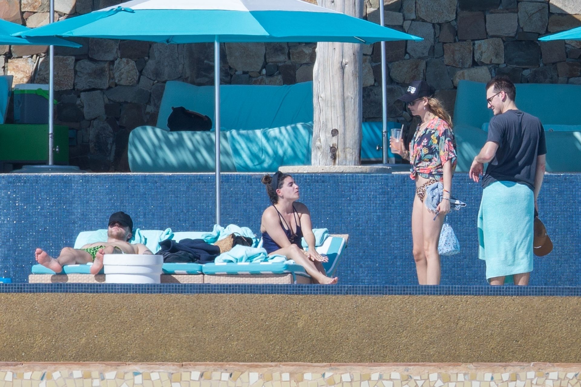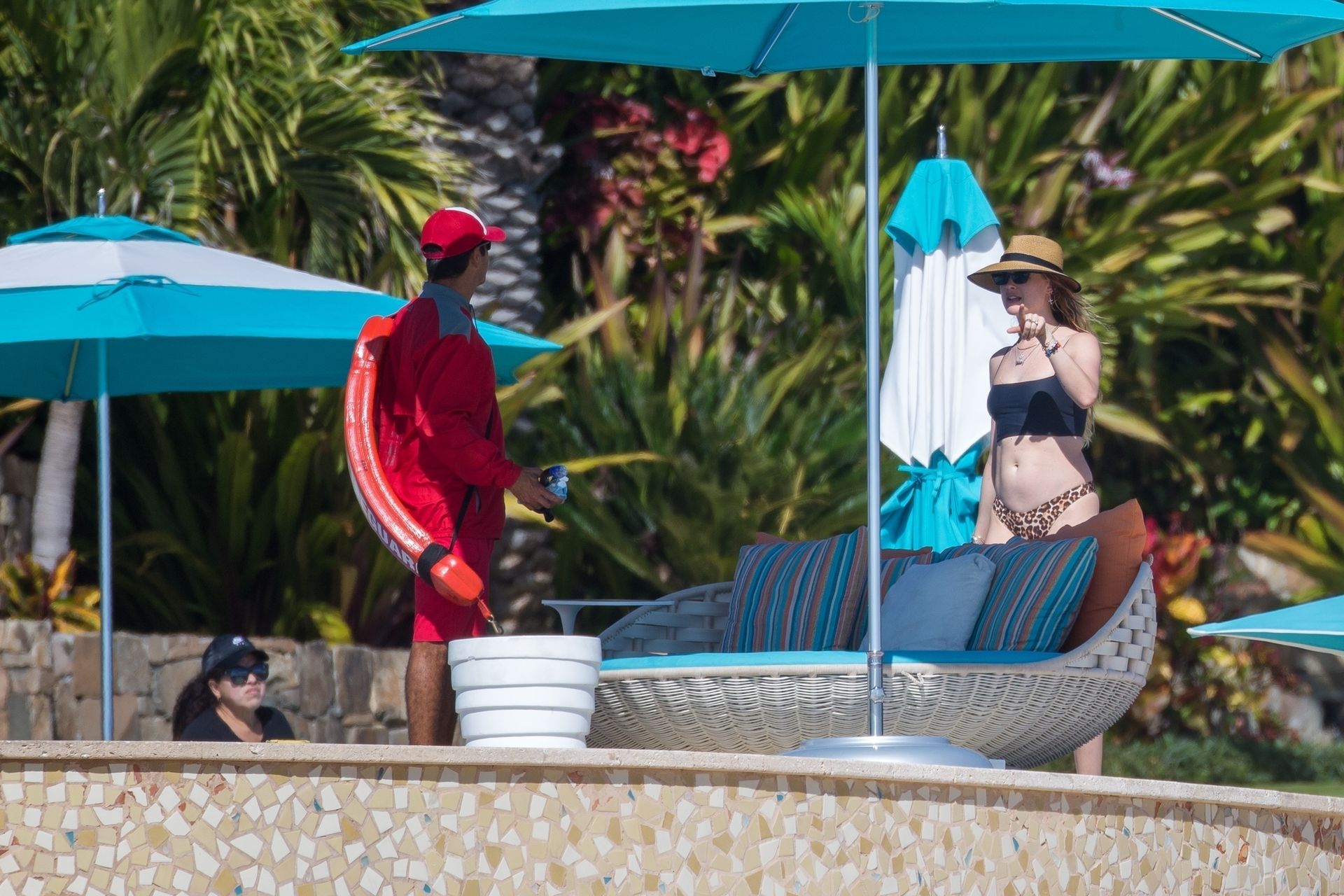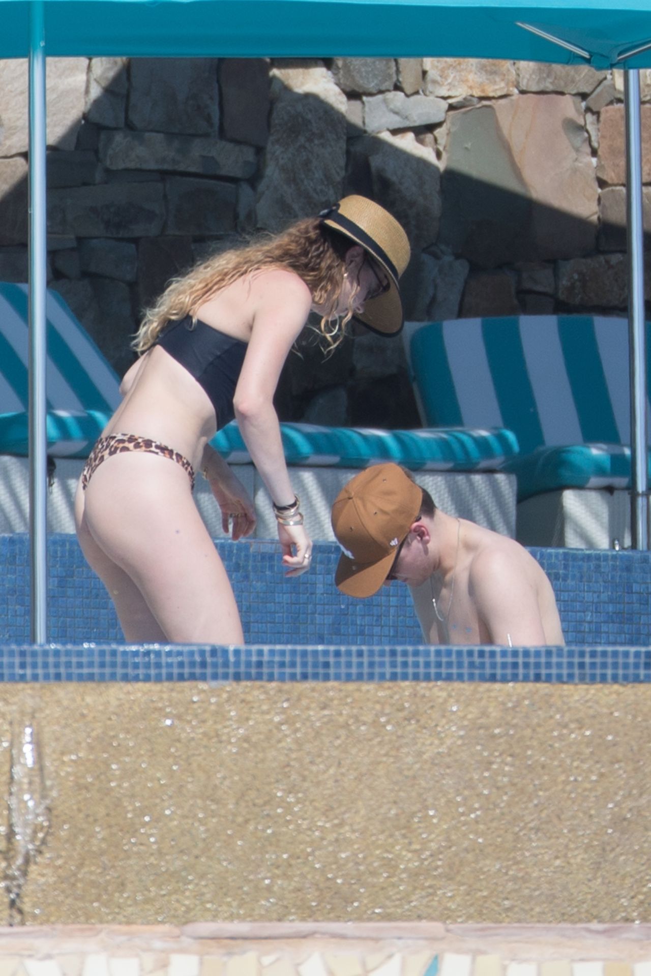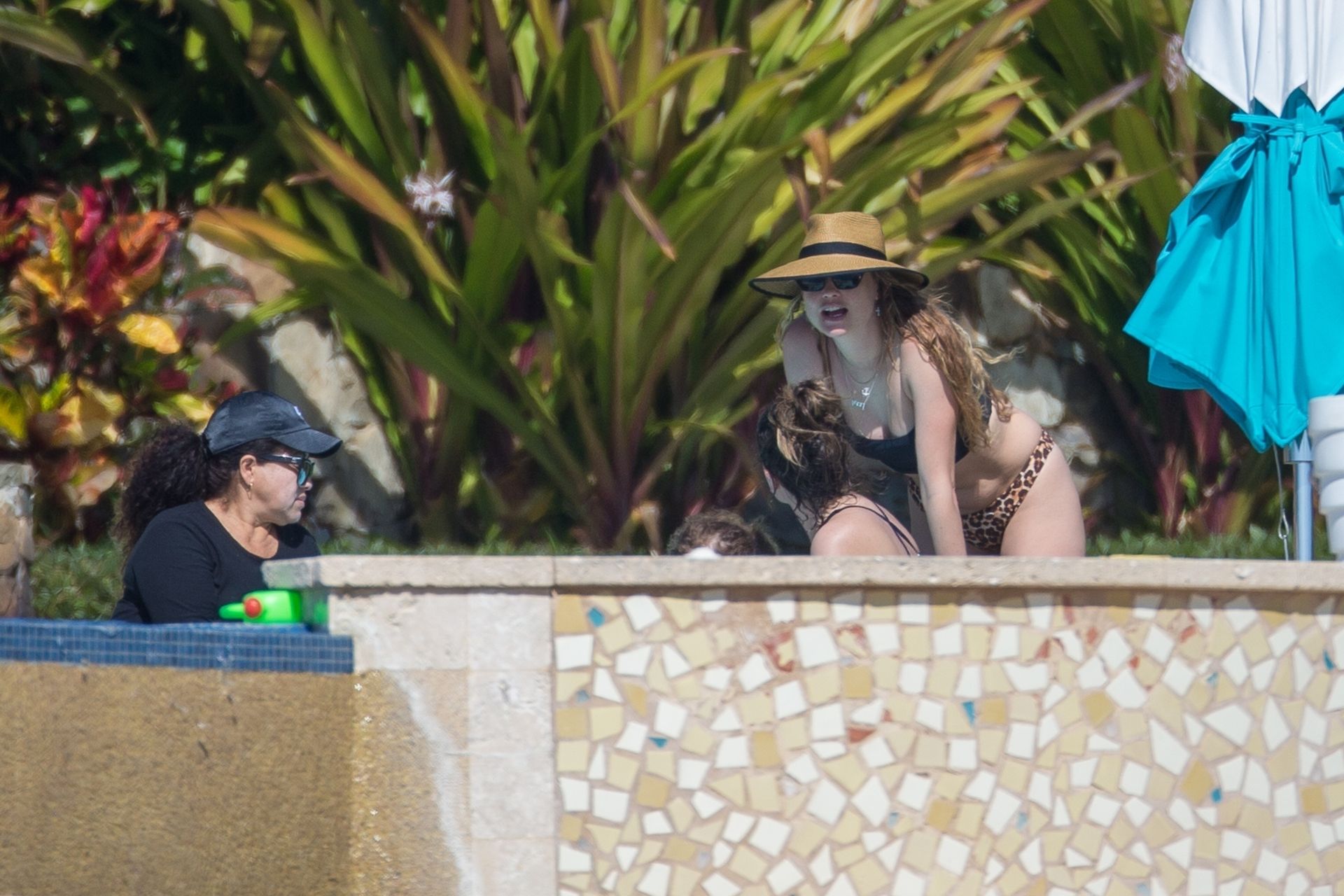 Behati Prinsloo profite du soleil avec des amis à Cabo, 01/12/2020. Le mannequin de Victoria’s Secret a exhibé sa silhouette élancée dans un haut de bikini noir et un string imprimé léopard alors qu’elle se détendait dans sa station avec des amis, sirotant des boissons fraîches et allant faire un plongeon dans la piscine.