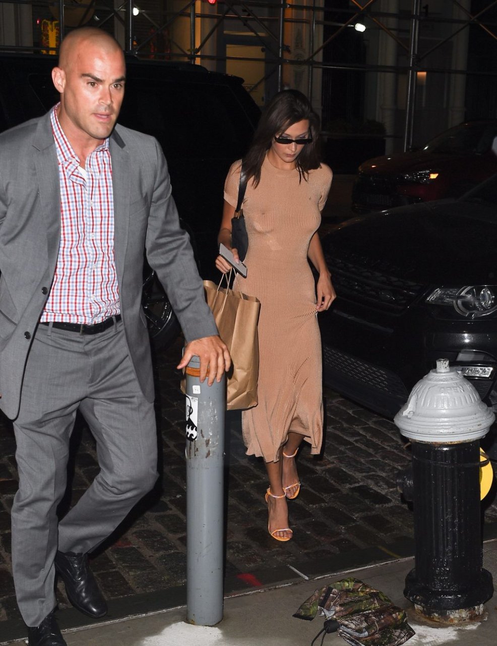 Le mannequin Bella Hadid est vue arrivant à l’appartement de sa sœur Gigi à New York, le 08/09/2018. Bella a choisi une robe beige moulante sans soutien-gorge. À cette tenue, elle a ajouté des chaussures cool.