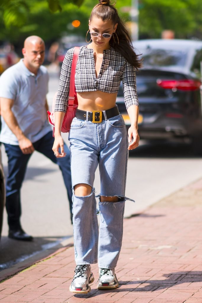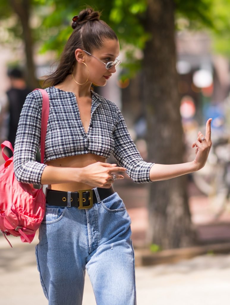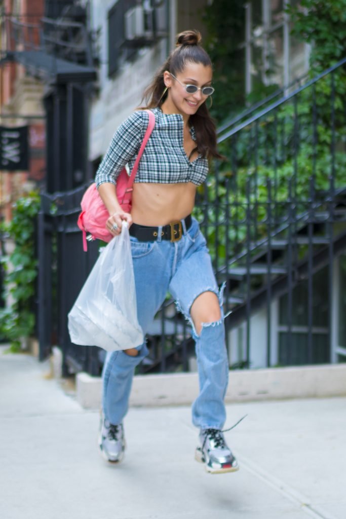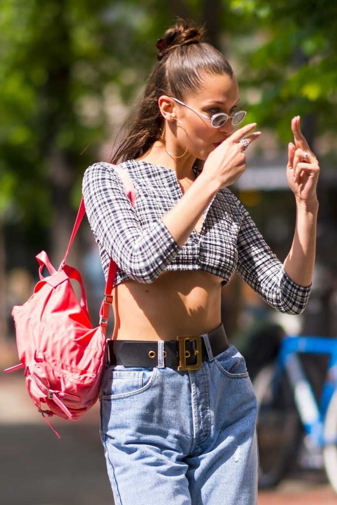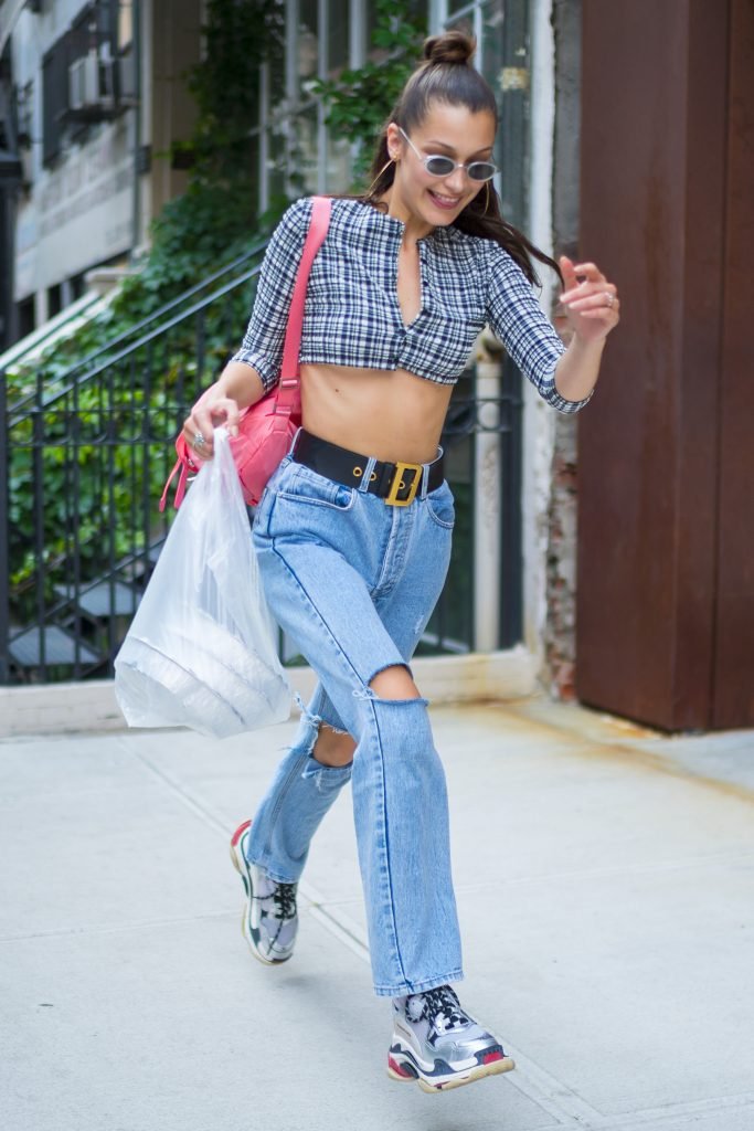 Mannequin et star de la télé-réalité, Bella Hadid a un problème de garde-robe alors qu’elle court avec les restes du déjeuner avec des amis au Bar Pitti à New York, 06/02/2018.