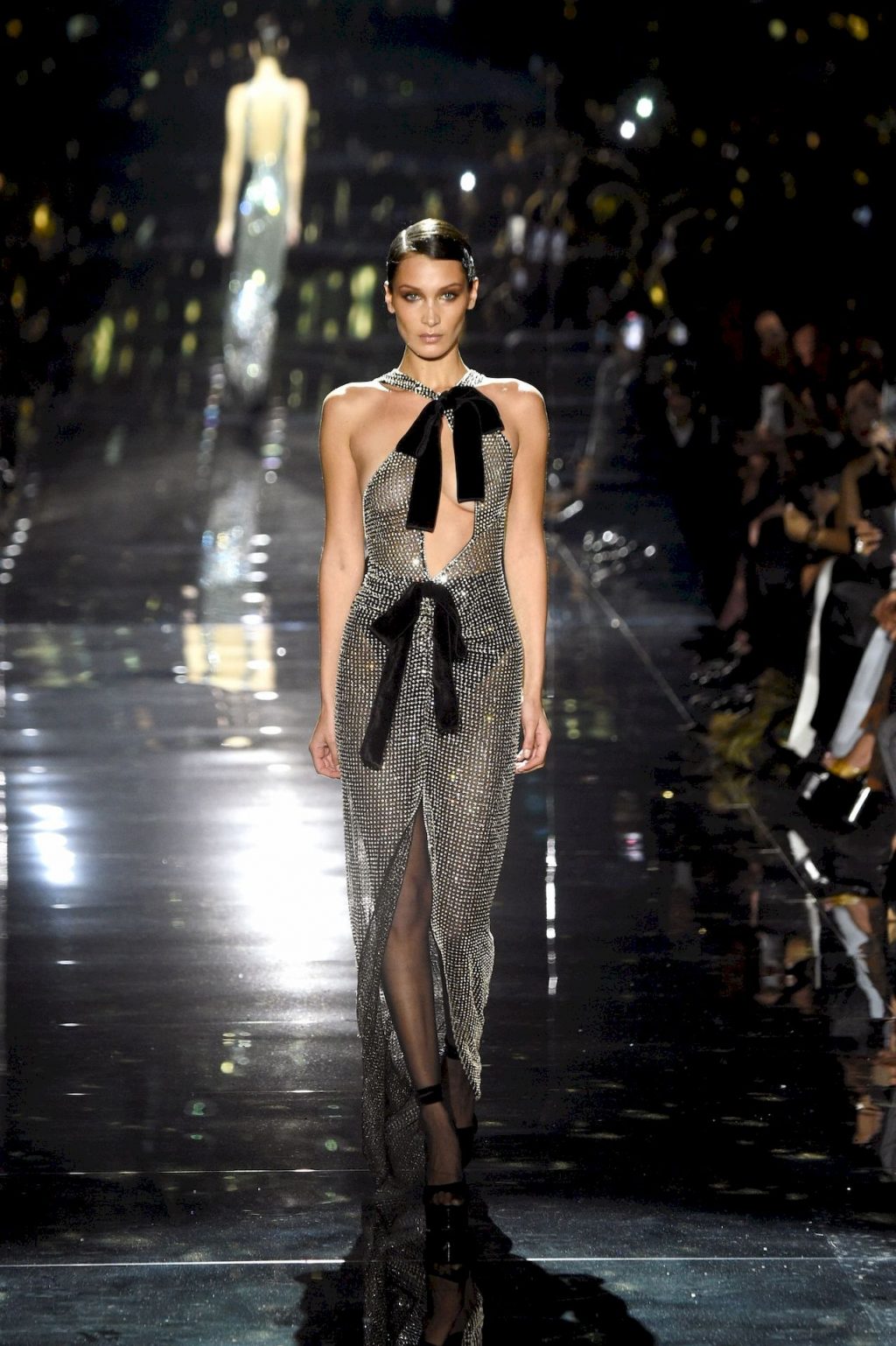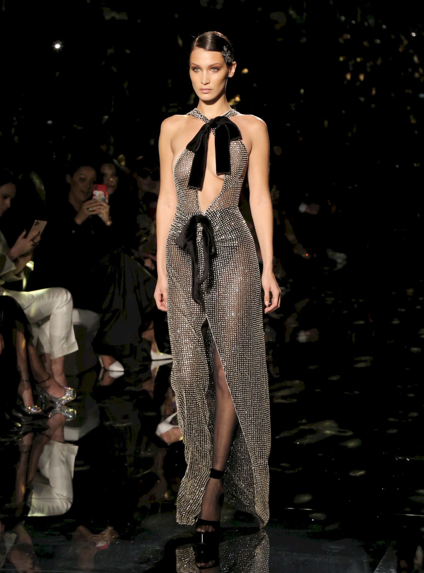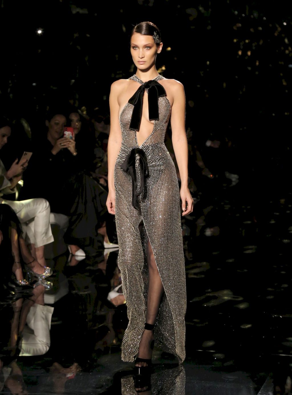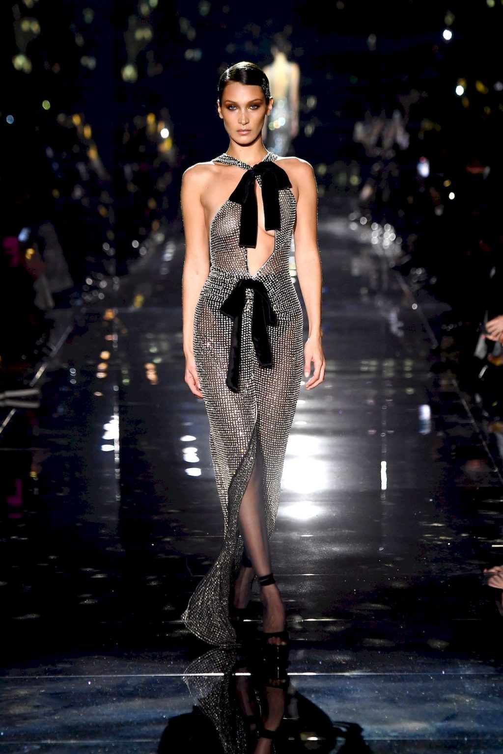 Model Bella Hadid walks the runway in a see-through dress, showing off her nude tits for all guests of the fashion show in Hollywood, 02/07/2020.