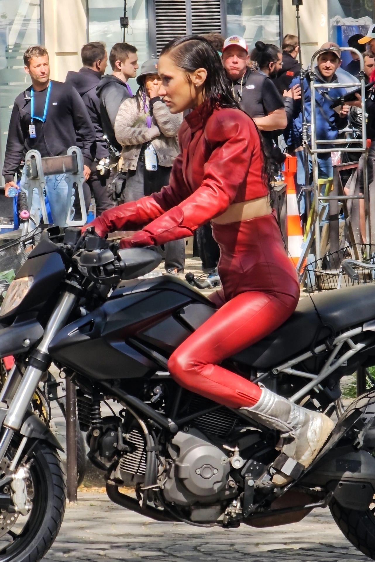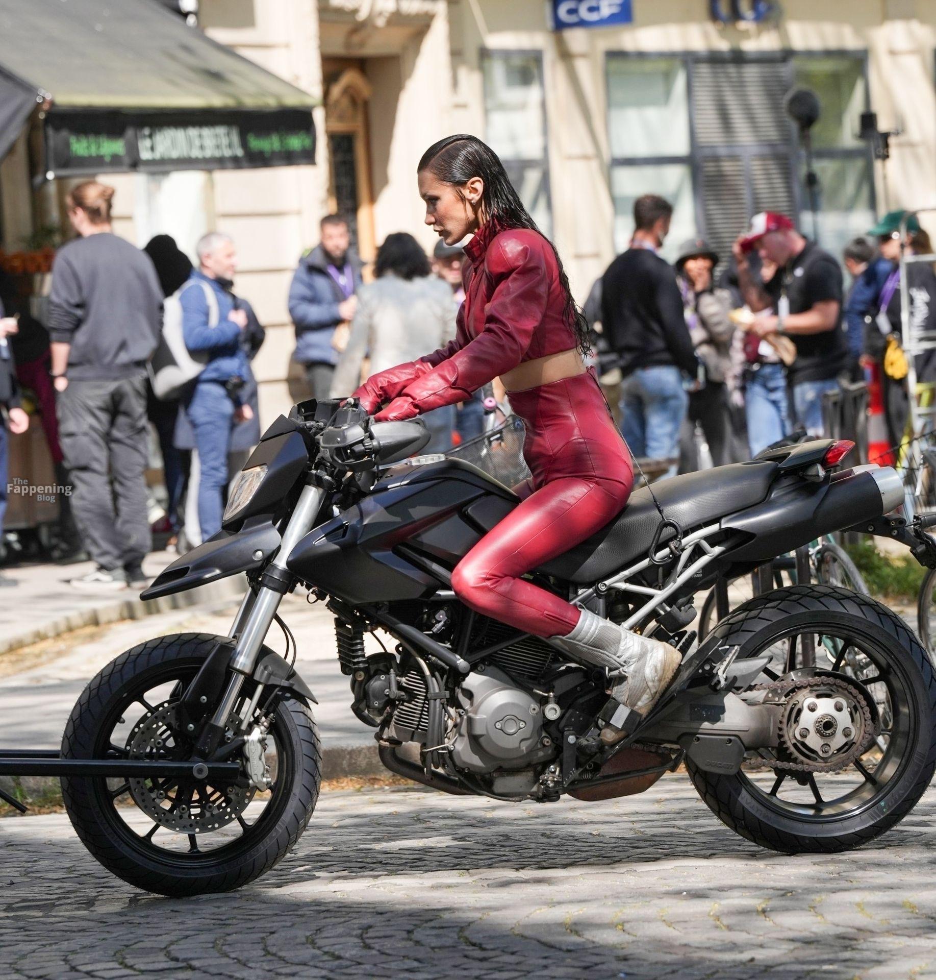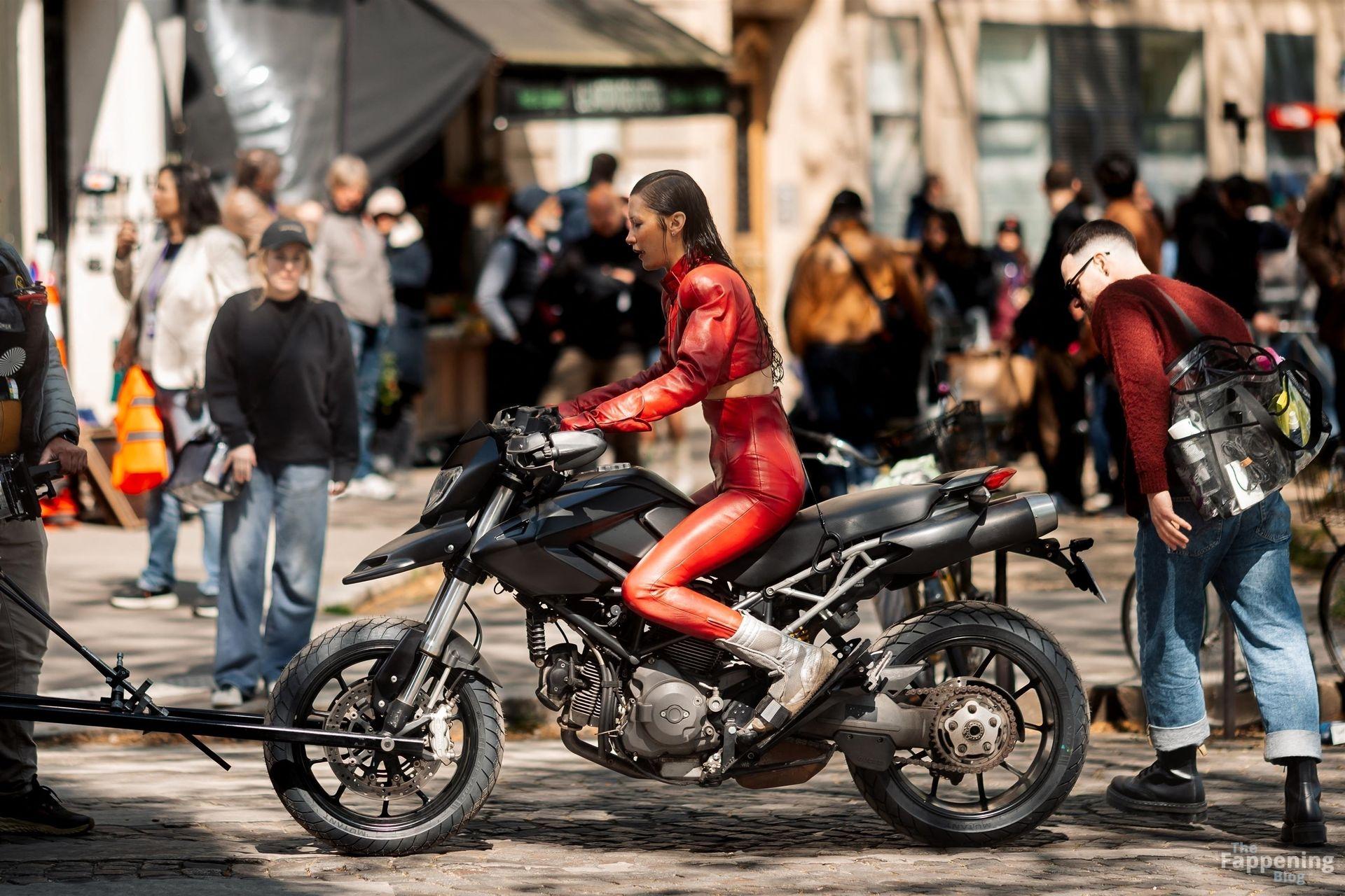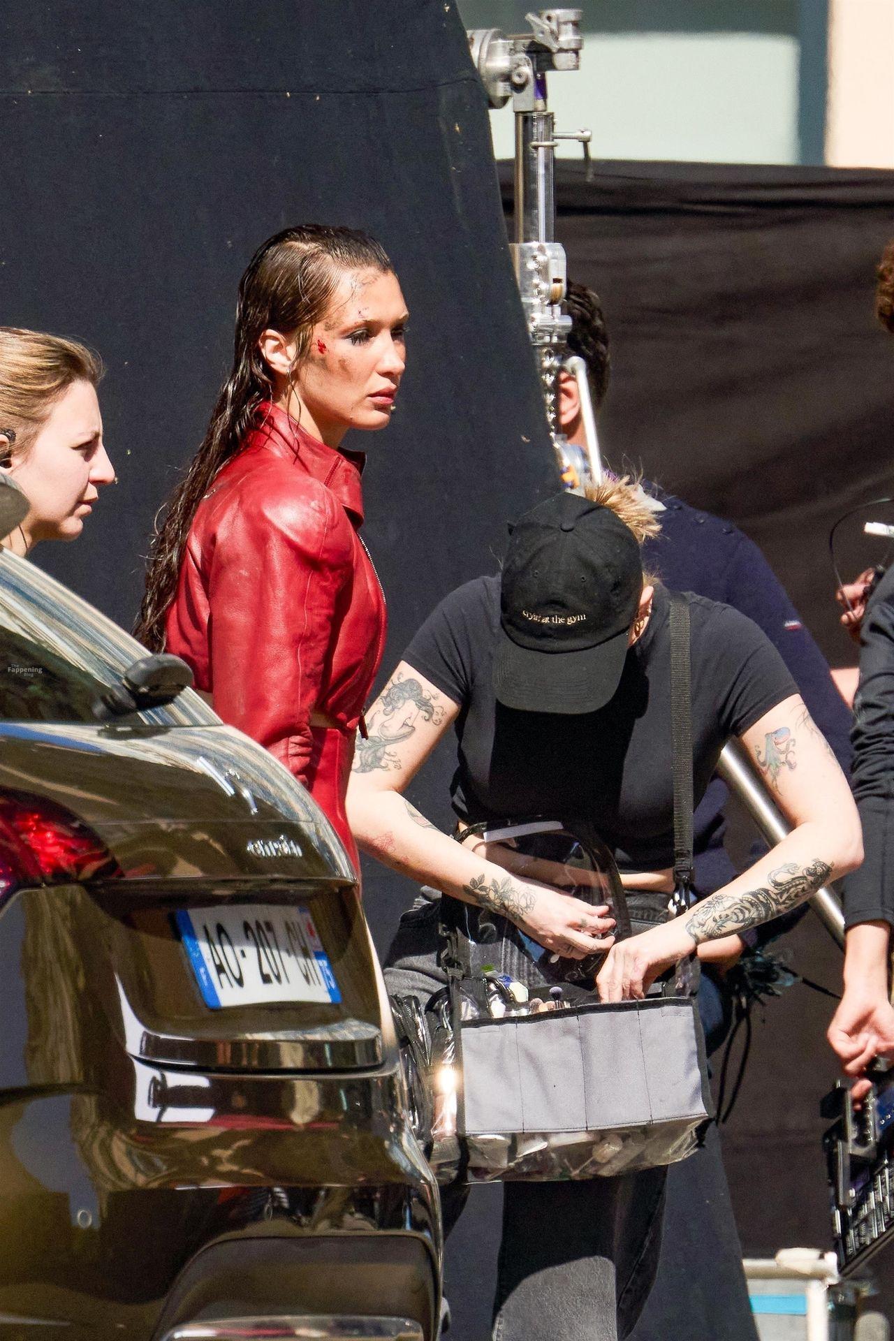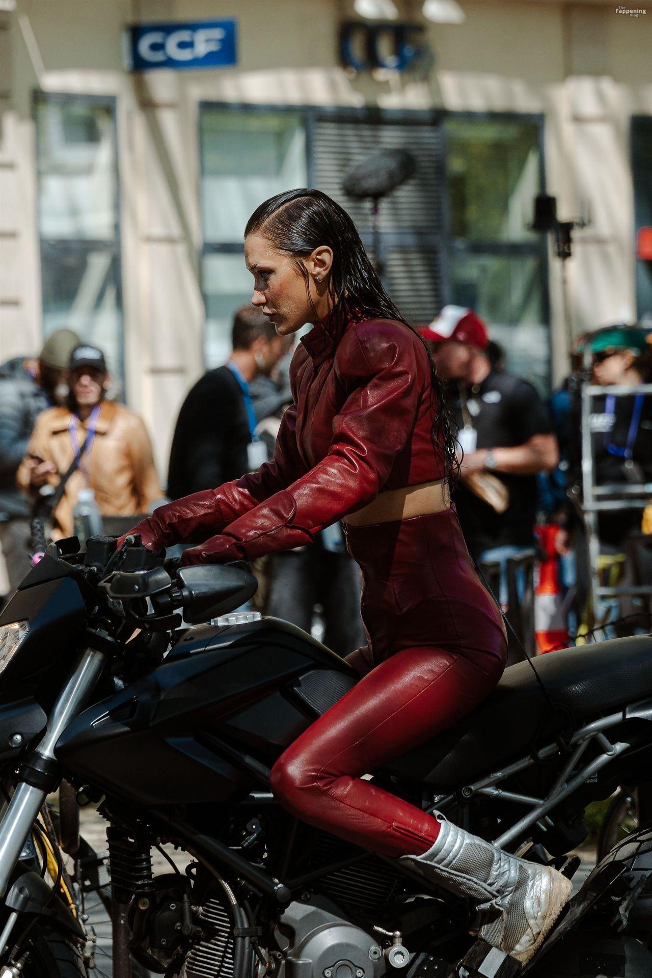 Bella Hadid a été photographiée à Paris, arborant une combinaison en cuir rouge flamboyant et chevauchant une moto. Après cette folle cascade avec un mannequin, elle joue les dures avec une vilaine blessure à la jambe pour une scène de la série « The Beauty » à Paris, France.