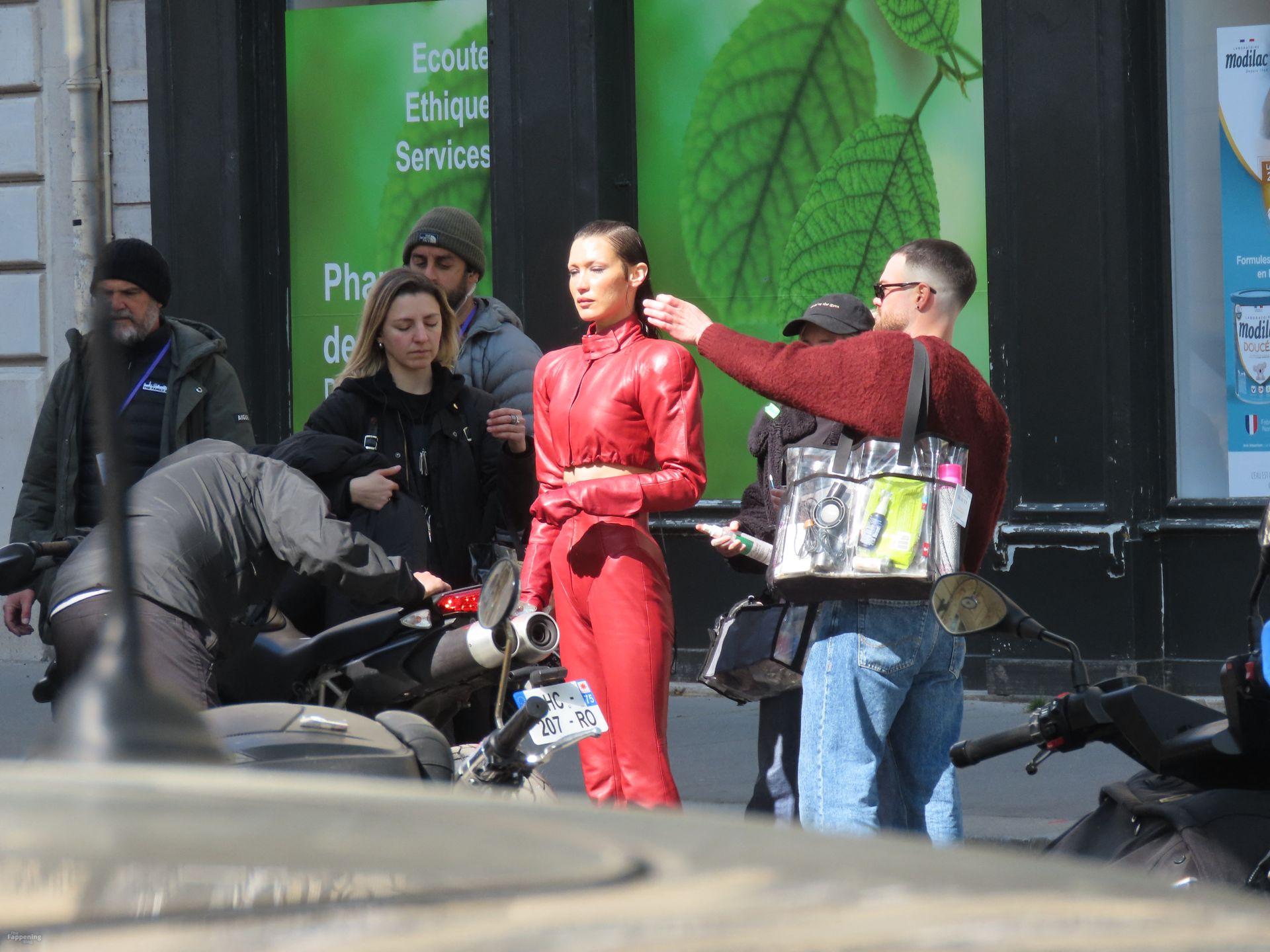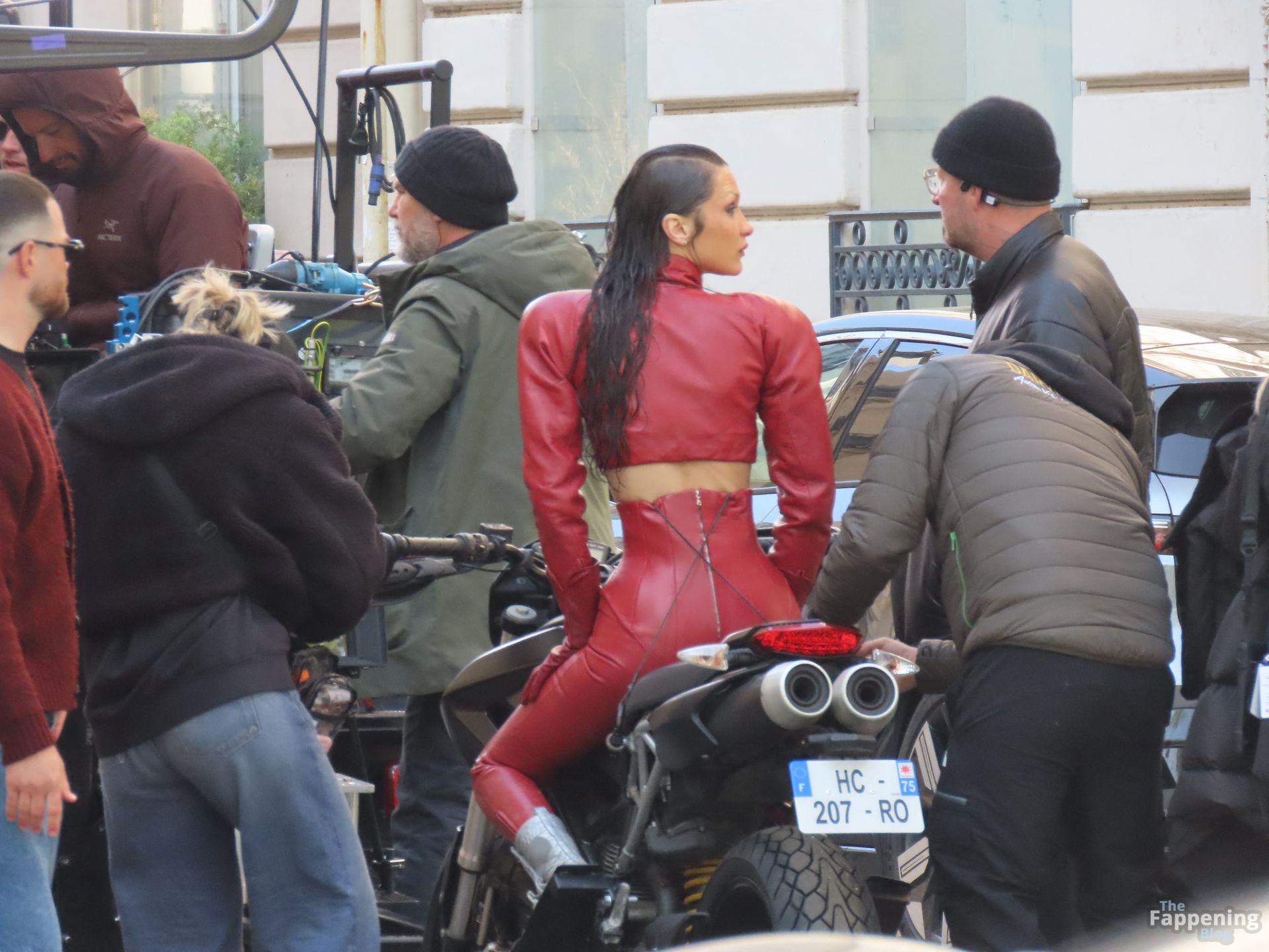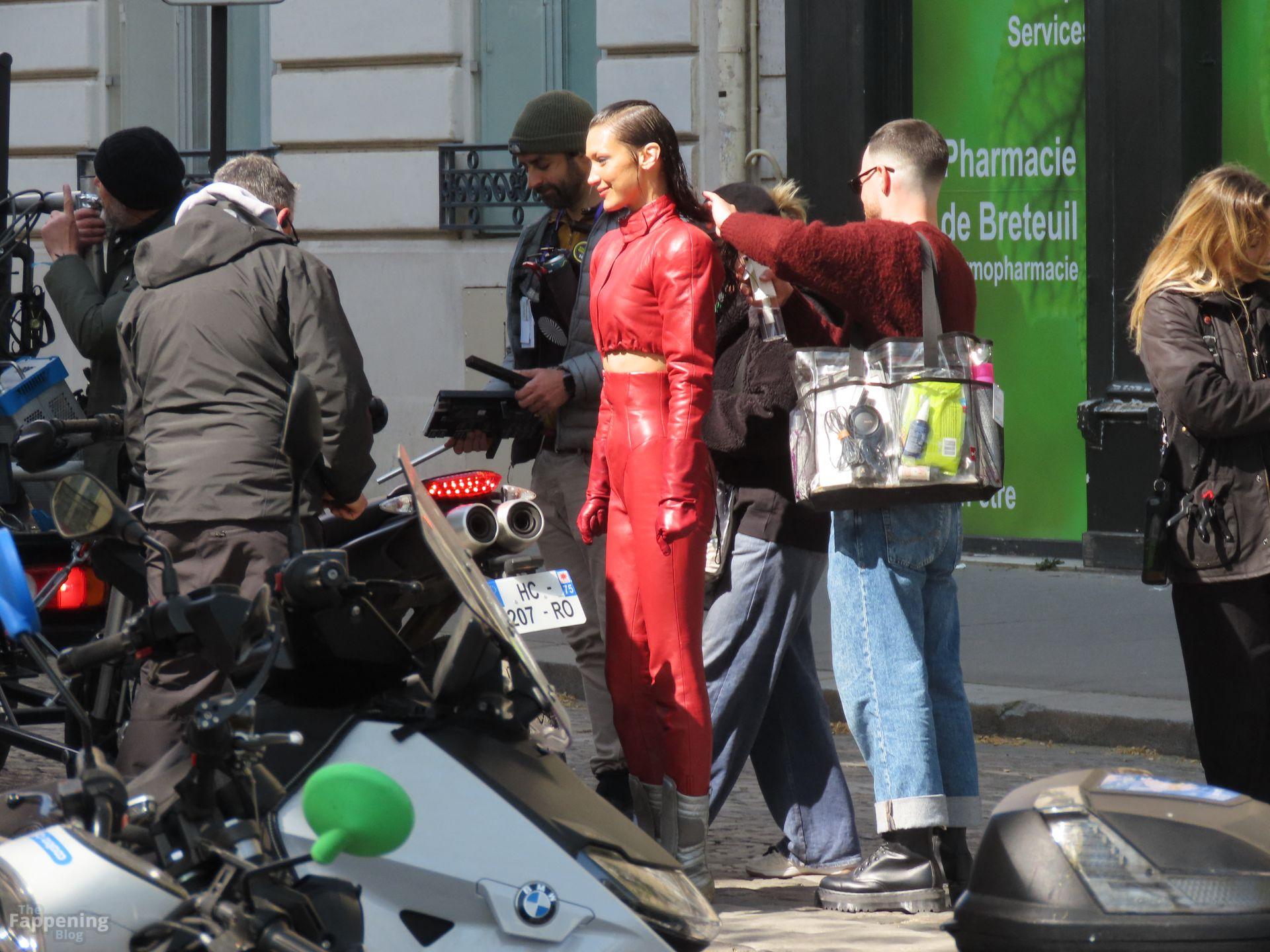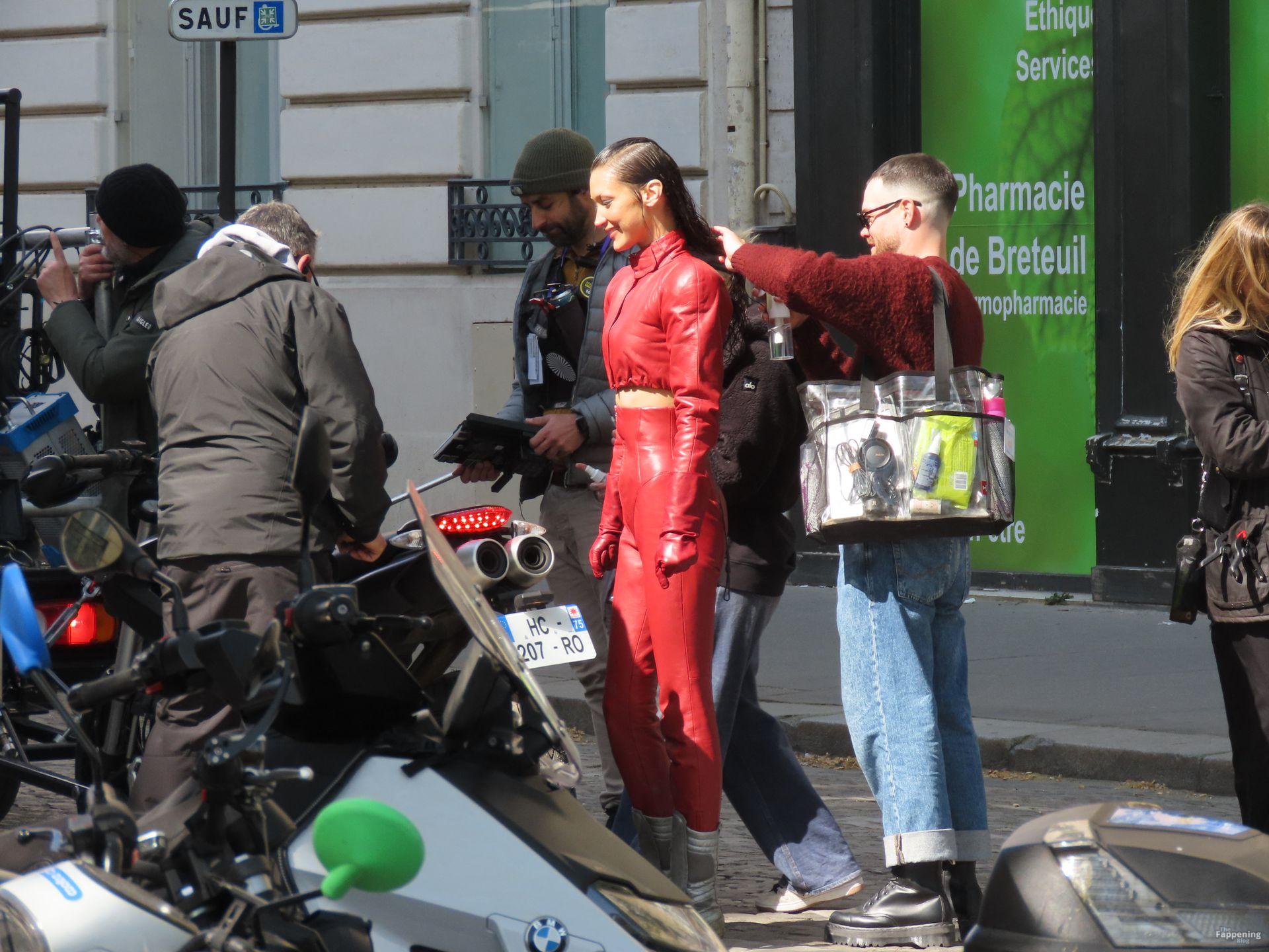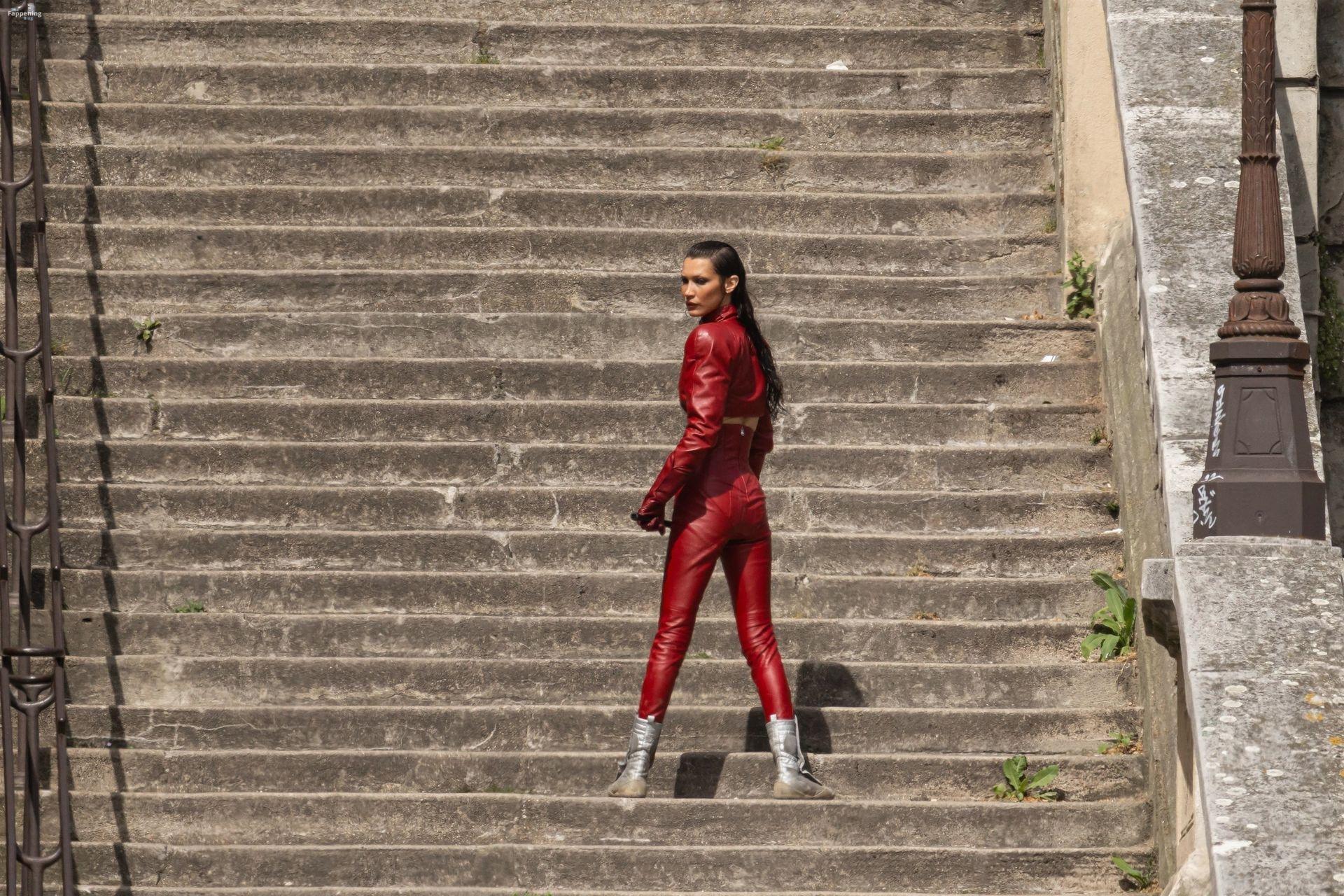 Bella Hadid a été photographiée à Paris, arborant une combinaison en cuir rouge flamboyant et chevauchant une moto. Après cette folle cascade avec un mannequin, elle joue les dures avec une vilaine blessure à la jambe pour une scène de la série « The Beauty » à Paris, France.