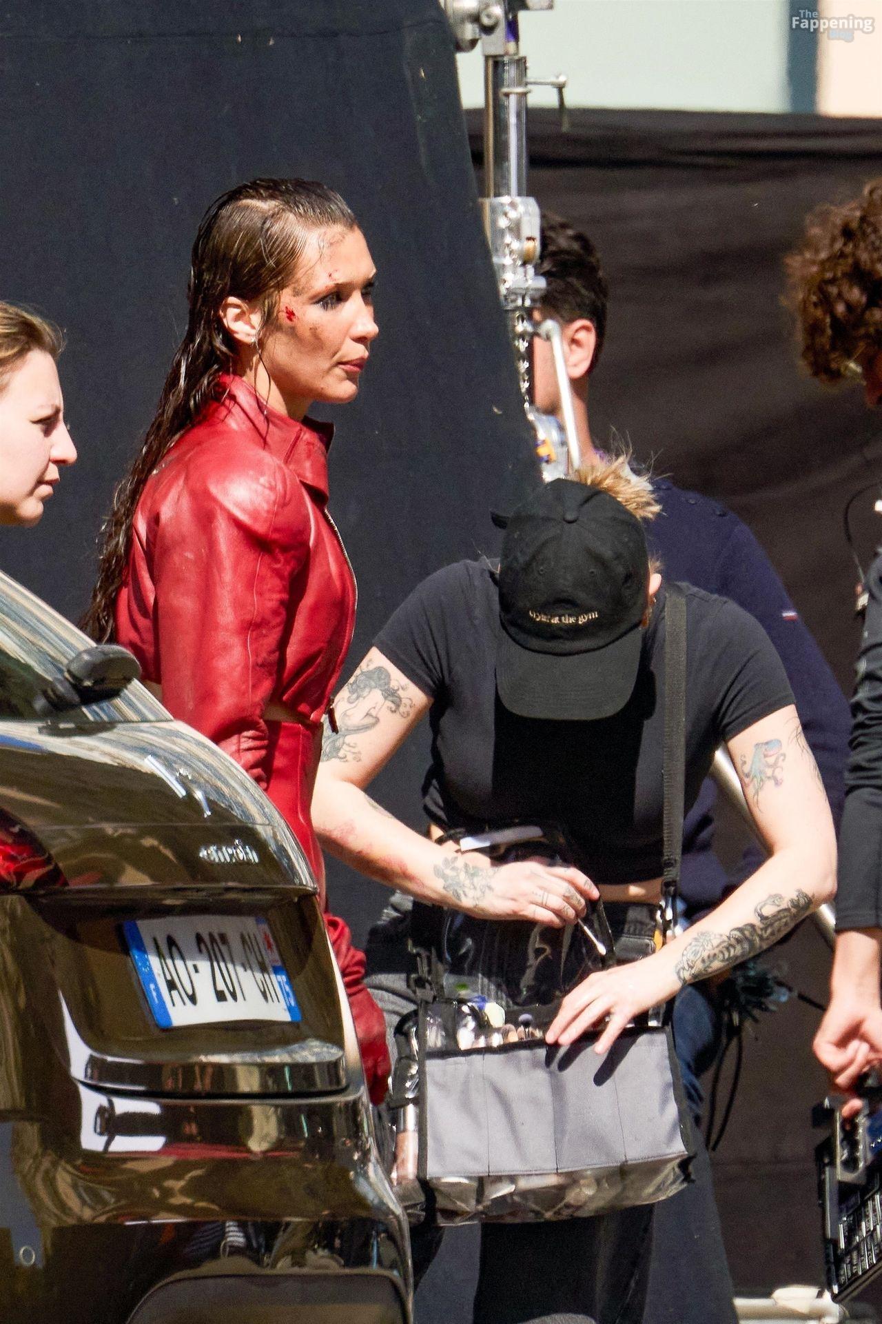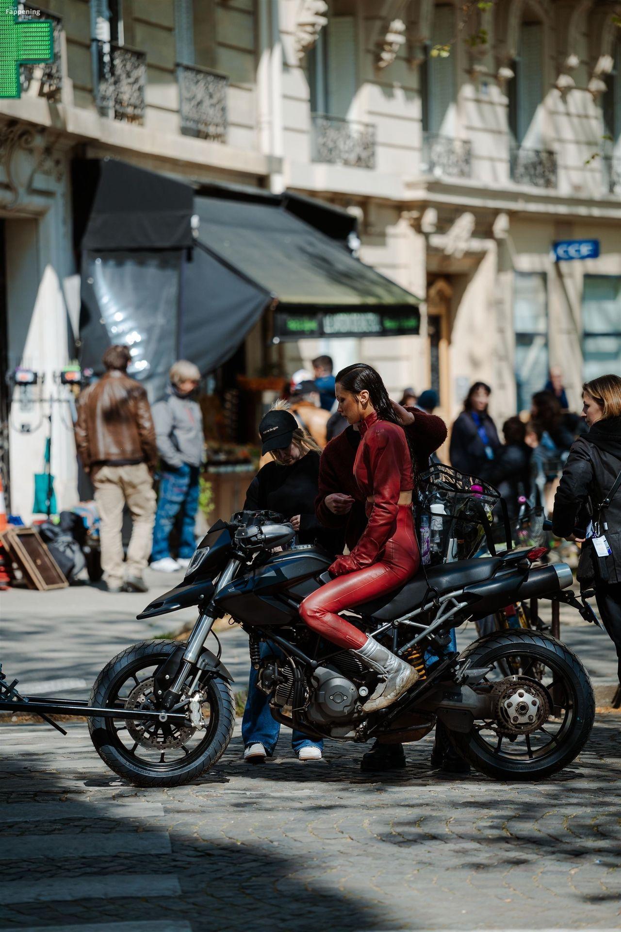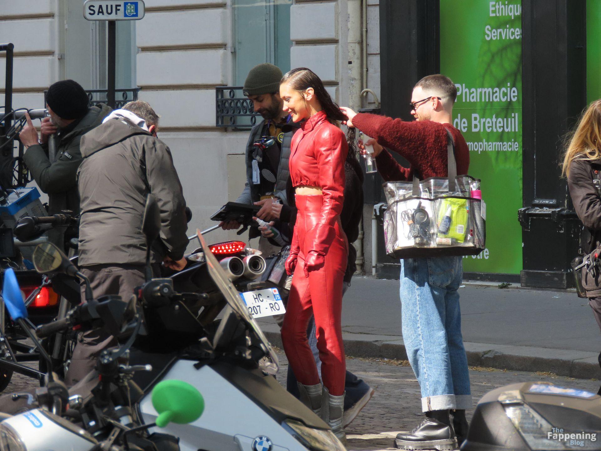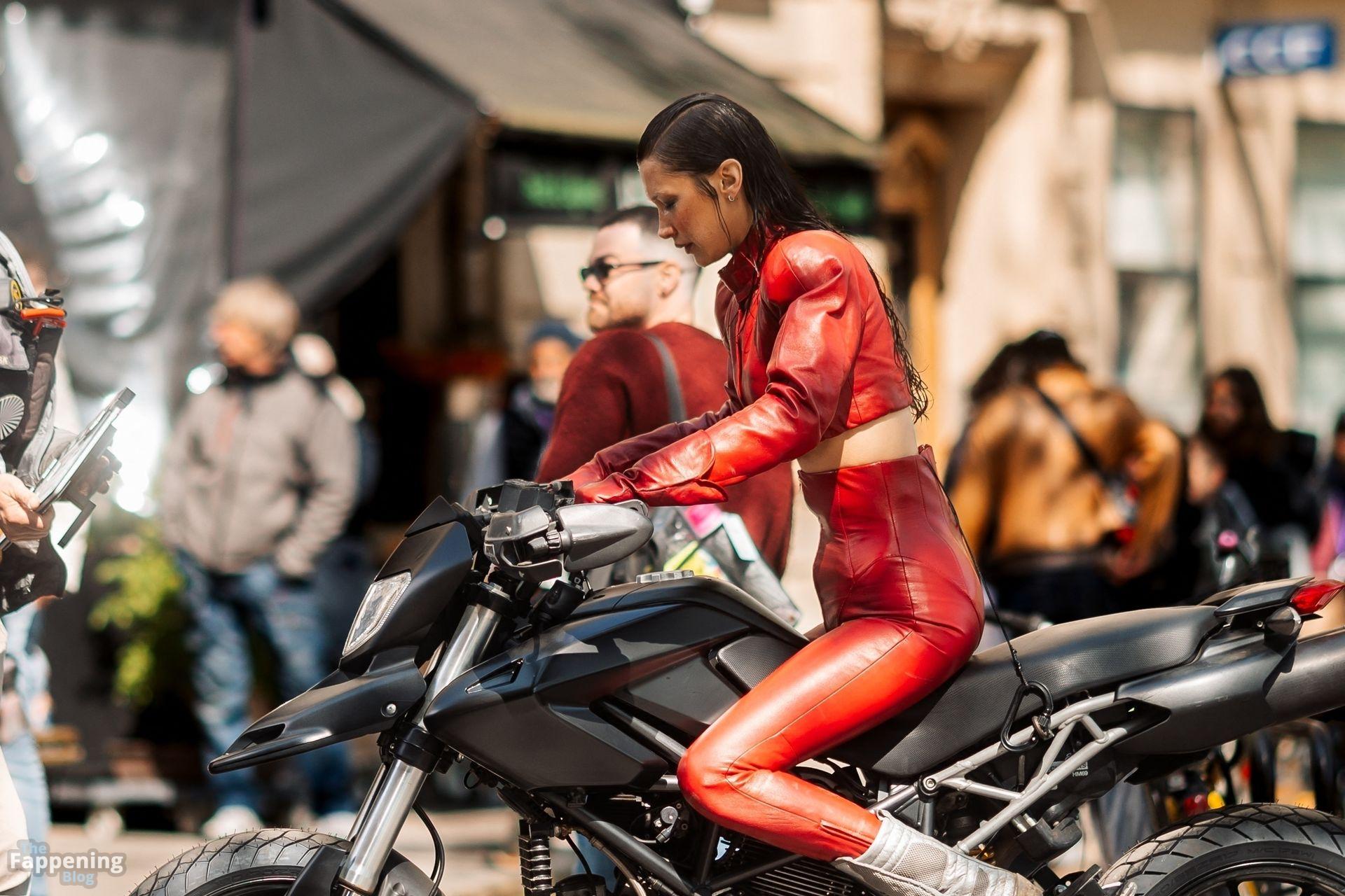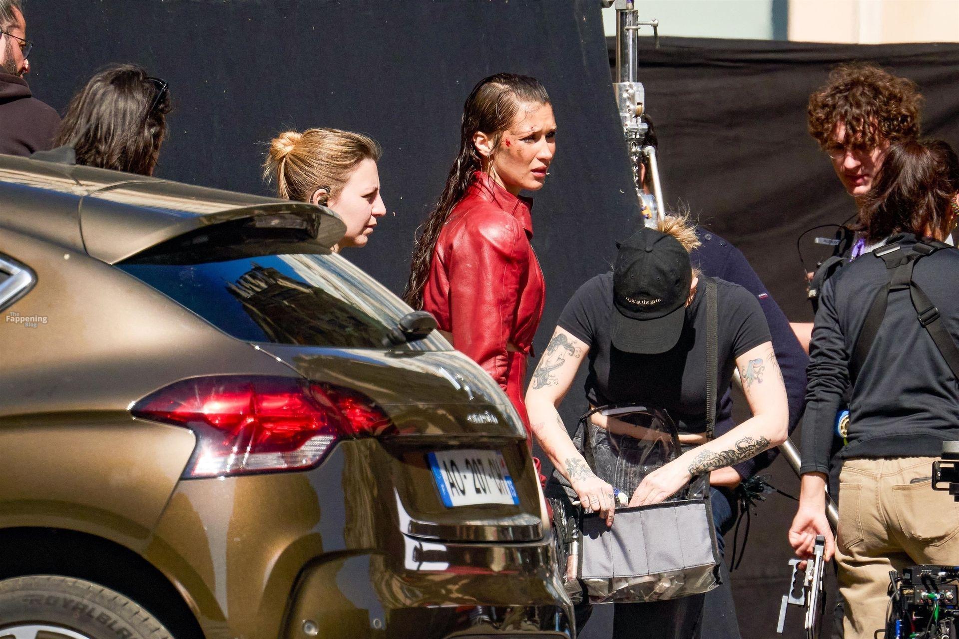 Bella Hadid a été photographiée à Paris, arborant une combinaison en cuir rouge flamboyant et chevauchant une moto. Après cette folle cascade avec un mannequin, elle joue les dures avec une vilaine blessure à la jambe pour une scène de la série « The Beauty » à Paris, France.