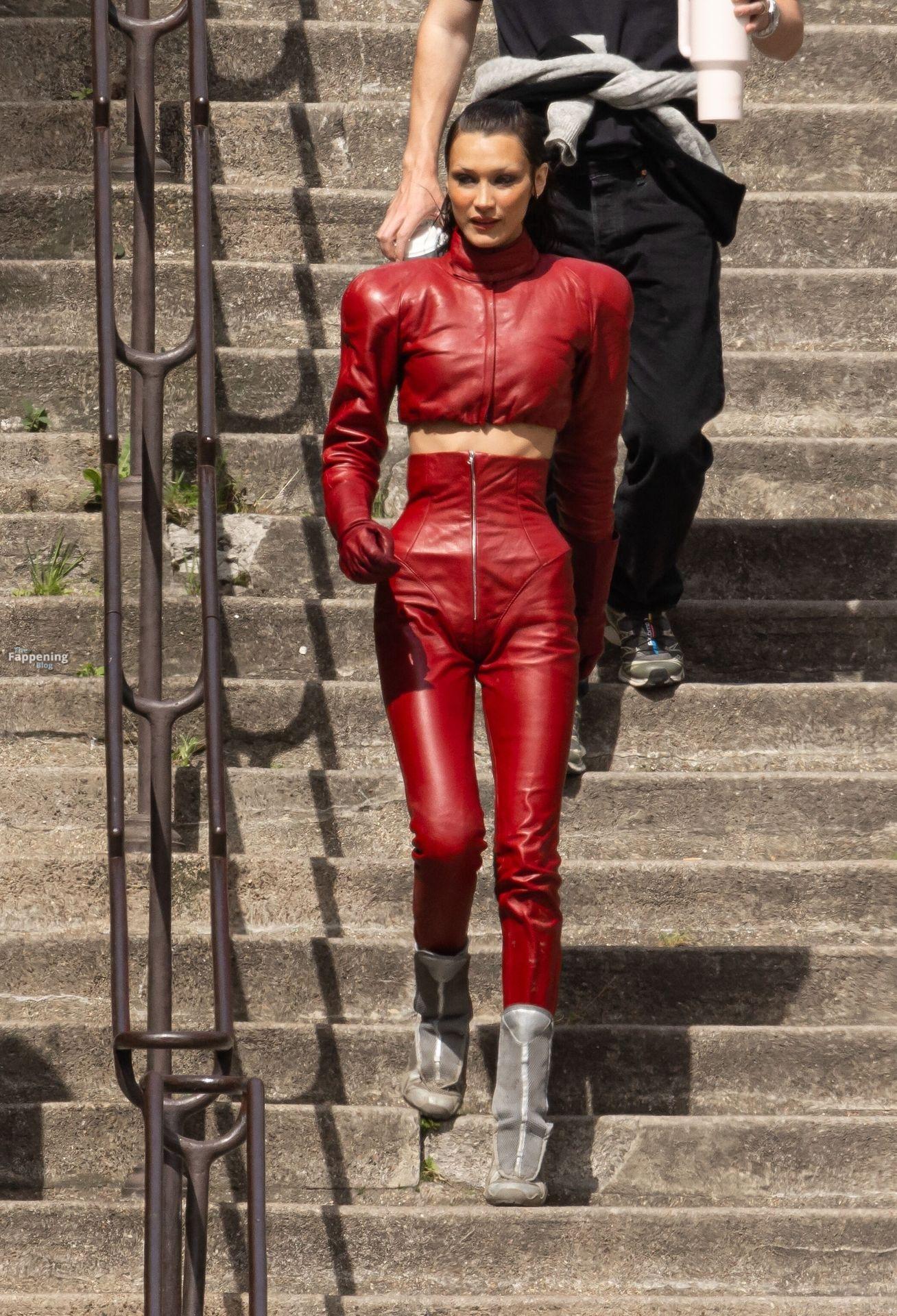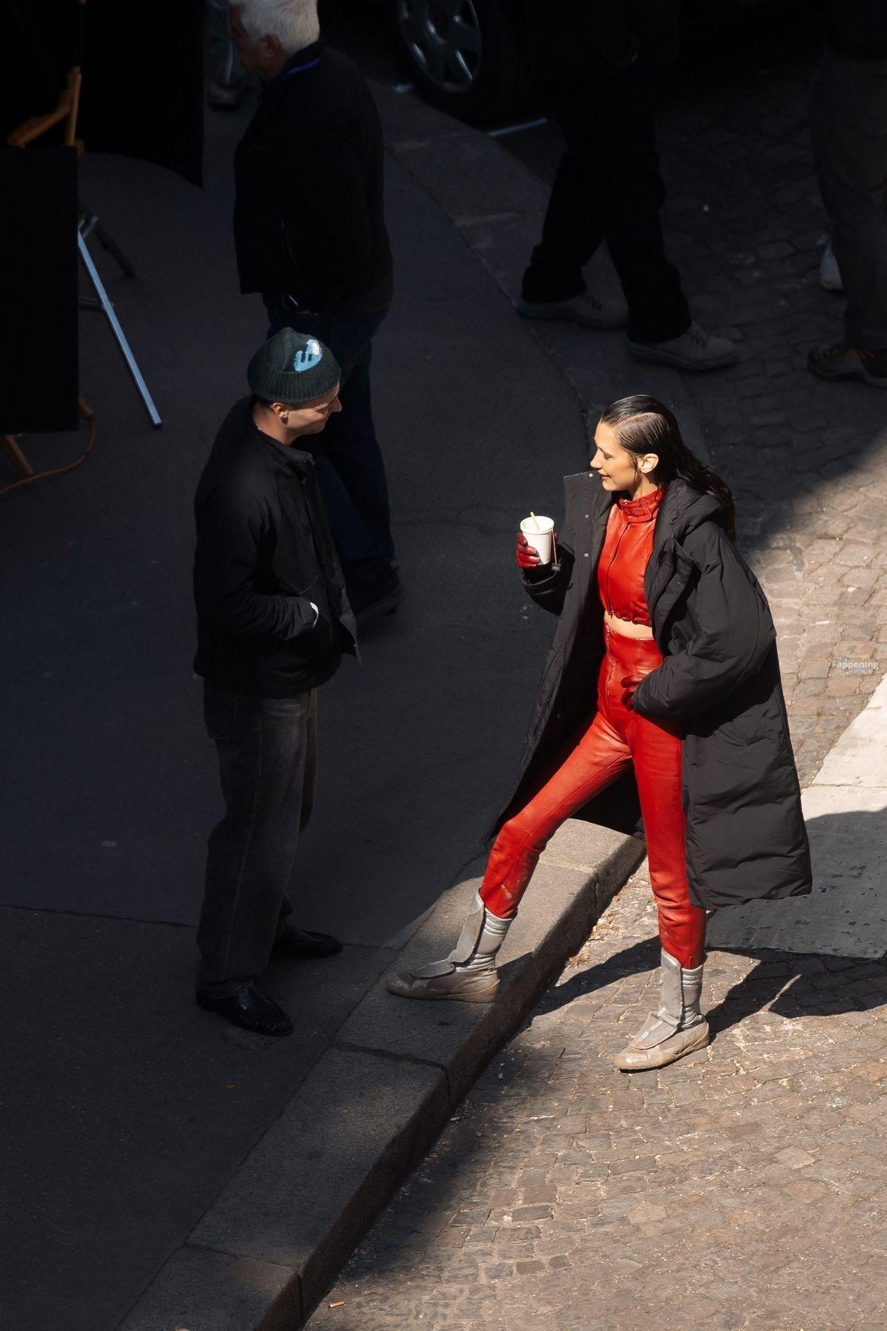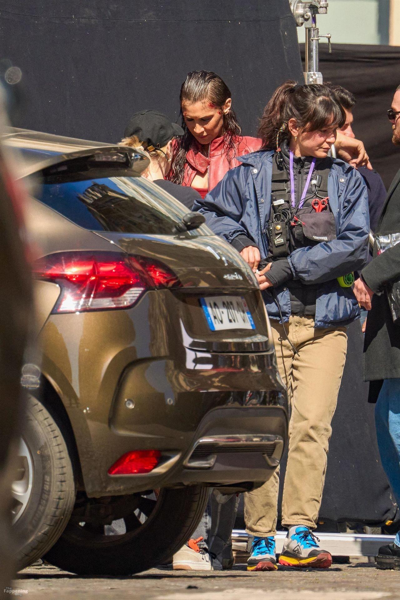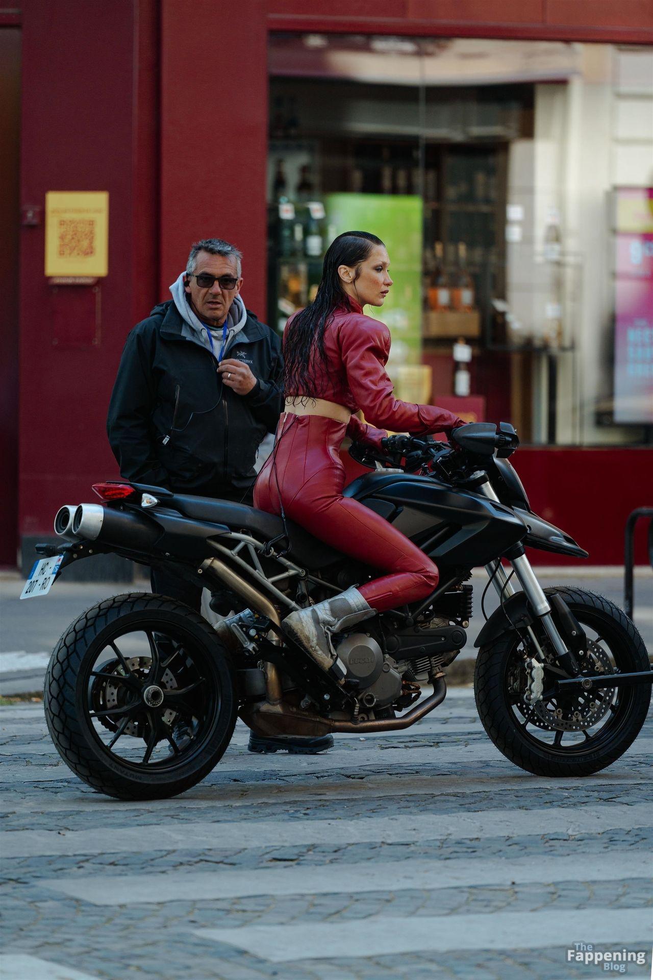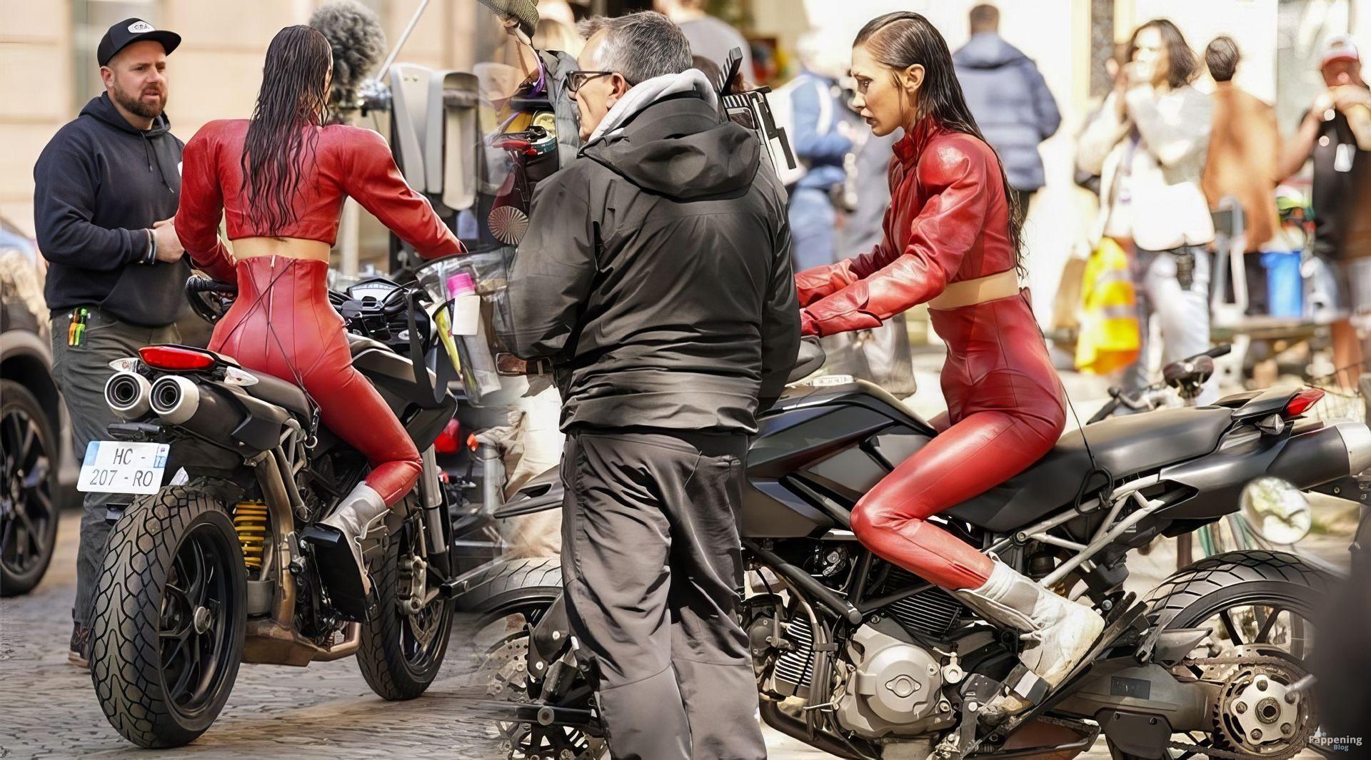 Bella Hadid a été photographiée à Paris, arborant une combinaison en cuir rouge flamboyant et chevauchant une moto. Après cette folle cascade avec un mannequin, elle joue les dures avec une vilaine blessure à la jambe pour une scène de la série « The Beauty » à Paris, France.