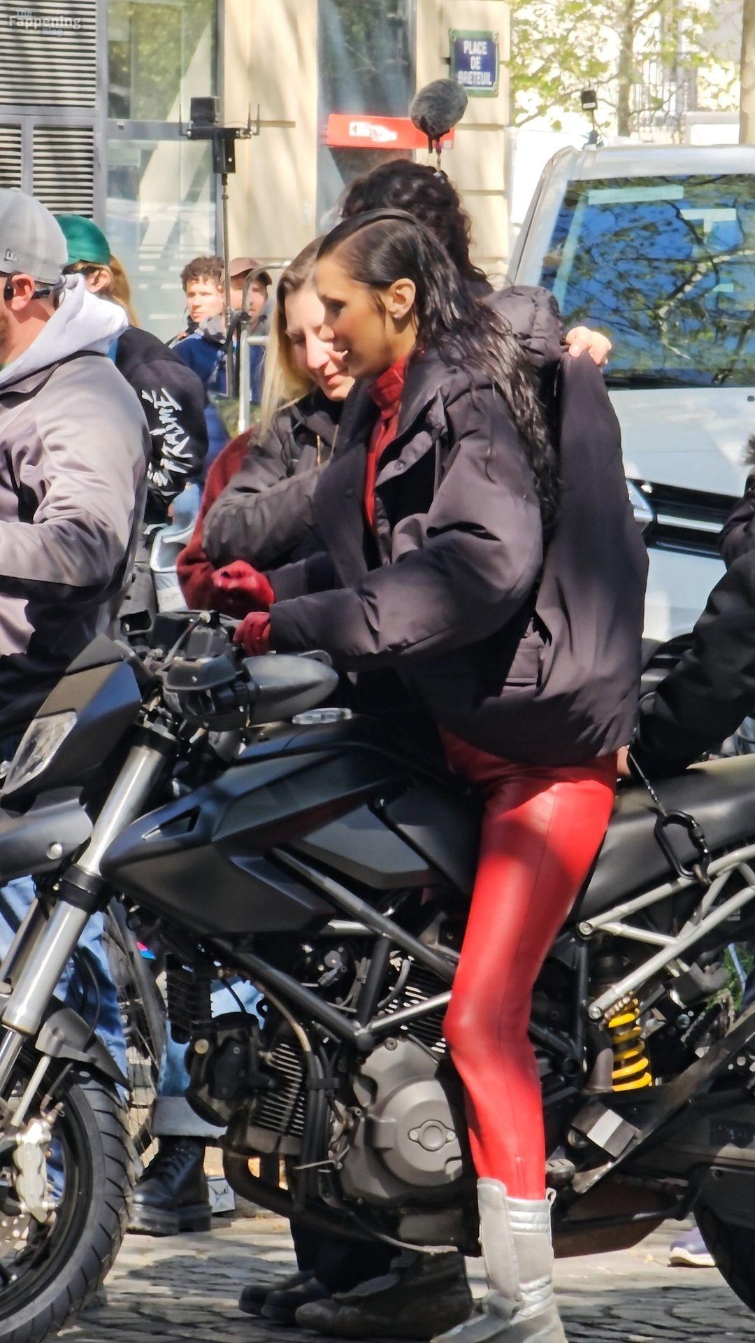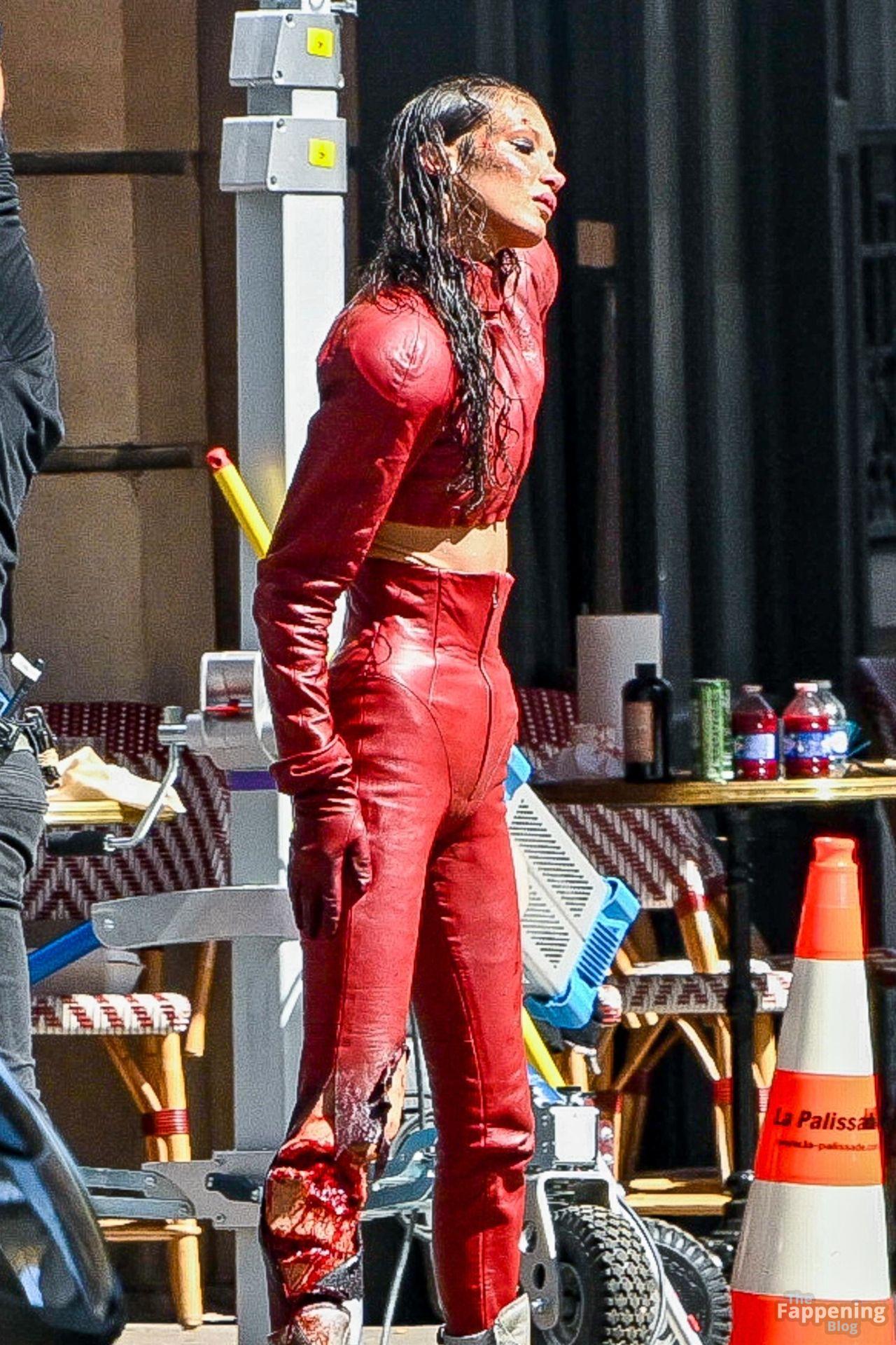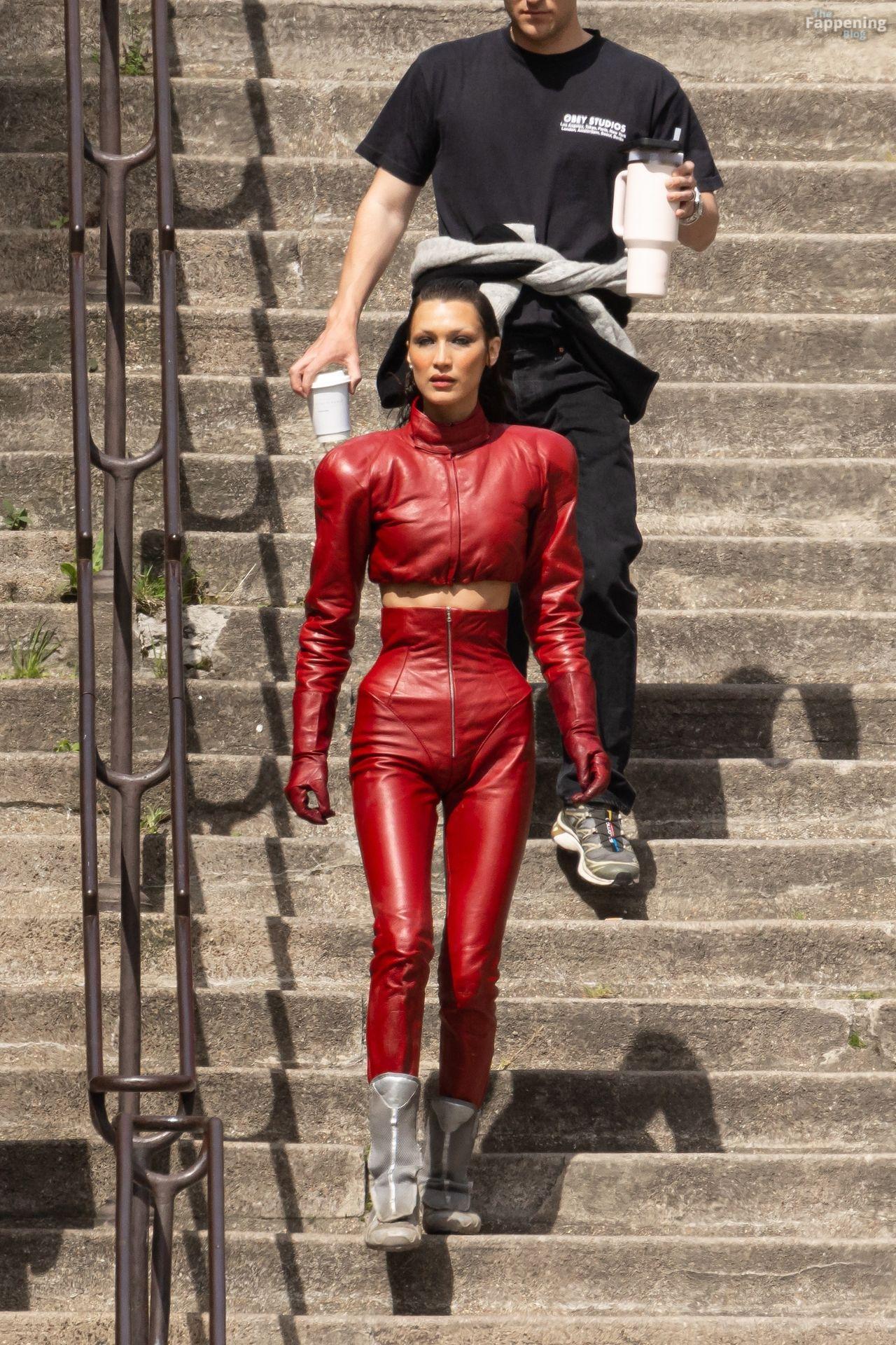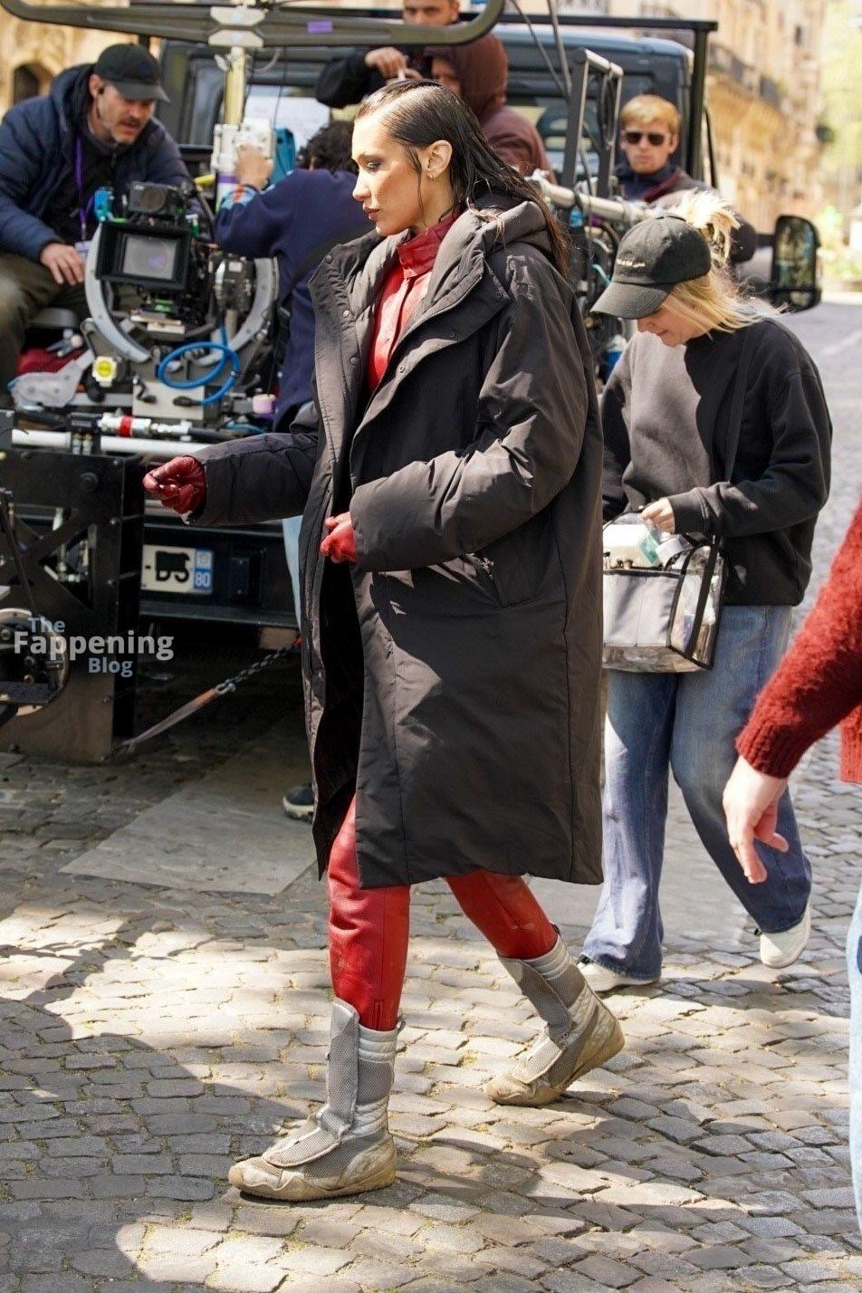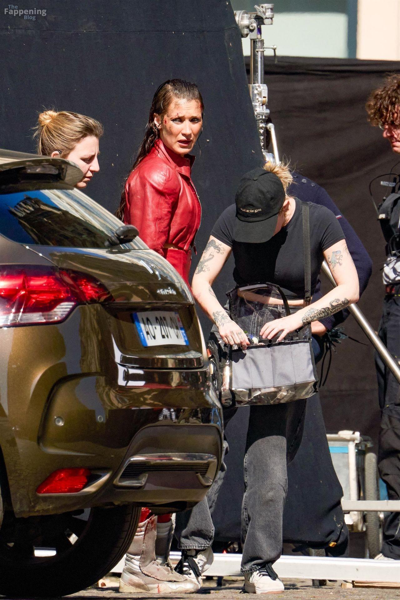 Bella Hadid a été photographiée à Paris, arborant une combinaison en cuir rouge flamboyant et chevauchant une moto. Après cette folle cascade avec un mannequin, elle joue les dures avec une vilaine blessure à la jambe pour une scène de la série « The Beauty » à Paris, France.