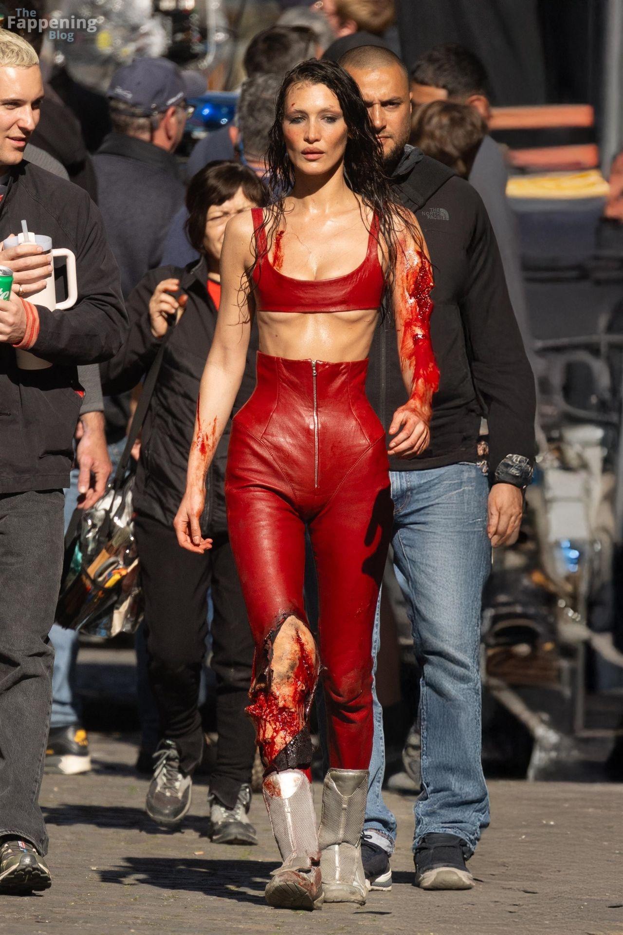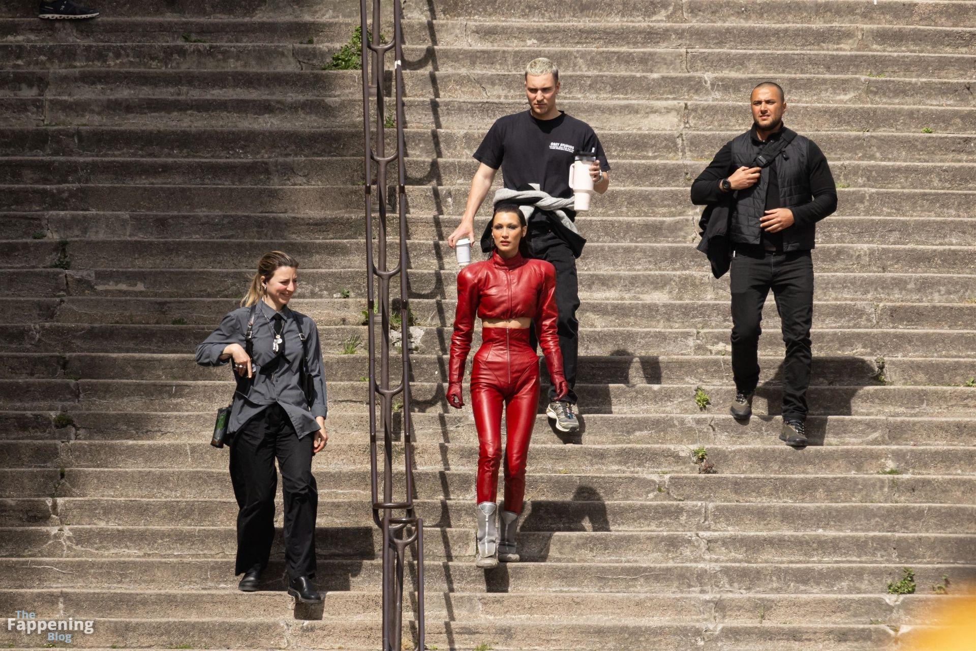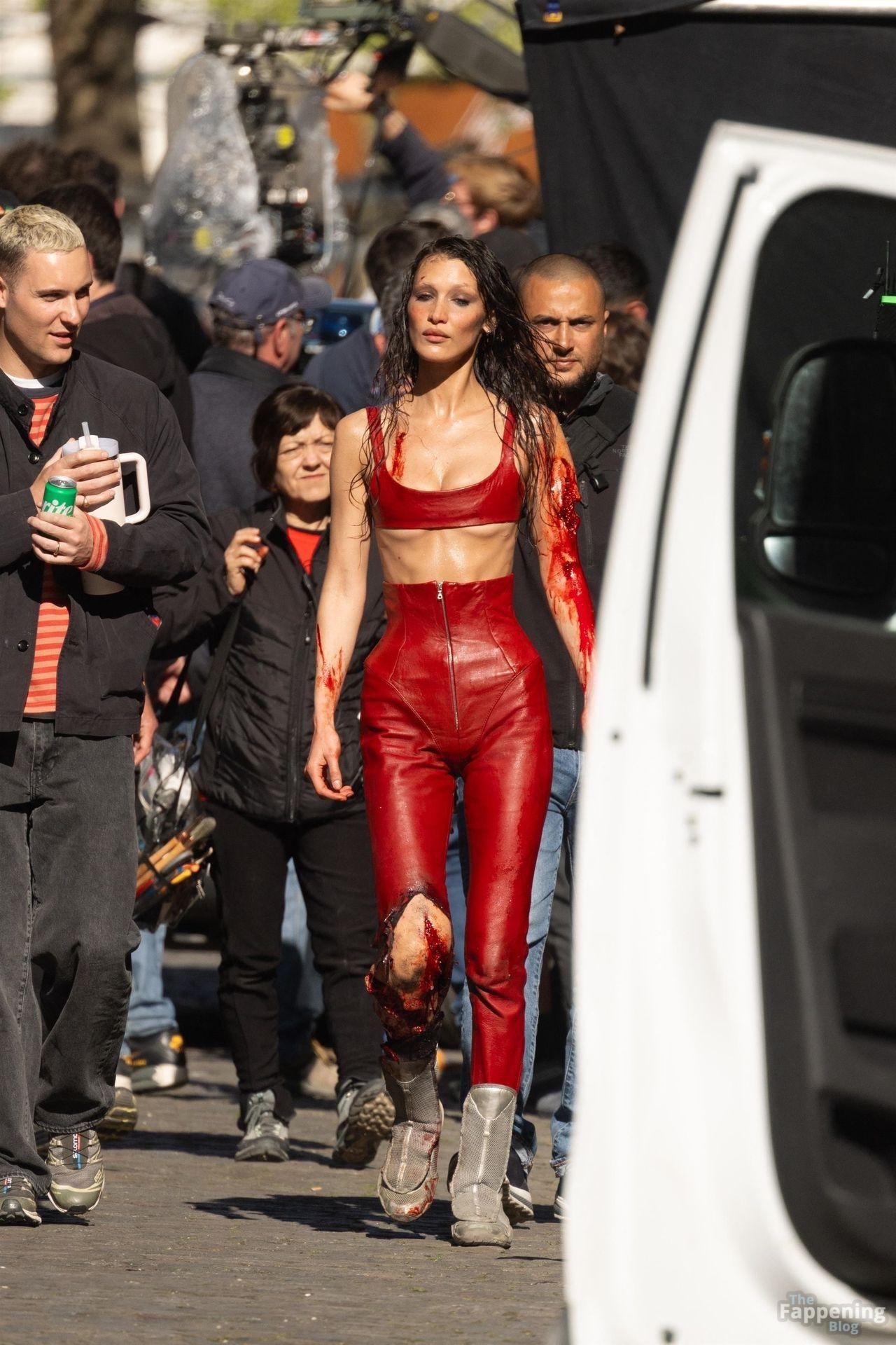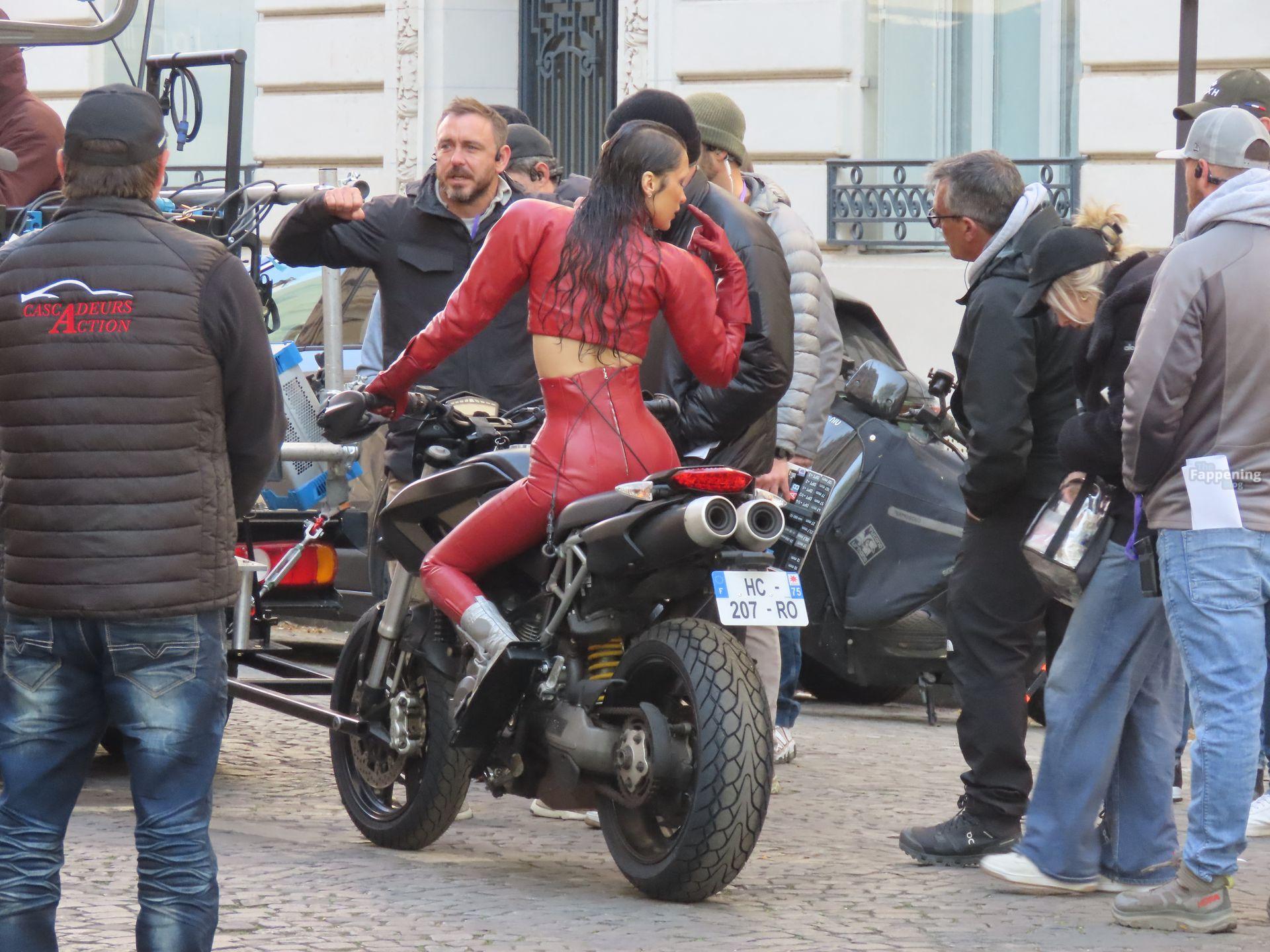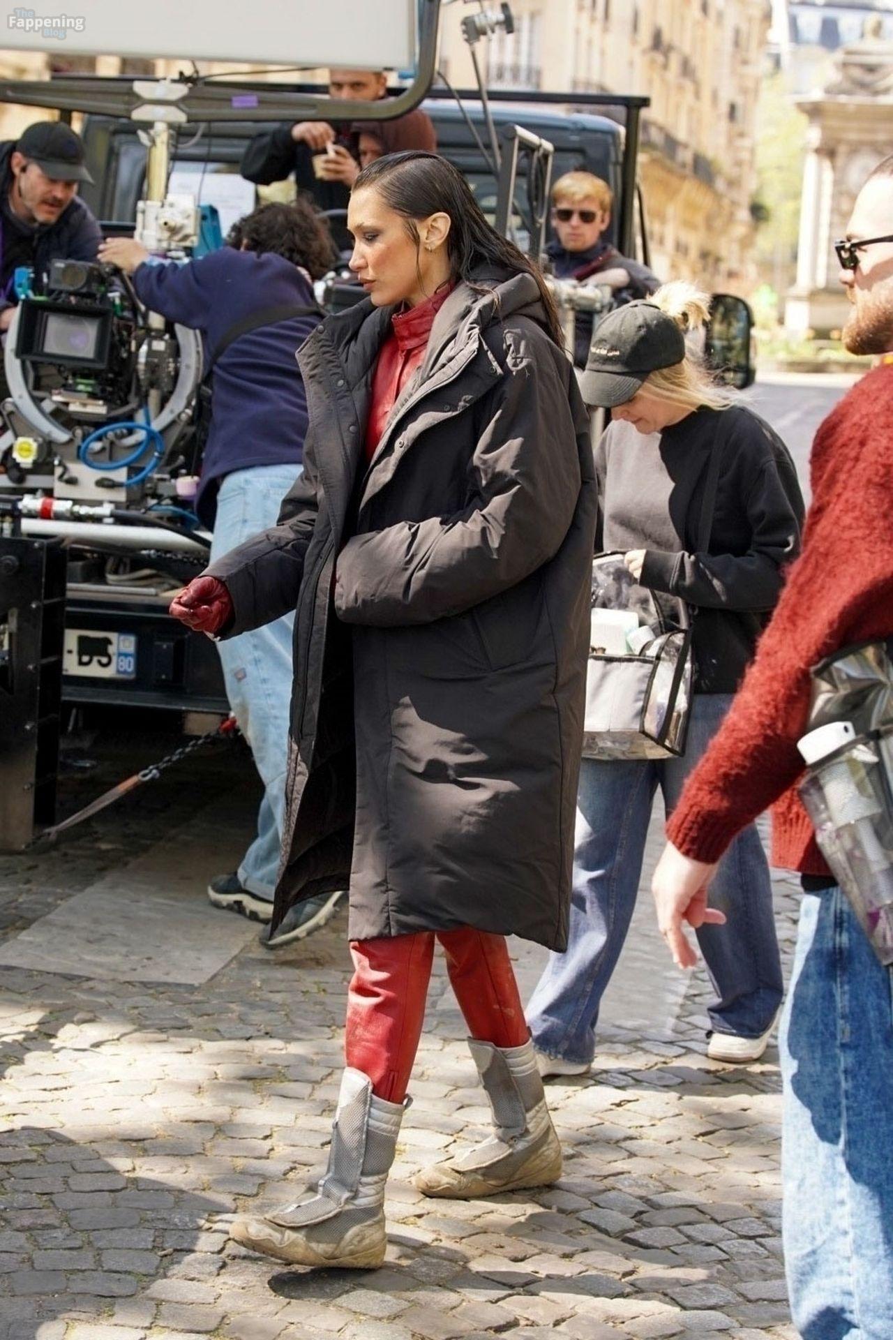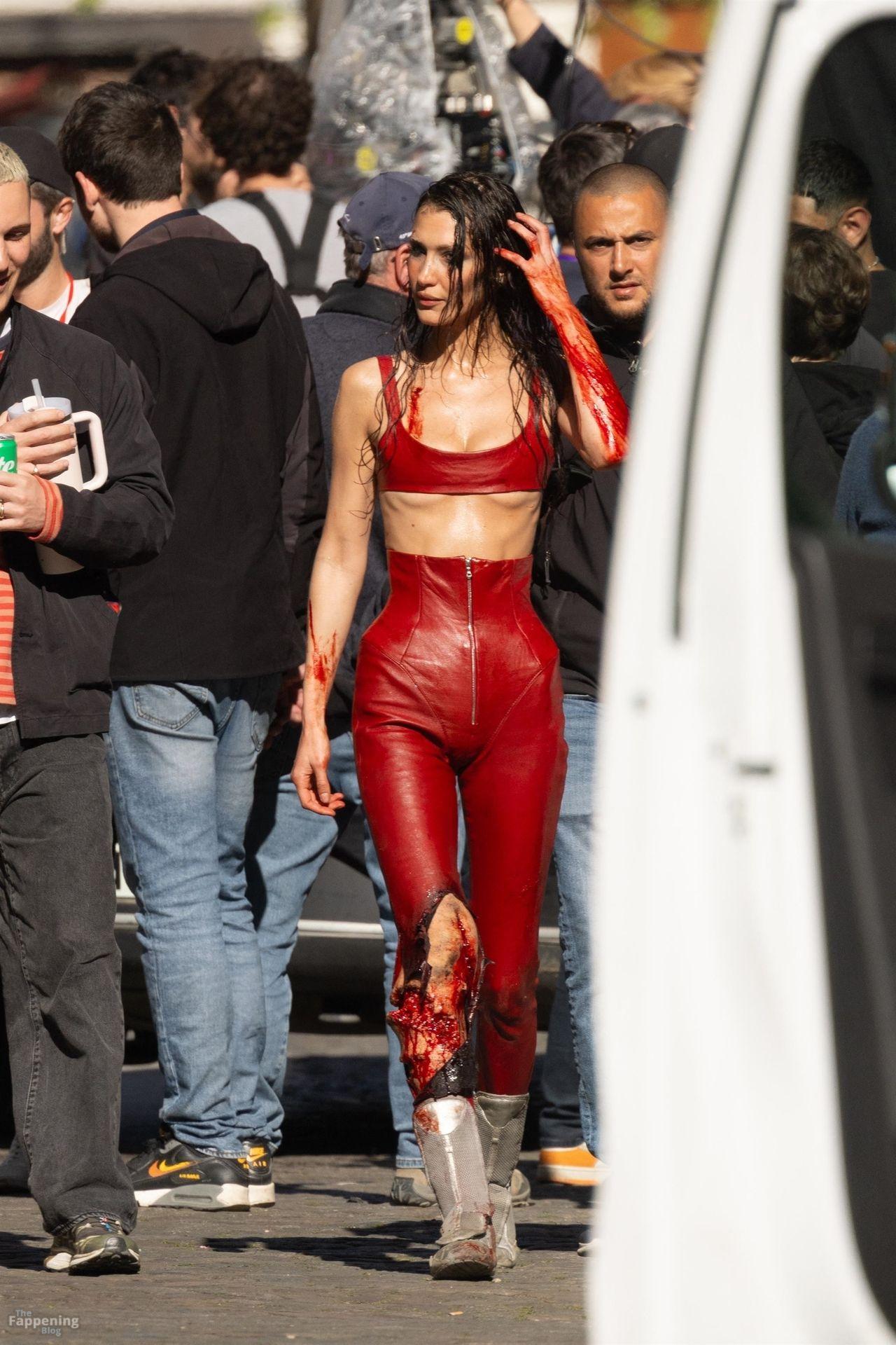Bella Hadid a été photographiée à Paris, arborant une combinaison en cuir rouge flamboyant et chevauchant une moto. Après cette folle cascade avec un mannequin, elle joue les dures avec une vilaine blessure à la jambe pour une scène de la série « The Beauty » à Paris, France.