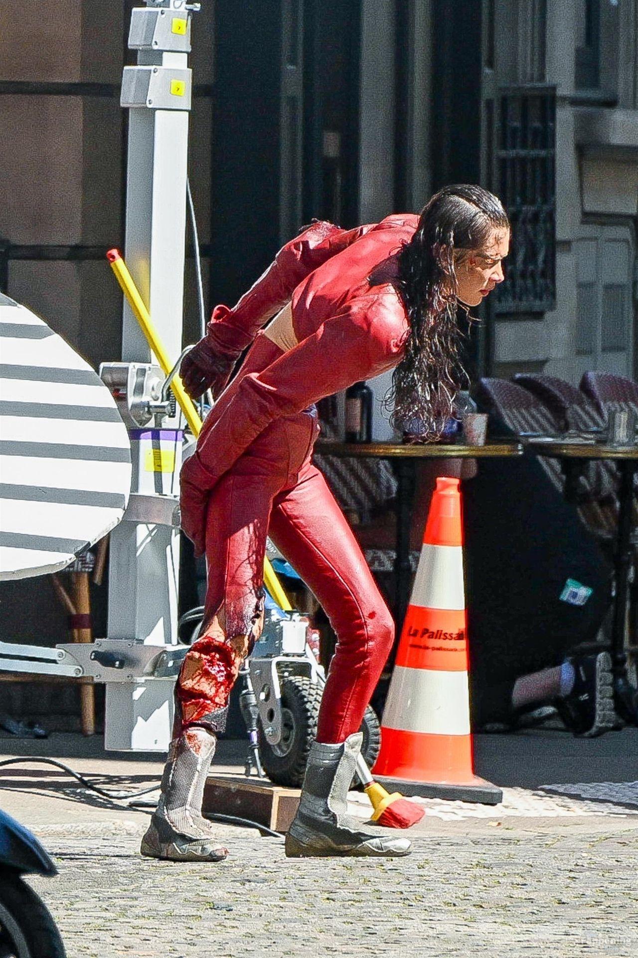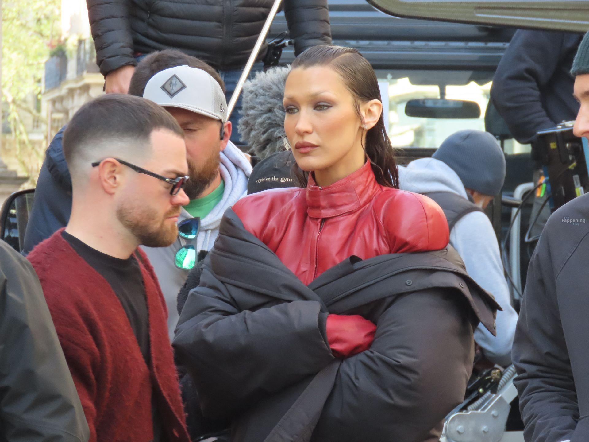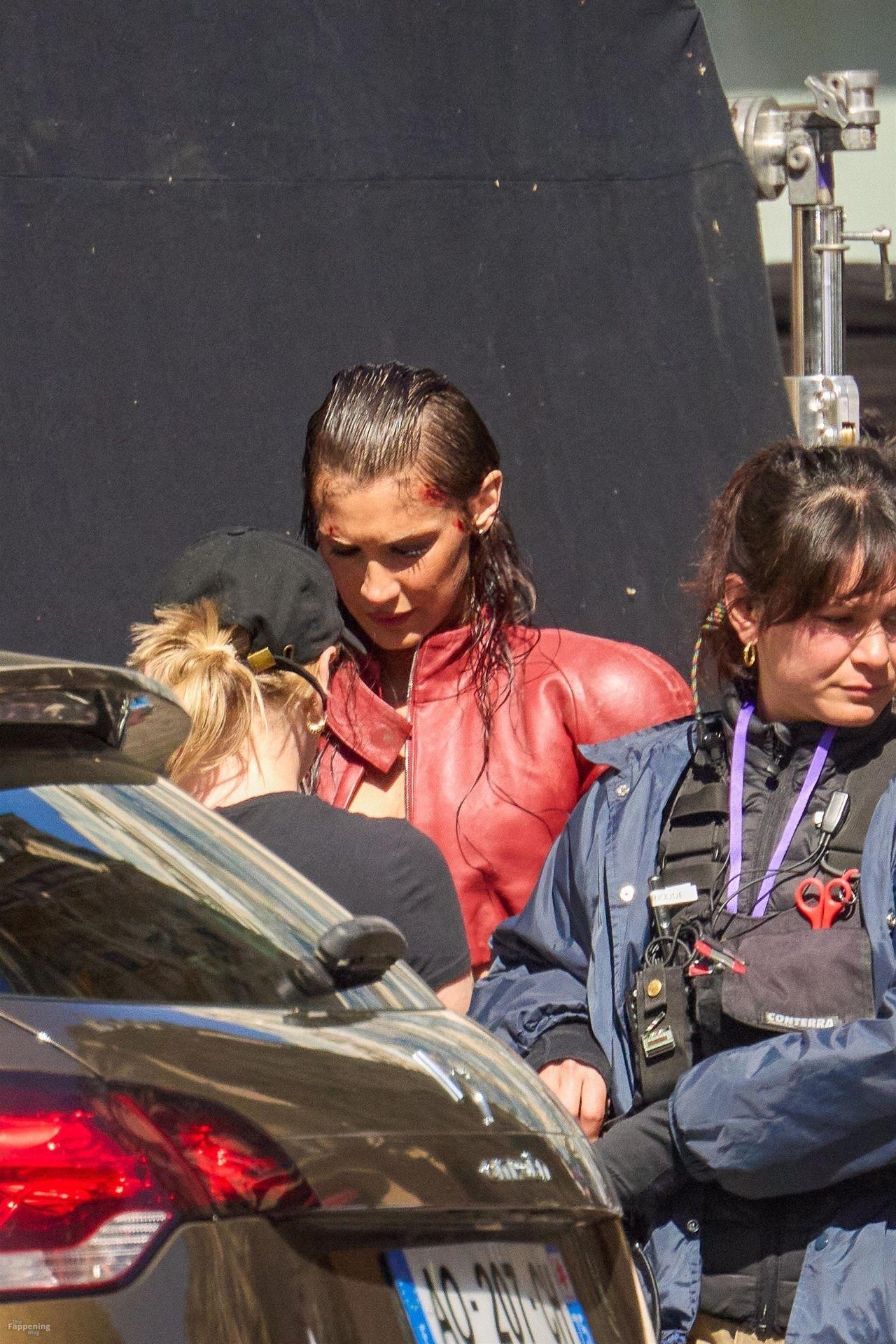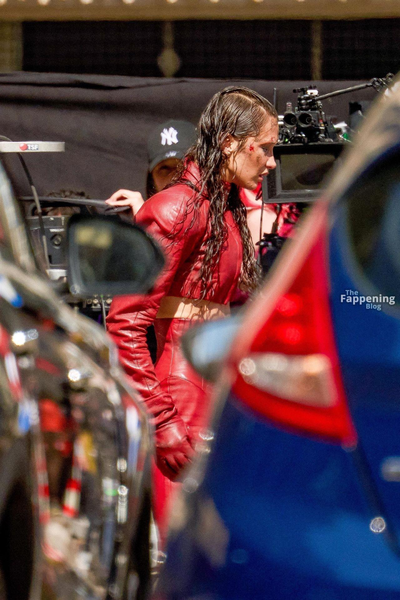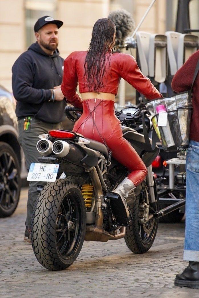 Bella Hadid a été photographiée à Paris, arborant une combinaison en cuir rouge flamboyant et chevauchant une moto. Après cette folle cascade avec un mannequin, elle joue les dures avec une vilaine blessure à la jambe pour une scène de la série « The Beauty » à Paris, France.