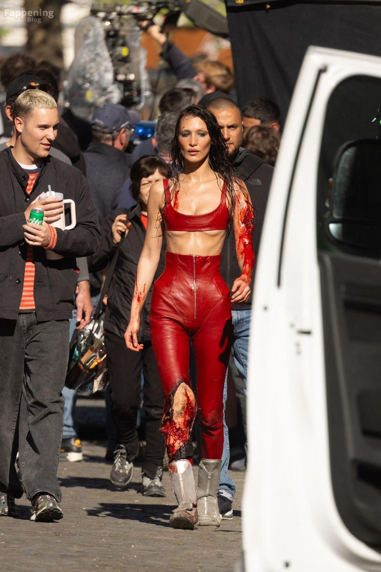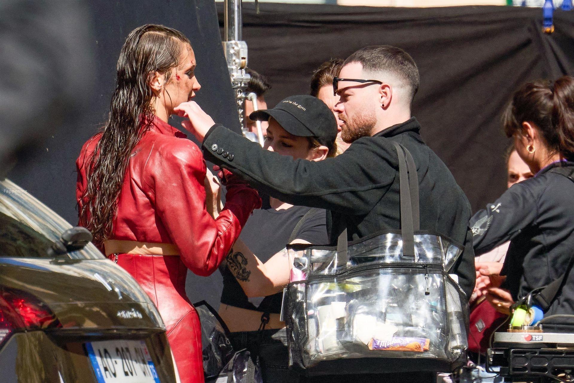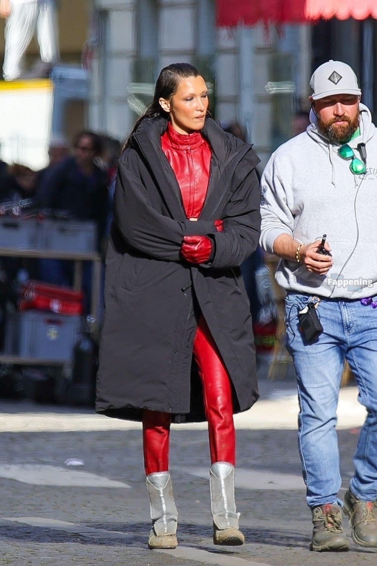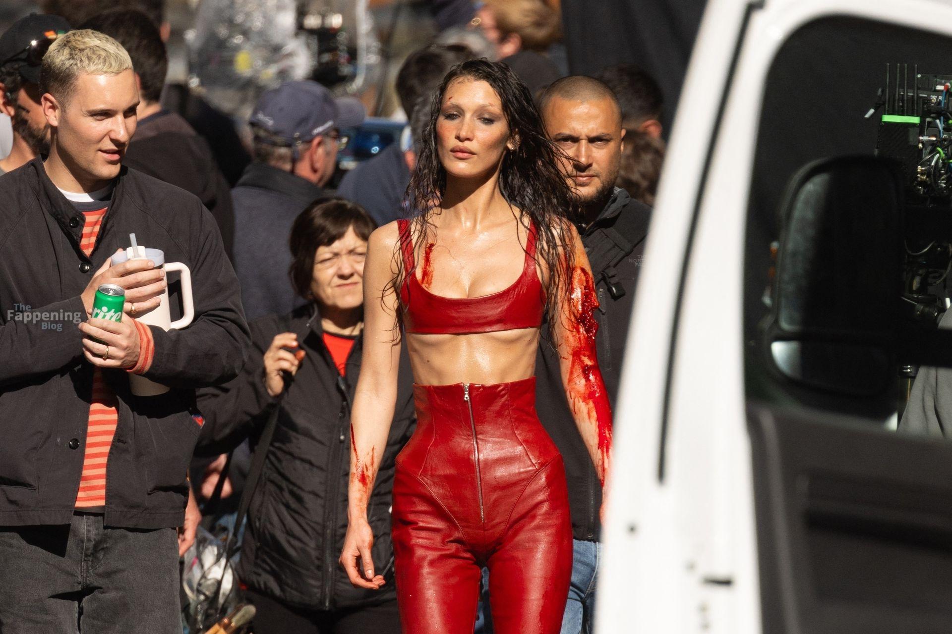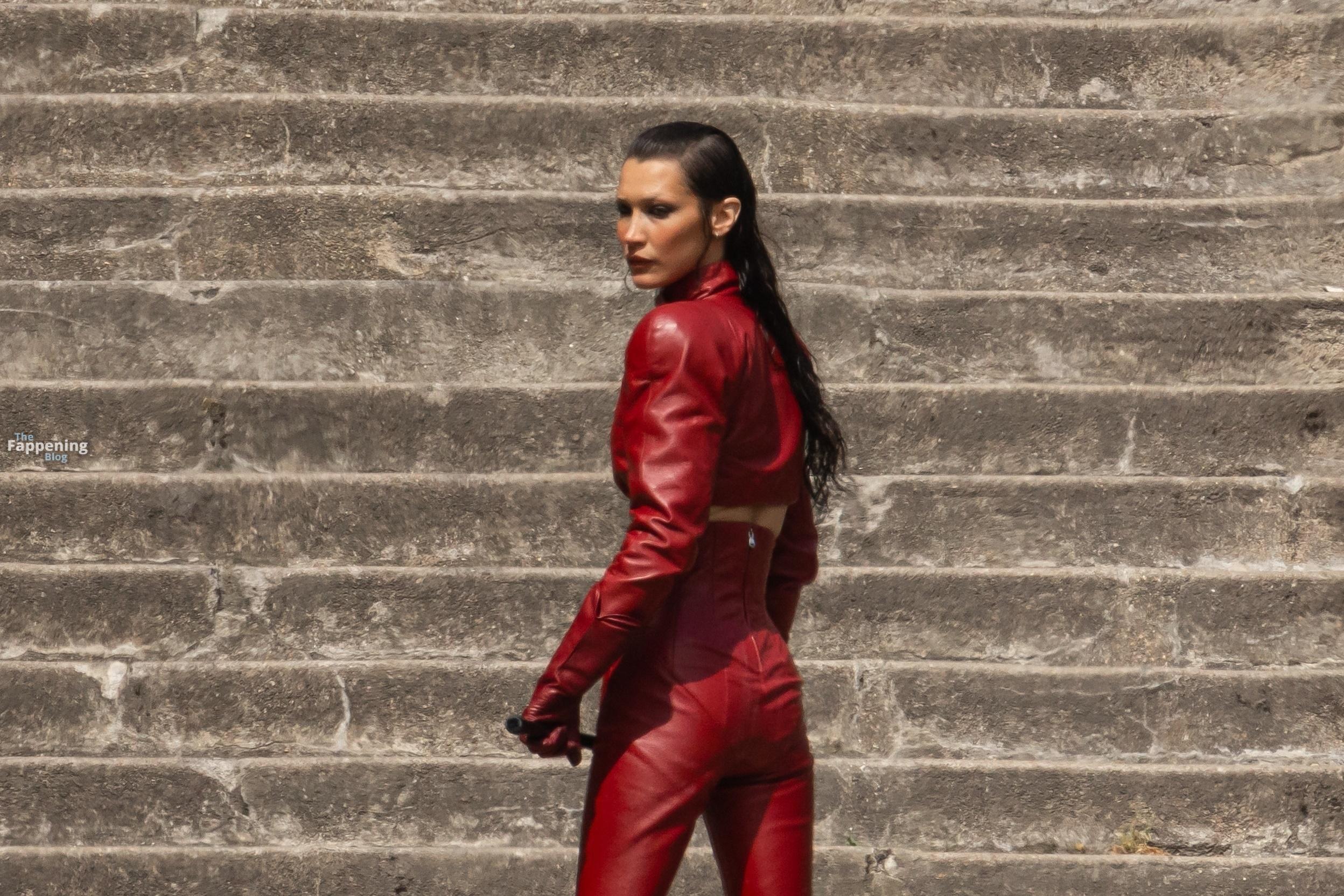 Bella Hadid a été photographiée à Paris, arborant une combinaison en cuir rouge flamboyant et chevauchant une moto. Après cette folle cascade avec un mannequin, elle joue les dures avec une vilaine blessure à la jambe pour une scène de la série « The Beauty » à Paris, France.