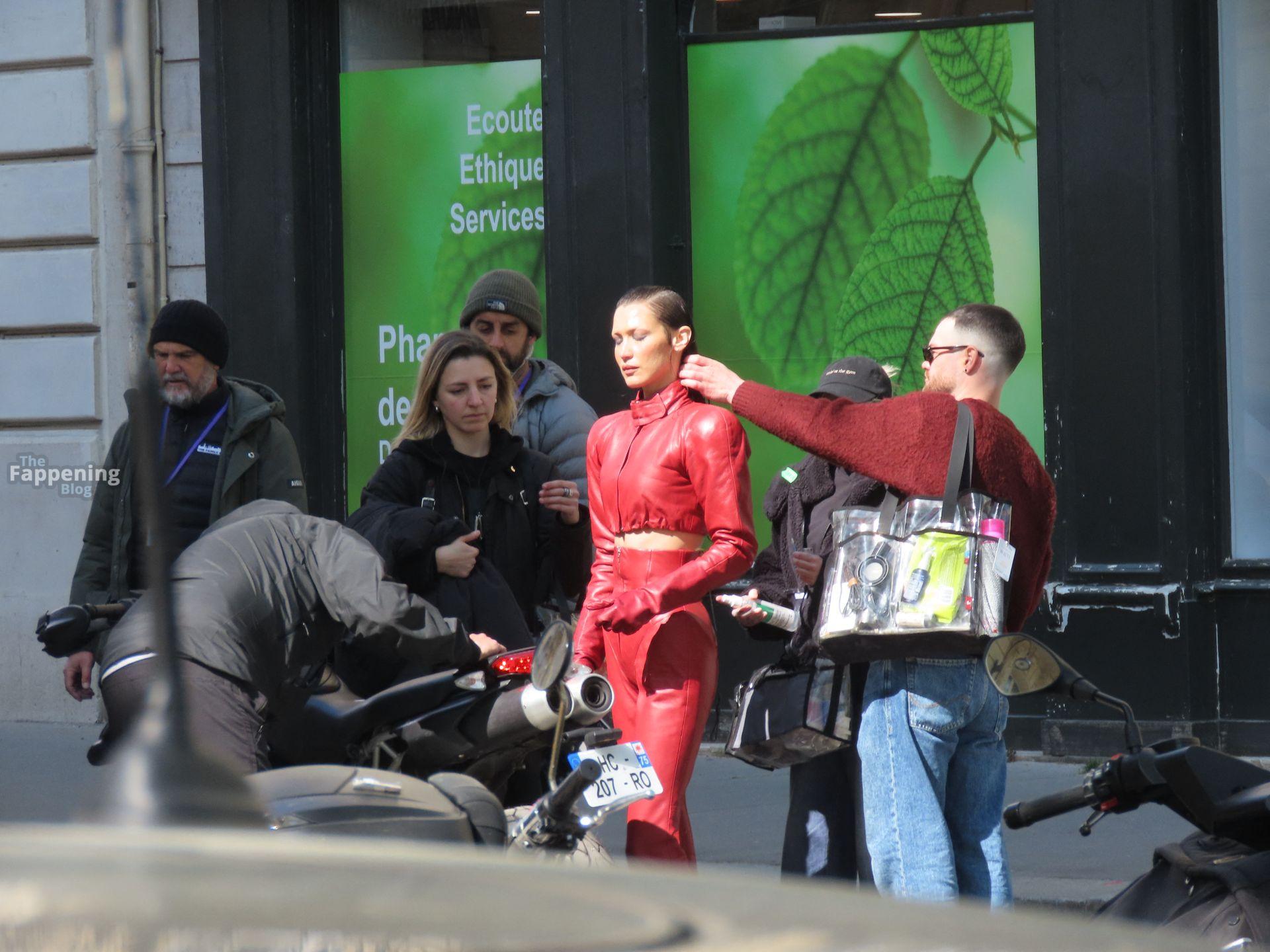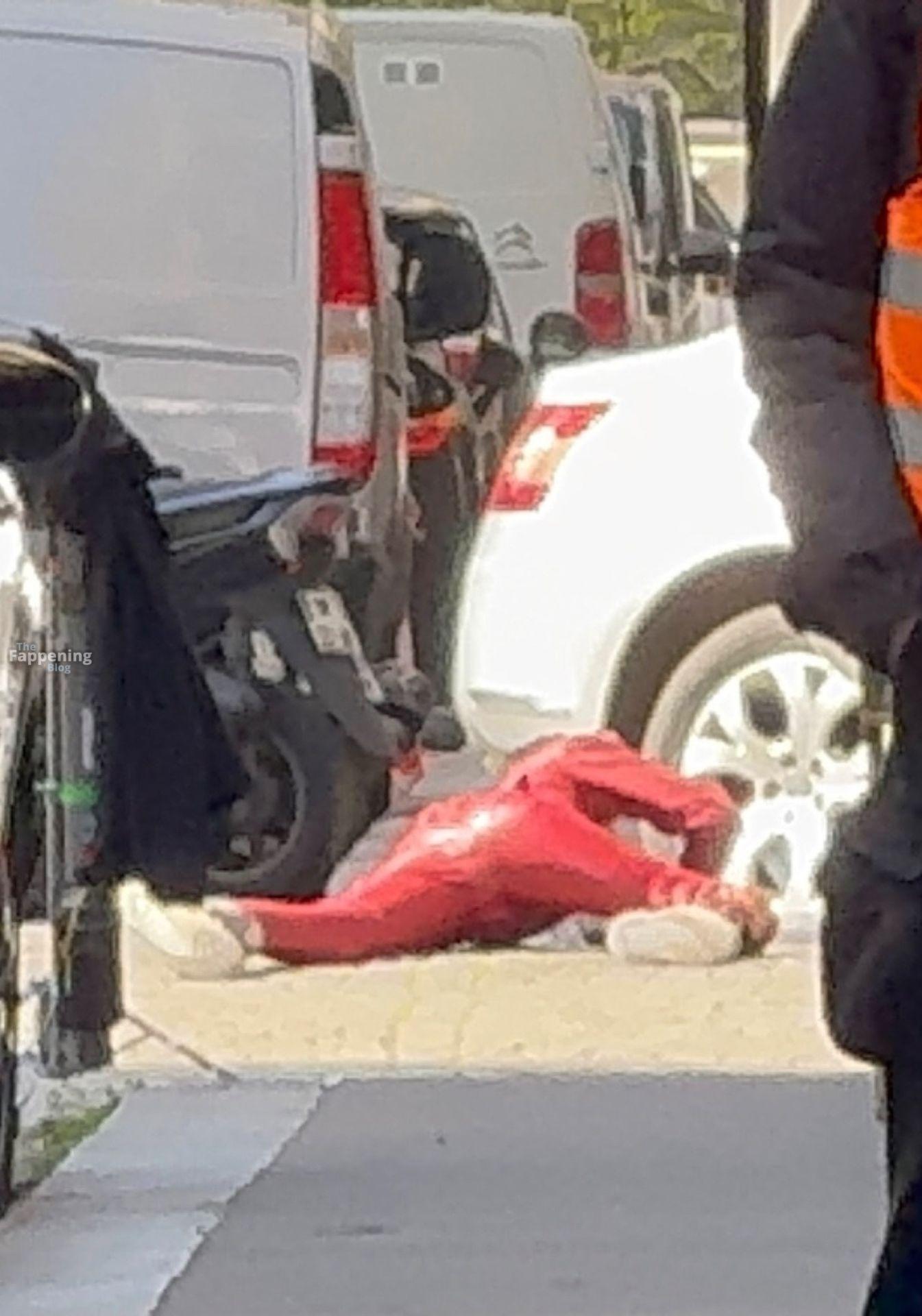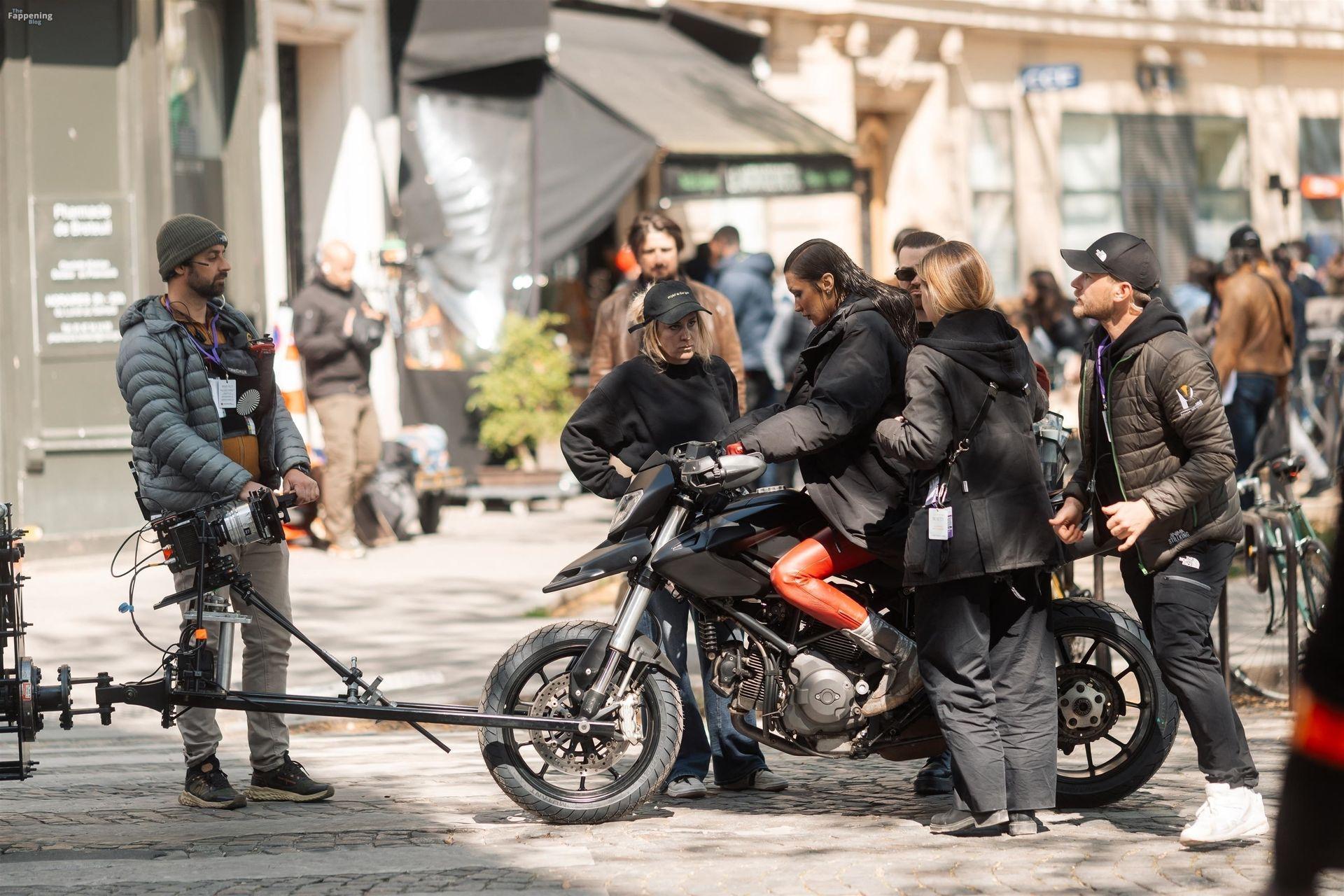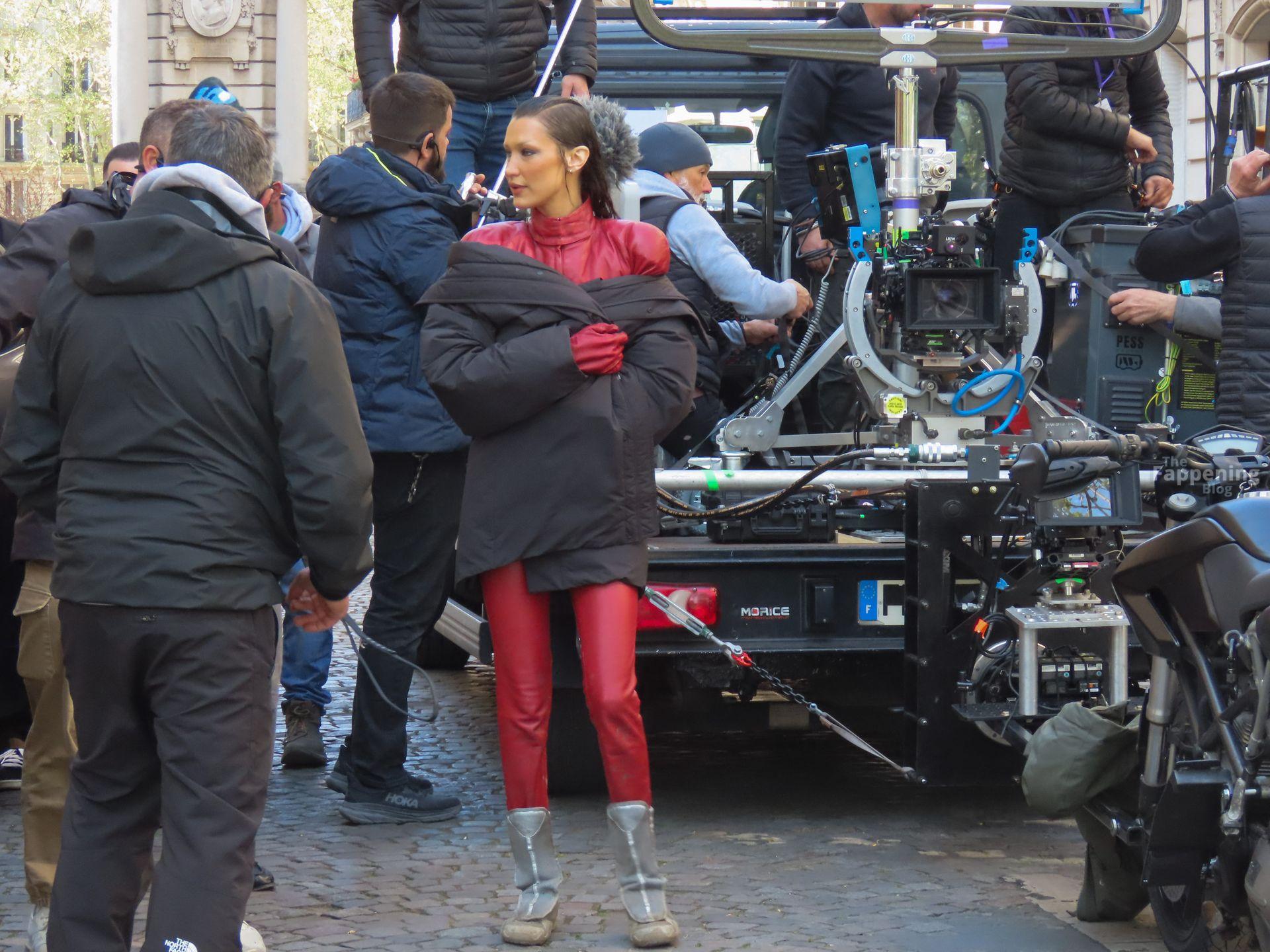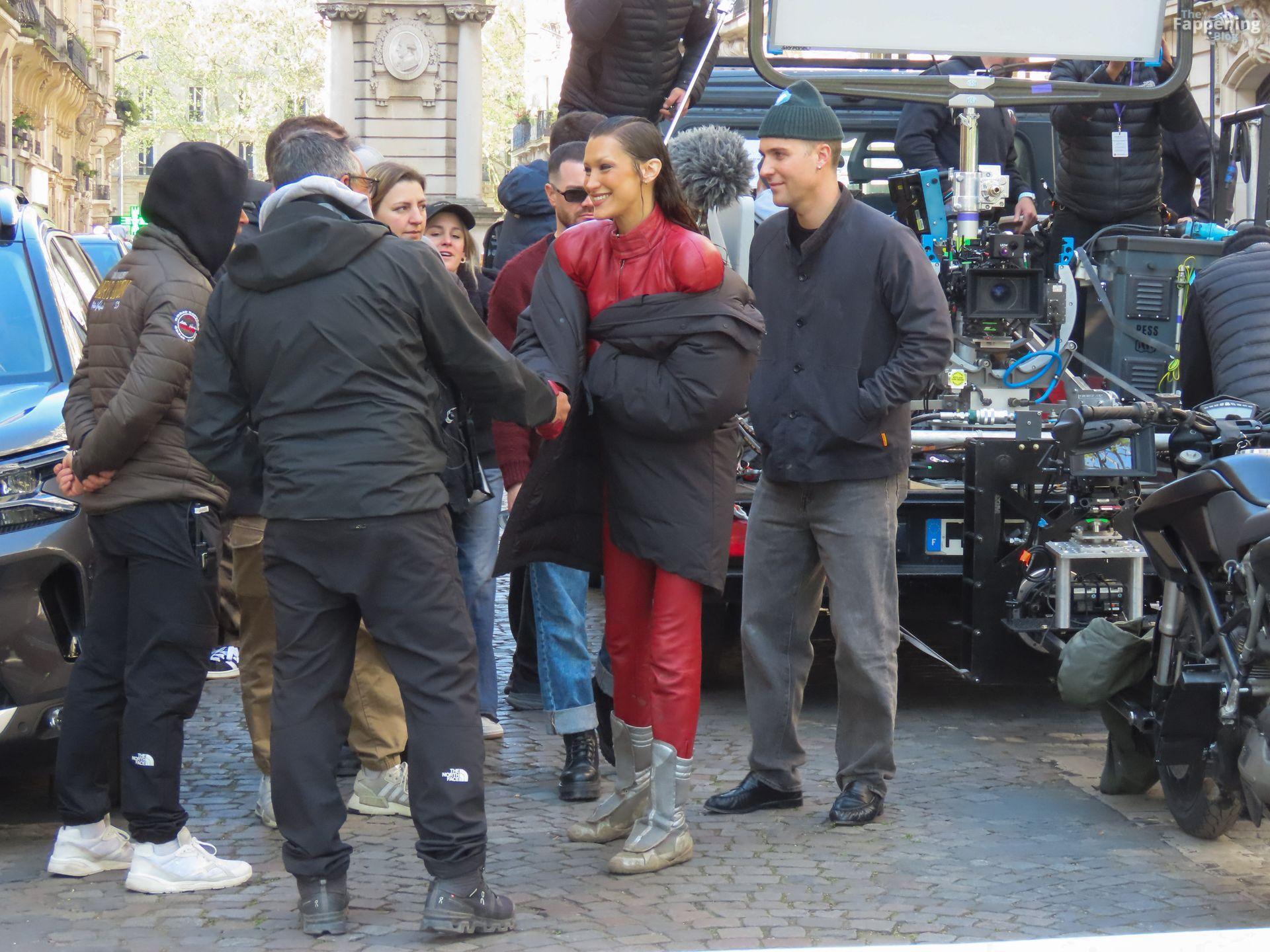 Bella Hadid a été photographiée à Paris, arborant une combinaison en cuir rouge flamboyant et chevauchant une moto. Après cette folle cascade avec un mannequin, elle joue les dures avec une vilaine blessure à la jambe pour une scène de la série « The Beauty » à Paris, France.