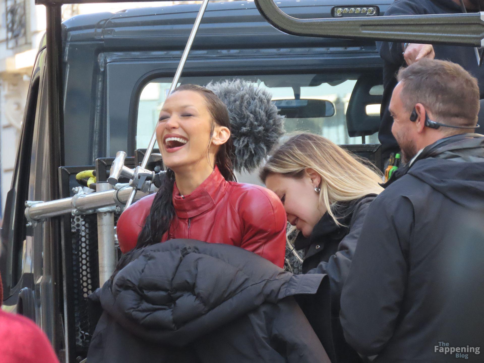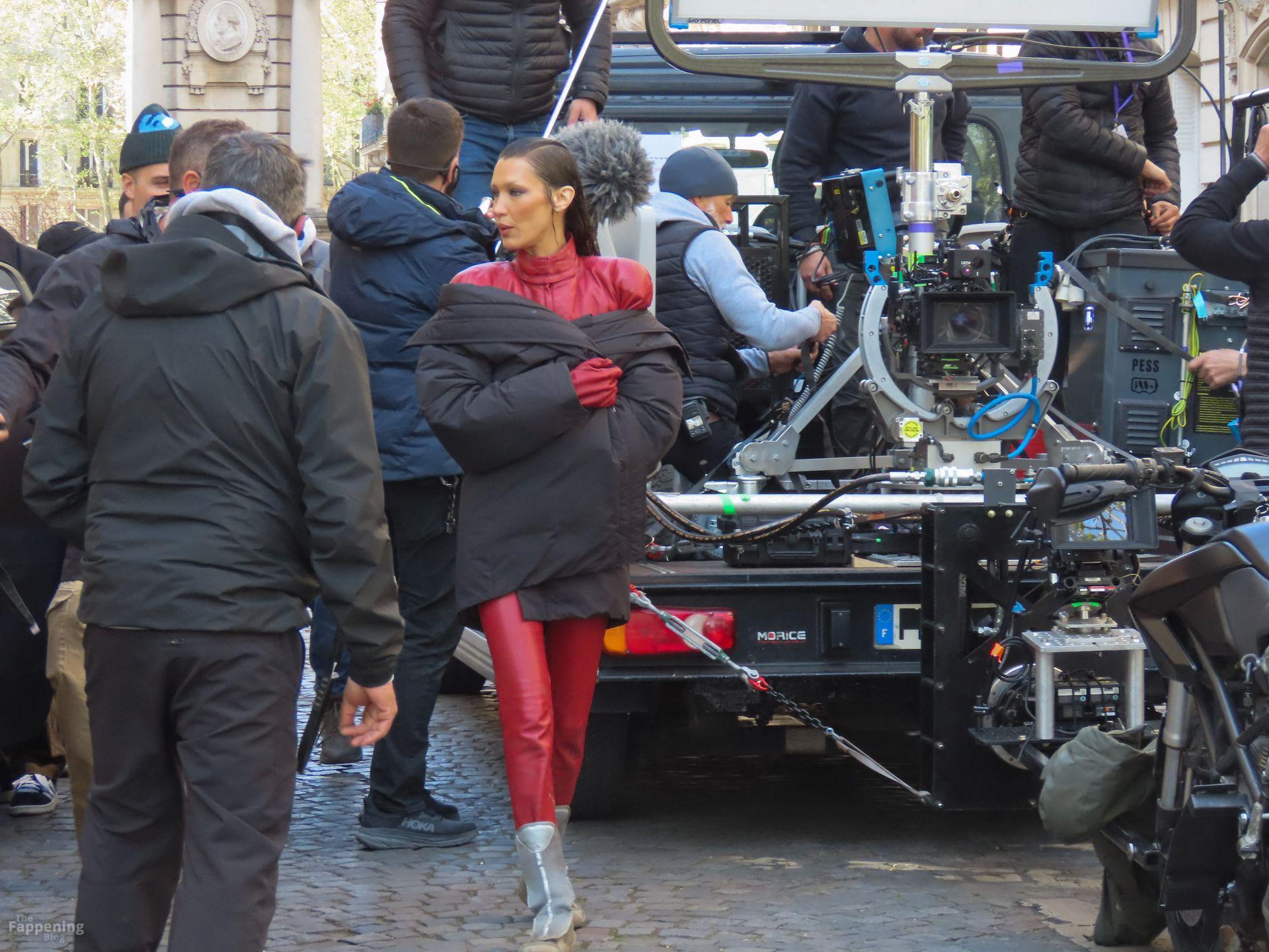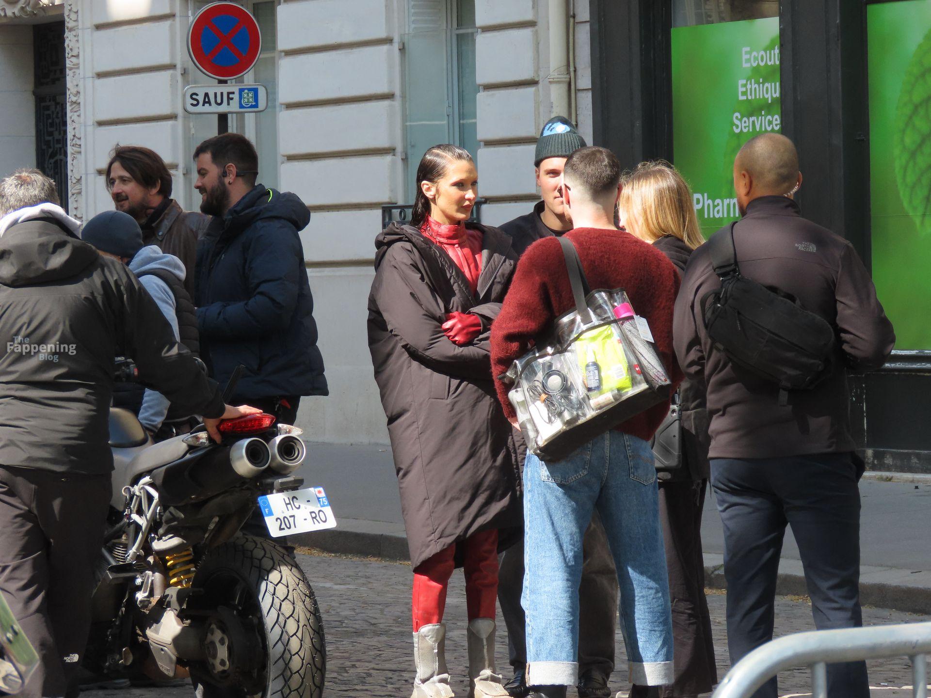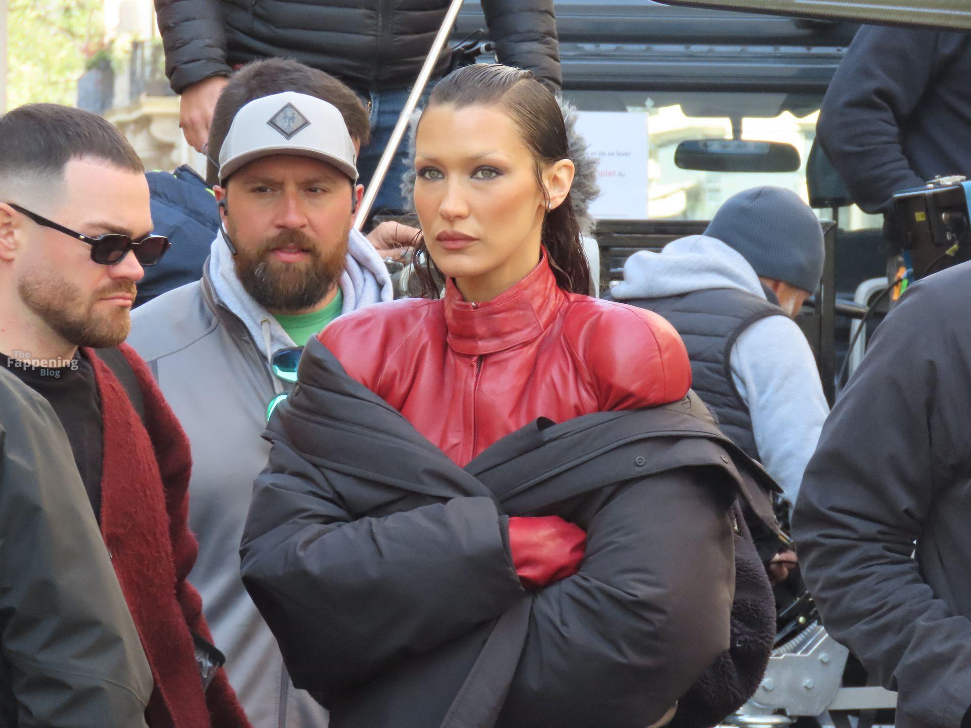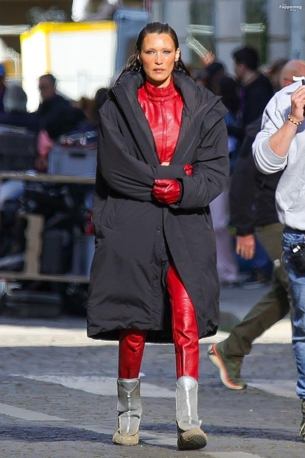 Bella Hadid a été photographiée à Paris, arborant une combinaison en cuir rouge flamboyant et chevauchant une moto. Après cette folle cascade avec un mannequin, elle joue les dures avec une vilaine blessure à la jambe pour une scène de la série « The Beauty » à Paris, France.
