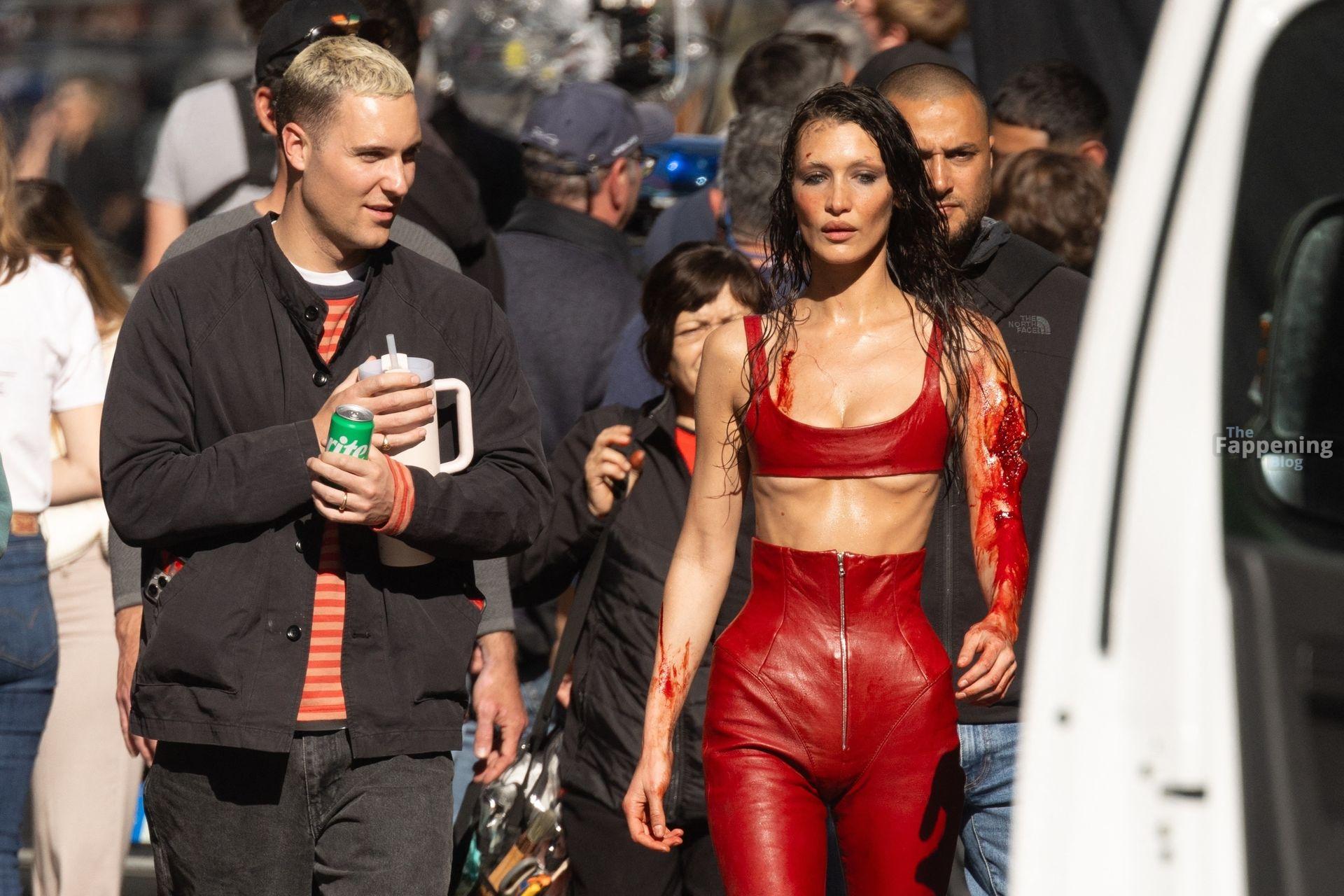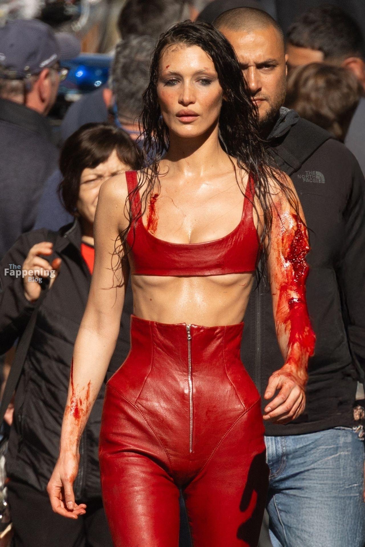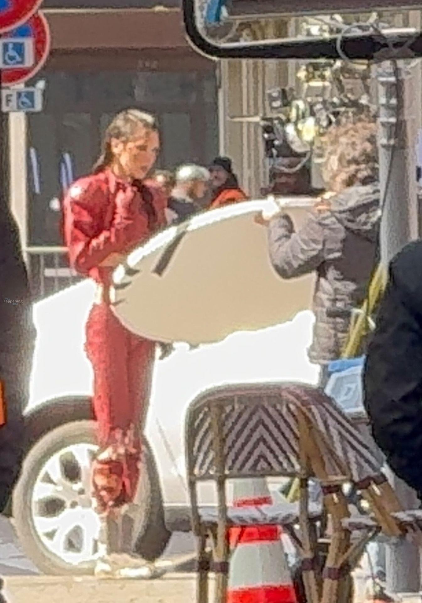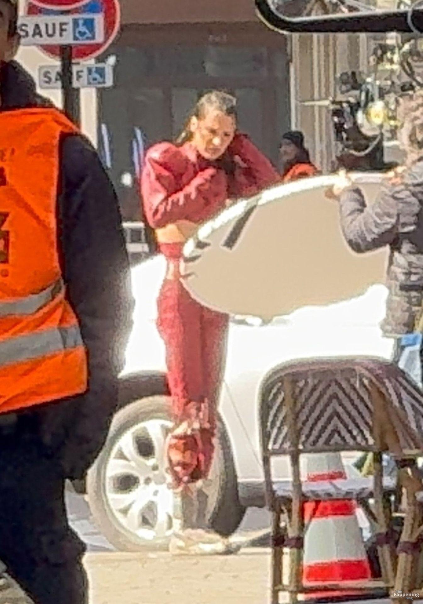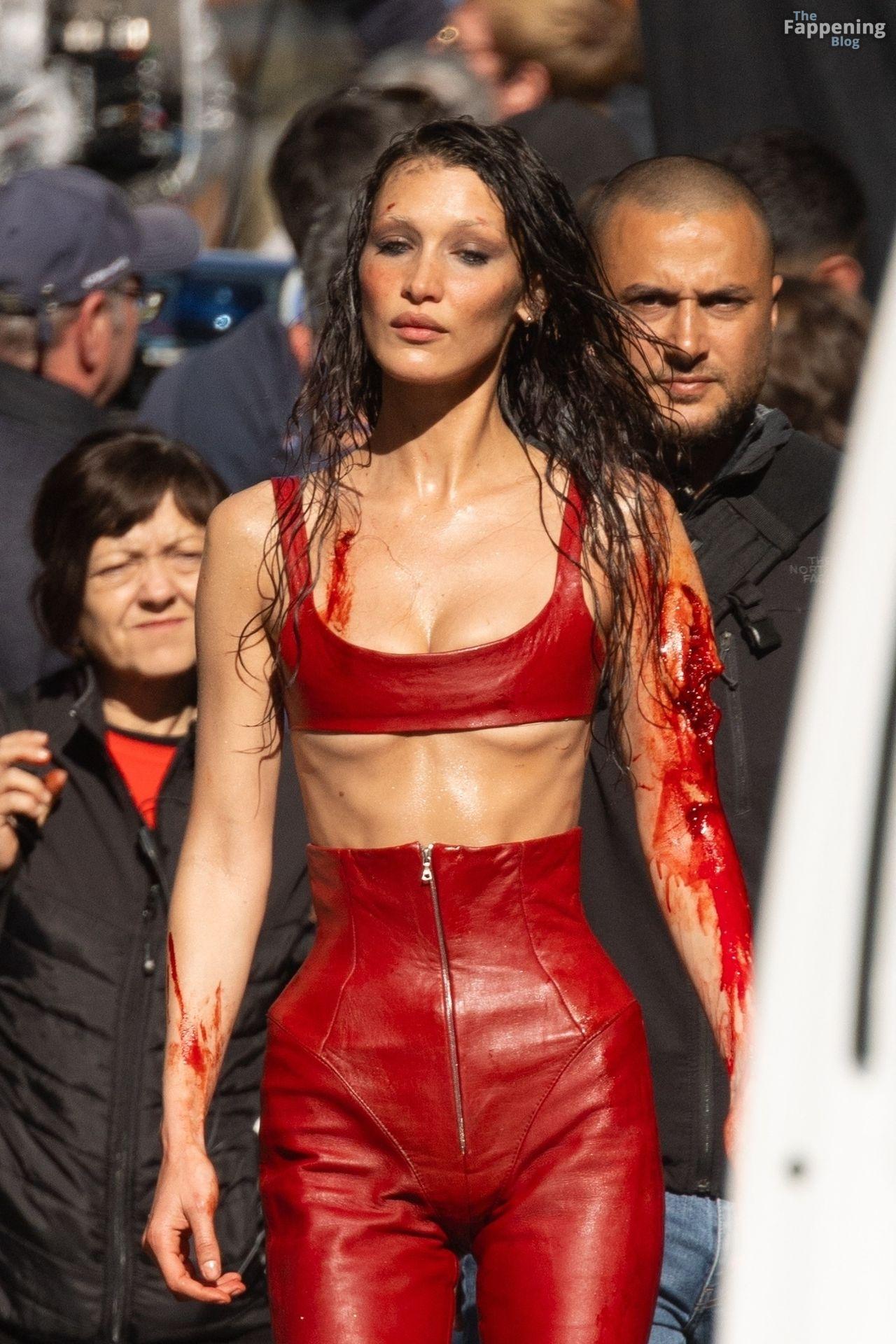 Bella Hadid a été photographiée à Paris, arborant une combinaison en cuir rouge flamboyant et chevauchant une moto. Après cette folle cascade avec un mannequin, elle joue les dures avec une vilaine blessure à la jambe pour une scène de la série « The Beauty » à Paris, France.